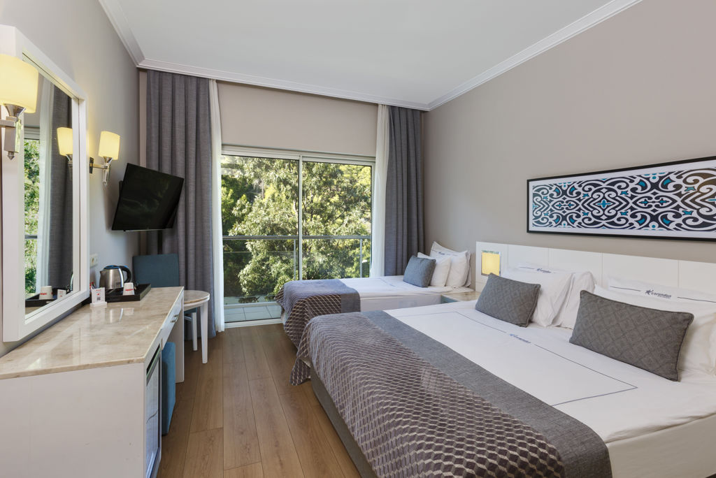 30 m² * Bestaat uit 1 ruimte * Gelegen in het bijgebouw * Dezelfde faciliteiten als de standaardkamer * Familiekamer (3-4 personen) * Ca. 32-40 m² * Dezelfde faciliteiten als de standaardkamer * Bestaat uit 2 ruimtes * Frans balkon * De familiekamers bevinden zich in de bijgebouw, hier is geen lift aanwezig Sport & Ontspanning * Fitness * Tafeltennis * Darts * Beachvolleybal * Basketbal * Duikcenter* * Watersporten aan het strand* * Sauna * Turks bad * Binnenzwembad (verwarmd in de winterperiode) * Massages en schoonheidsbehandelingen* * Dagelijks entertainment *Tegen betaling Kinderfaciliteiten * 1 kinderzwembad * Miniclub (4-12 jaar) * Minidisco * Speeltuin * Babybedje * Babysitservice (op aanvraag en tegen betaling) Zwembaden * 1 buitenzwembad * 1 buitenzwembad met glijbanen (op vaste tijden geopend) * 1 binnenzwembad (verwarmd van 01-04 tot 01-05 en van 01-10 tot 15-11) * Zonneterras * Privéstrand met pier (geopend vanaf 20-04) * Ligbedden, matrasjes en parasols gratis (zwembad en strand) * Cabana op het strand (tegen betaling) * Gratis badhanddoekenservice Verzorging Zomer: Corendon Playa Kemer * Verblijf o.b.v. Ultra All Inclusive: * Ontbijt in buffetvorm (07.00-10.00 uur) * Laat ontbijt in buffetvorm (10.00-11.00 uur) * Lunch in buffetvorm (12.30-14.30 uur) * Diner in buffetvorm (18.30-21.30 uur) * Snacks (11.00-23.00) * Verpakt ijs (24/7) * Schep ijs (10.00-00.00) * Koffie/thee met koekjes/patisserie (10.00-00.00 uur) * Middernachtsnack (00.00-07.00 uur) * Geselecteerde lokale (non-)alcoholische dranken, verse vruchtensappen (verse sinaasappelsap bij het ontbijt is gratis) en een selectie import dranken (24/7) (Lobby - en Courtbar zijn 24 uur geopend. Servicebar van 12.30-14.00 uur & 18.30-21.00 uur, Poolbar van 10.00-00.00 uur, Pierbar van 10.00-01.00 uur en Discotheek 23.30-02.00 uur.) * Tegen betaling: overige import drankjes, verse vruchtensappen, drankjes uit flessen en de 2 à-la-carterestaurants (vooraf reserveren) Verzorging Winter: Corendon Playa Kemer * Verblijf o.b.v.