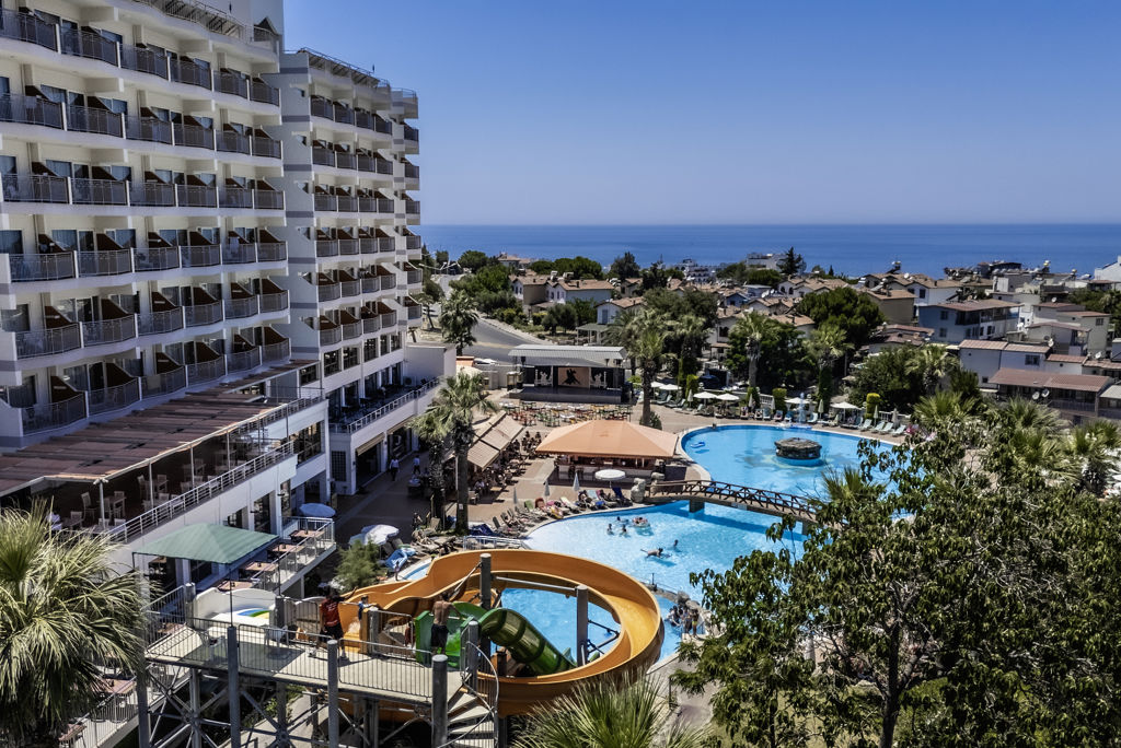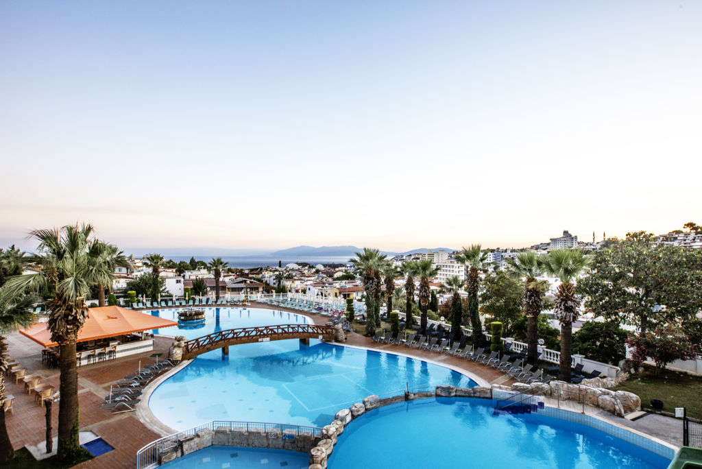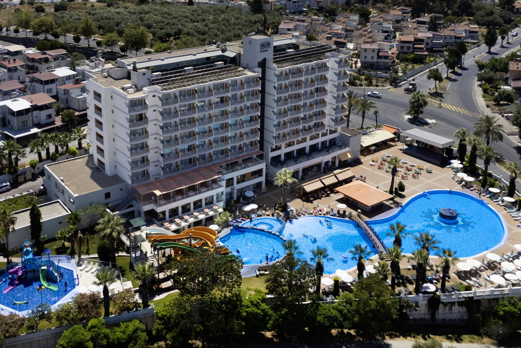 * Ligging * Gelegen op een heuvel * Openbaar strand Ladies Beach op circa 800 meter * Centrum van Kusadasi op circa 2 kilometer * Dichtstbijzijnde winkel op circa 100 meter * Dichtstbijzijnde restaurant op circa 500 meter * Dichtstbijzijnde bar op circa 500 meter * Shuttleservice naar het strand gratis * Bushalte (op loopafstand) * Algemeen & faciliteiten * 1 gebouw * Maximaal 10 verdiepingen * 156 kamers * Receptie * 24 uur per dag * Lobby * 2 liften * Bagageruimte * Wifi in alle openbare ruimtes * Meerdere winkels * Minimarkt * Wasservice tegen betaling * Doktersservice tegen betaling * Tuin * Openbare parkeergelegenheid * Privé parkeergelegenheid * Restaurants & bars * Buffetrestaurant * Snackbar * Roomservice tegen betaling * 2 drinkgelegenheden * Lobbybar * Poolbar * Activiteiten & ontspanning * Aerobics * Basketbal * Biljart * Boogschieten * Darts * Fitness * Tafeltennis * Voetbal * Volleybal * Yoga * Spafaciliteiten * Sauna * Hamam tegen betaling * Bubbelbad binnen * Massages tegen betaling * Schoonheidsbehandelingen tegen betaling * Gameroom * Animatie- * Shows * Eén keer per week * Livemuziek * Eén keer per week * Zwembaden * Buitenzwembad * 3 glijbanen * Buitenzwembad voor kinderen * Binnenzwembad * Zonneterras * Ligbedden * Parasol * Badhanddoekenservice * Kinderfaciliteiten * Mini club (4-12 jaar) * Minidisco * Buitenspeeltuin * BabybedjeHotelkamers * 2-persoonskamer Standaard DZ * Oppervlakte circa 24 m² * Woon-/slaapkamer * Slaapbank voor één persoon * Airconditioning * Kluisje tegen betaling * Televisie * Telefoon tegen betaling * Eet- en drinkfaciliteiten * Koffie- en theefaciliteiten * Minibar * Badkamer inloopdouche, toilet, föhn, badjassen en badslippers * Wifi * Balkon of terras (zitje) * 2-persoonskamer Standaard Stapelbed DZ1 * Oppervlakte circa 27 m² * Eén grote kamer met meerdere slaapplaatsen: tweepersoonsbed en stapelbed voor kinderen * Airconditioning * Kluisje tegen betaling * Televisie * Telefoon tegen betaling * Eet- en drinkfaciliteiten * Koffie- en theefaciliteiten * Minibar * Badkamer bad of douche, toilet, föhn, badjassen en badslippers * Wifi * Balkon of terras (zitje) * Familiekamer Connection FK * Oppervlakte circa 54 m² * Twee standaardkamers met tussendeur * Airconditioning * Kluisje tegen betaling * Televisie * Telefoon tegen betaling * Eet- en drinkfaciliteiten * Koffie- en theefaciliteiten * Minibar * Badkamer inloopdouche, toilet, föhn, badjassen en badslippers * Wifi * Balkon of terras (zitje).
