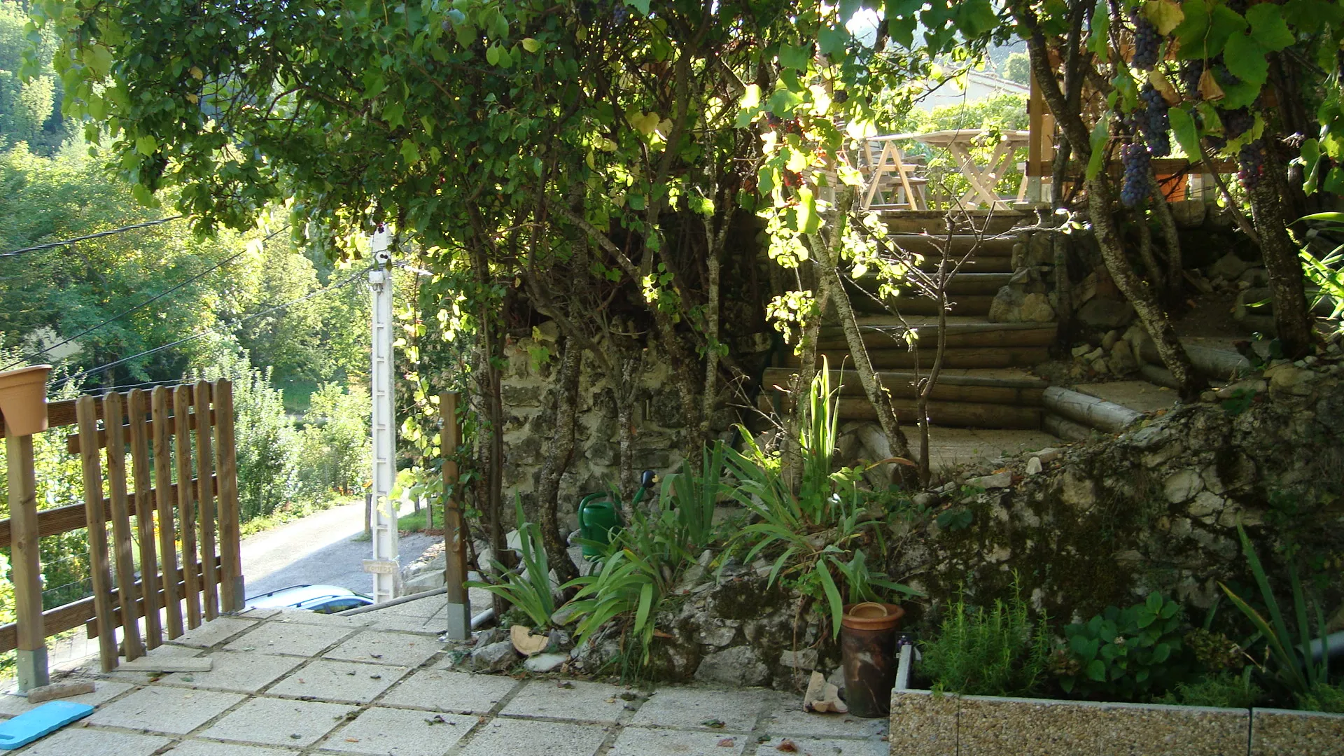 Balkon (7m2), afgesloten terras (10m2) verbonden met een trap naar twee andere (voor kleine kinderen beveiligde) terrassen (60 en 30 m2) met buitendouche en barbecue.