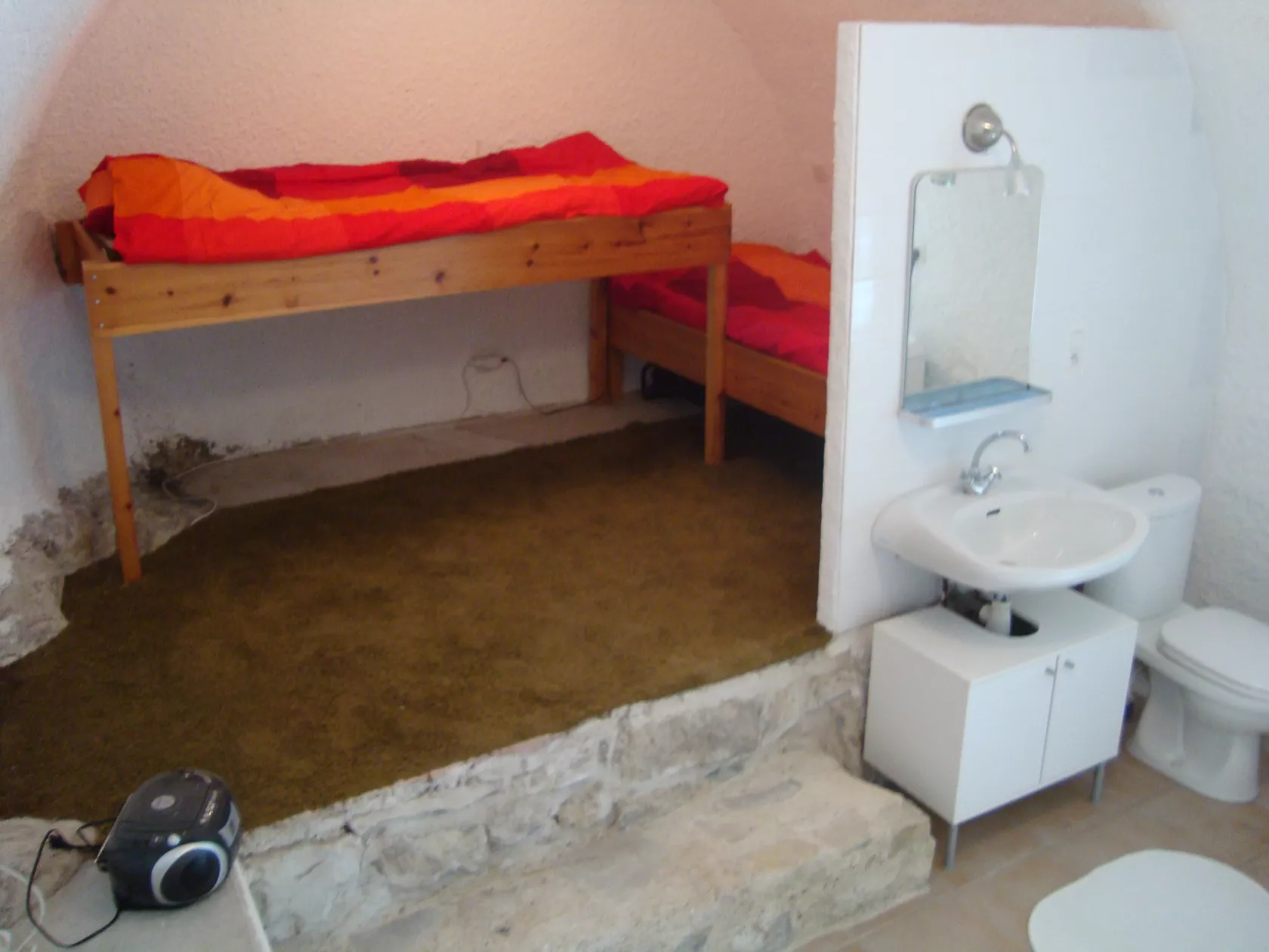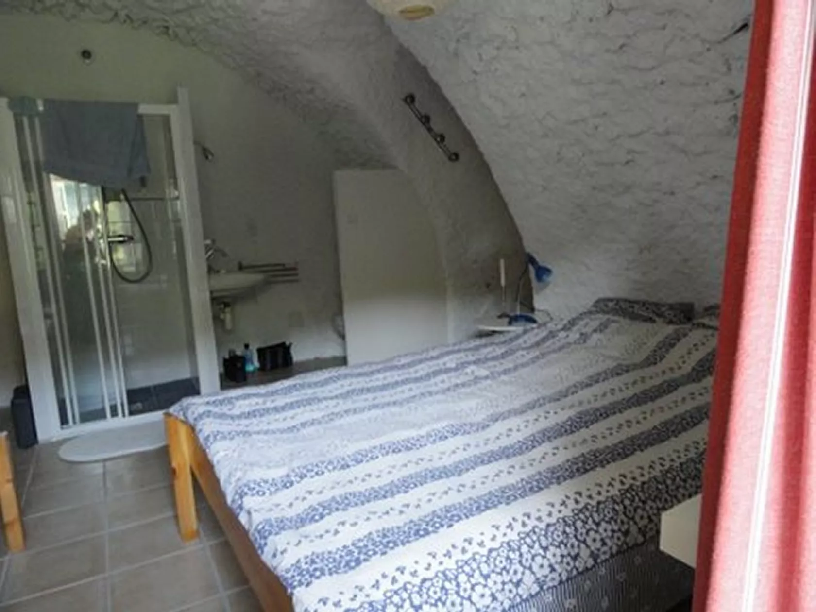 Tussenverdieping (5/6 treden lager): slaapkamer (25 m²) met tweepersoonsbed en 2 eenpersoonsbedden. Douche en wastafel en wc