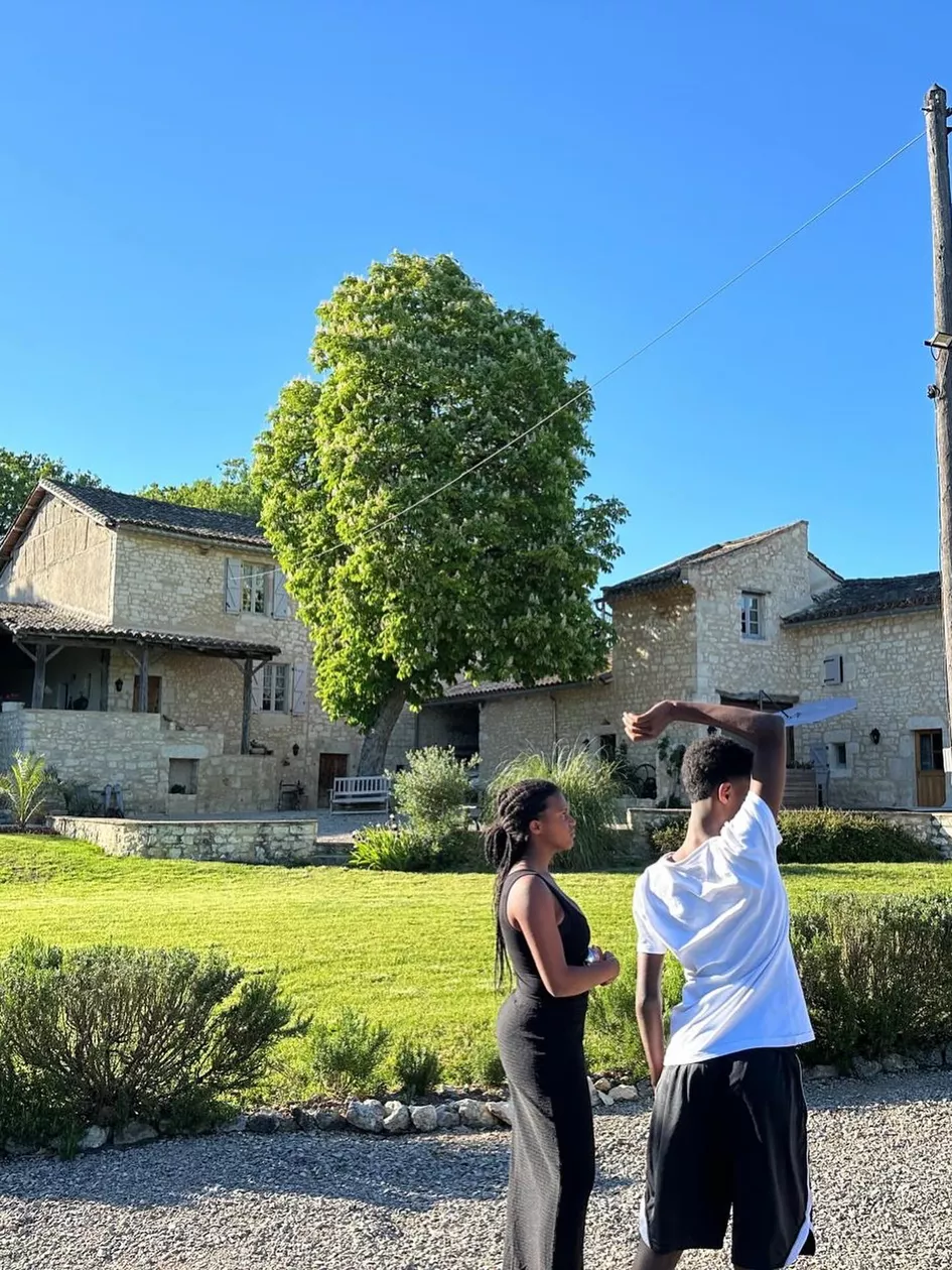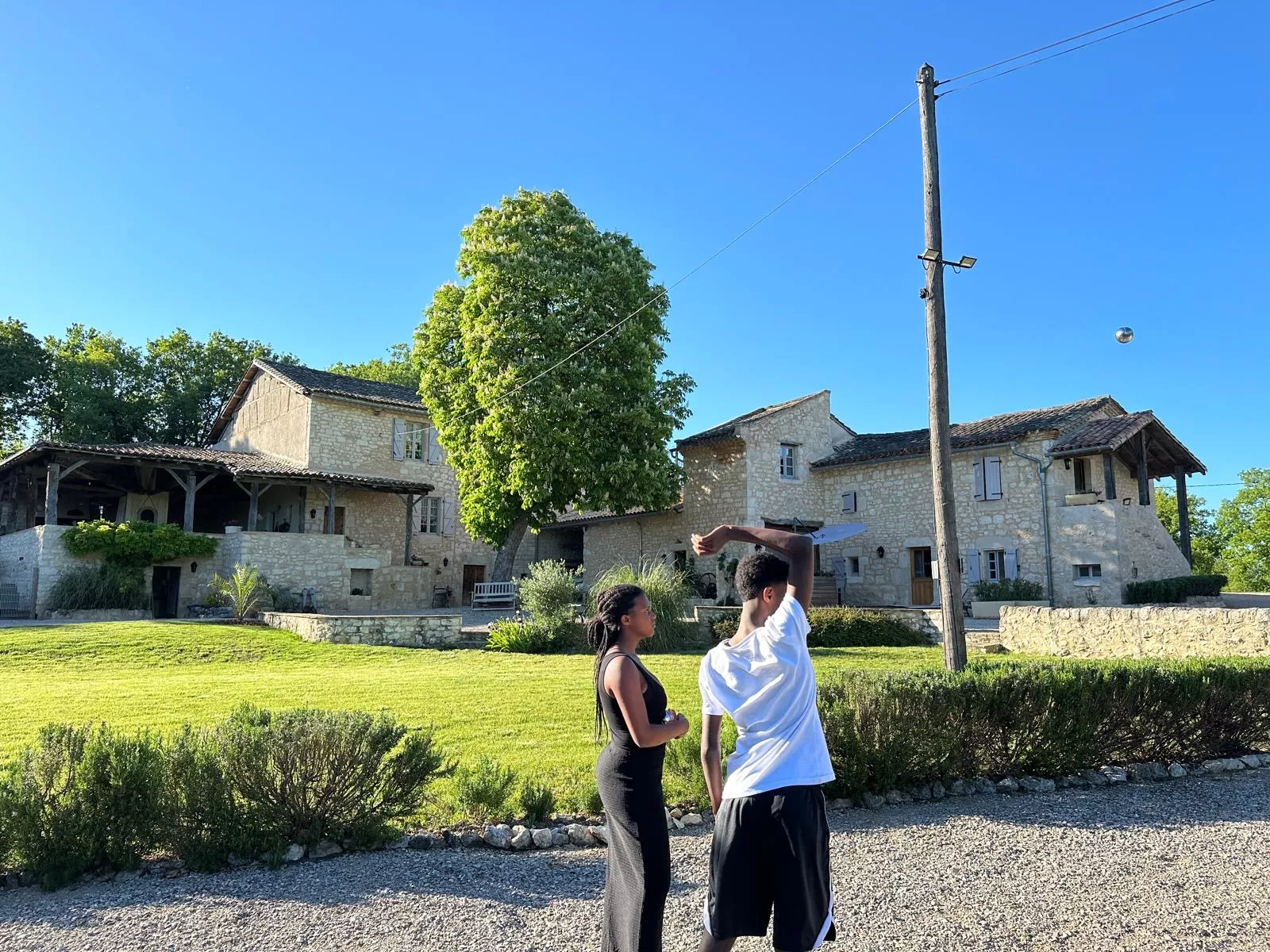 Vlak tegenover de gîte bevindt zich de tuin met trampoline en jeu de boules terrein.