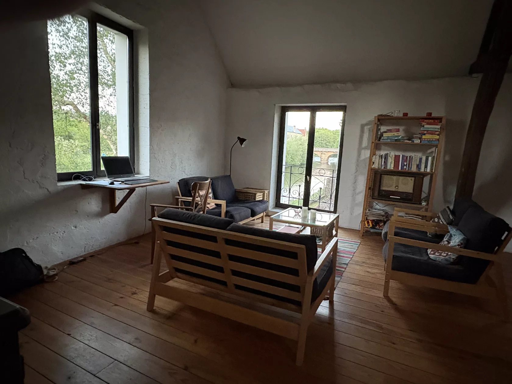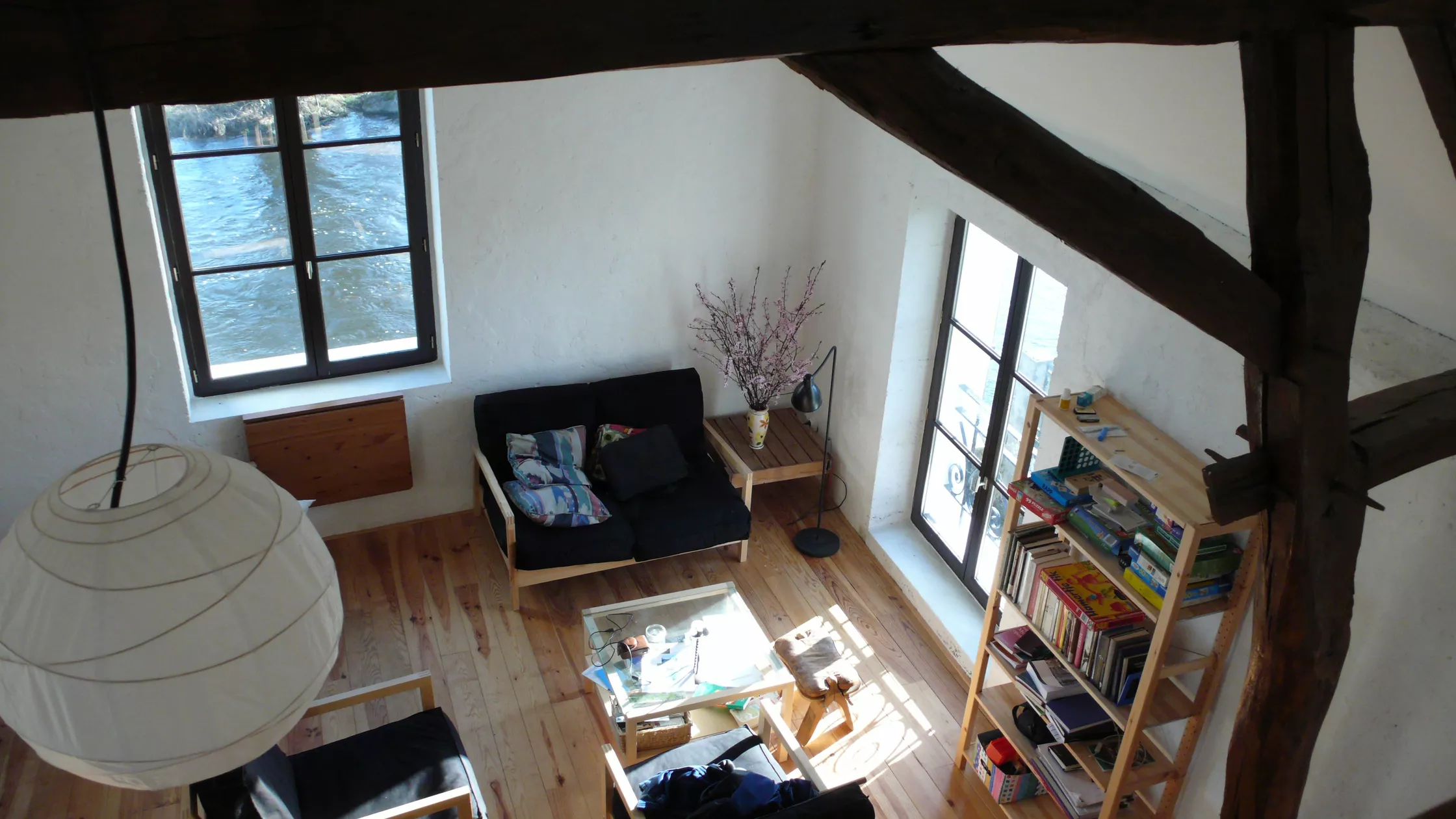 De zeer ruime huiskamer op de eerste verdieping geeft een prachtig uitzicht op de rivier. Er is een mooie dakconstructie van oude balken, en er is een kleine verdieping gemaakt, de 'slaapzolder', met een tweepersoonsbed. In de kleine huiskamer staat een uitgebreide verzameling langspeelplaten in verschillende genres. Ook is er een verzameling boeken en spelletjes waar gasten uit kunnen putten.