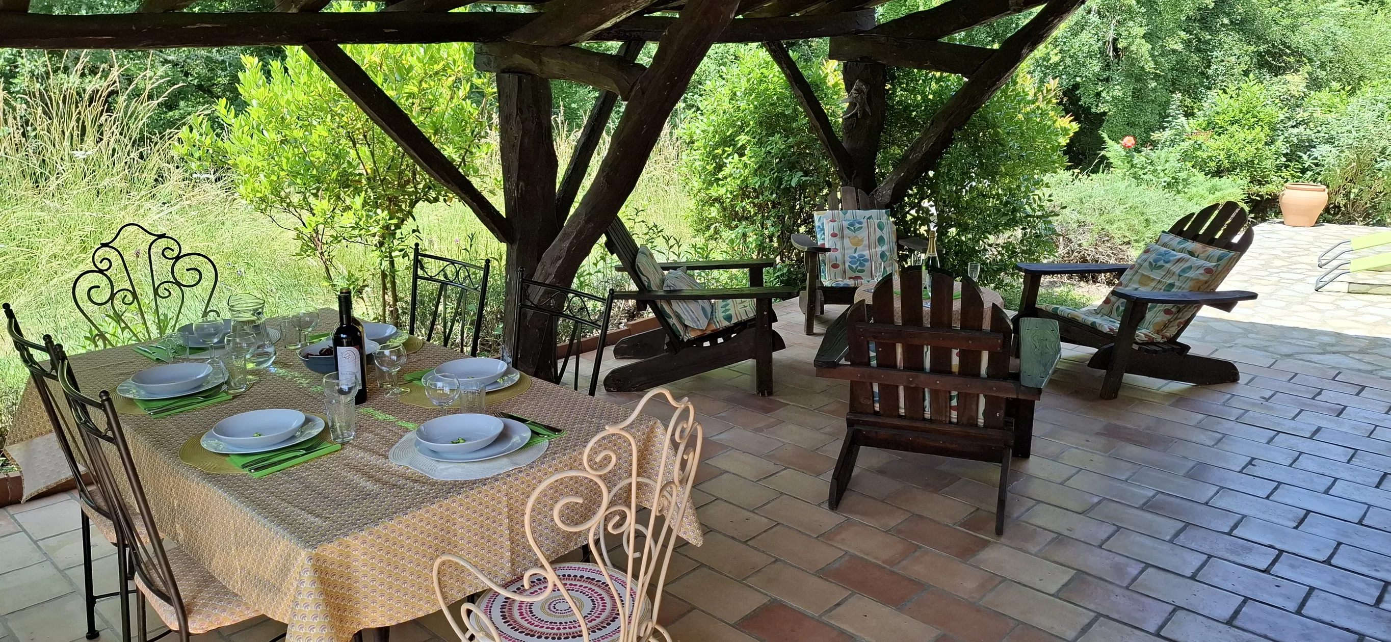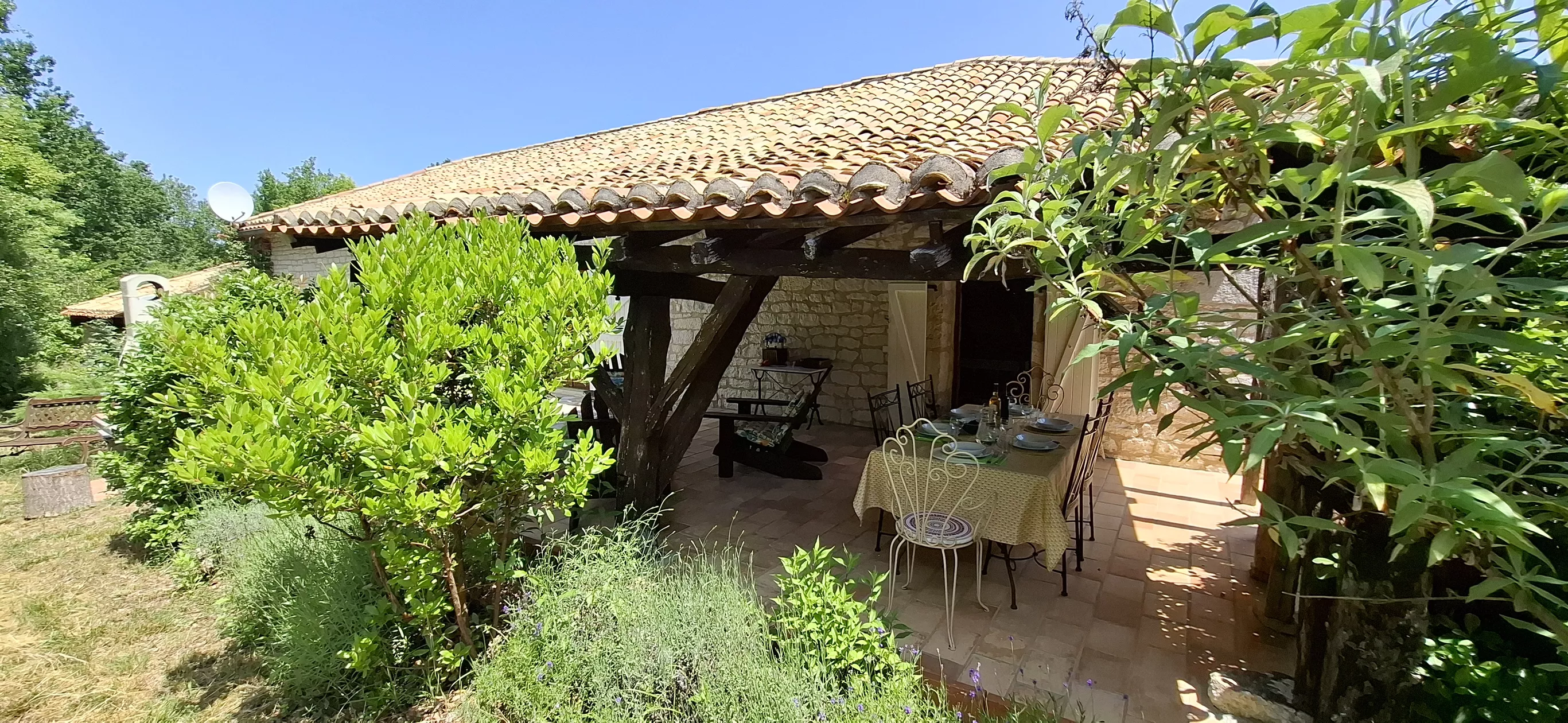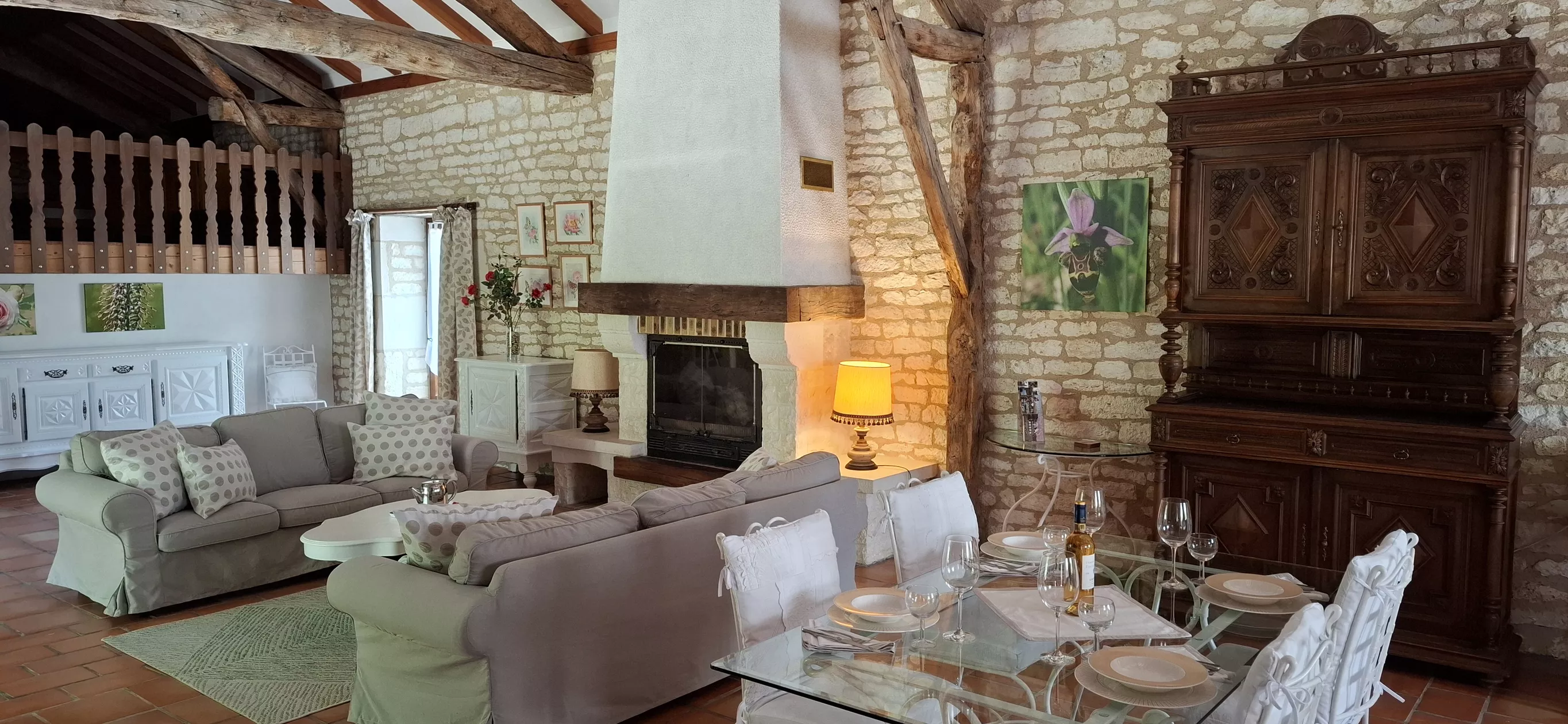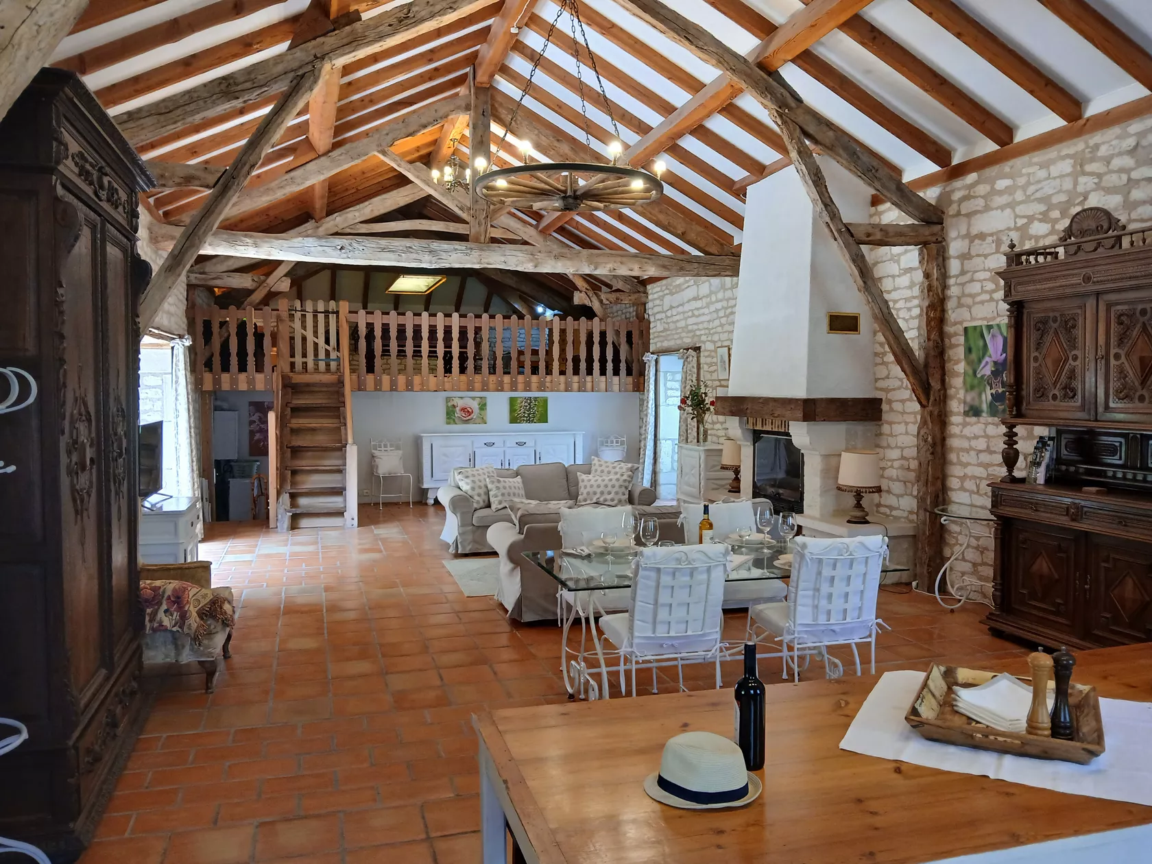 De landelijke keuken, aan de ene kant van de schuur, leidt direct naar een schaduwrijk en overdekt eetterras, met BBQ, met uitzicht op de tuin. In het midden van de schuur staat een eettafel en een zithoek met banken voor een grote open haard. De hoofdslaapkamer heeft een groot comfortabel tweepersoonsbed van 160x200cm met een uitklapbare slaapbank van 130x180cm voor kinderen. De grote badkamer heeft een extra brede douche en een apart bad.