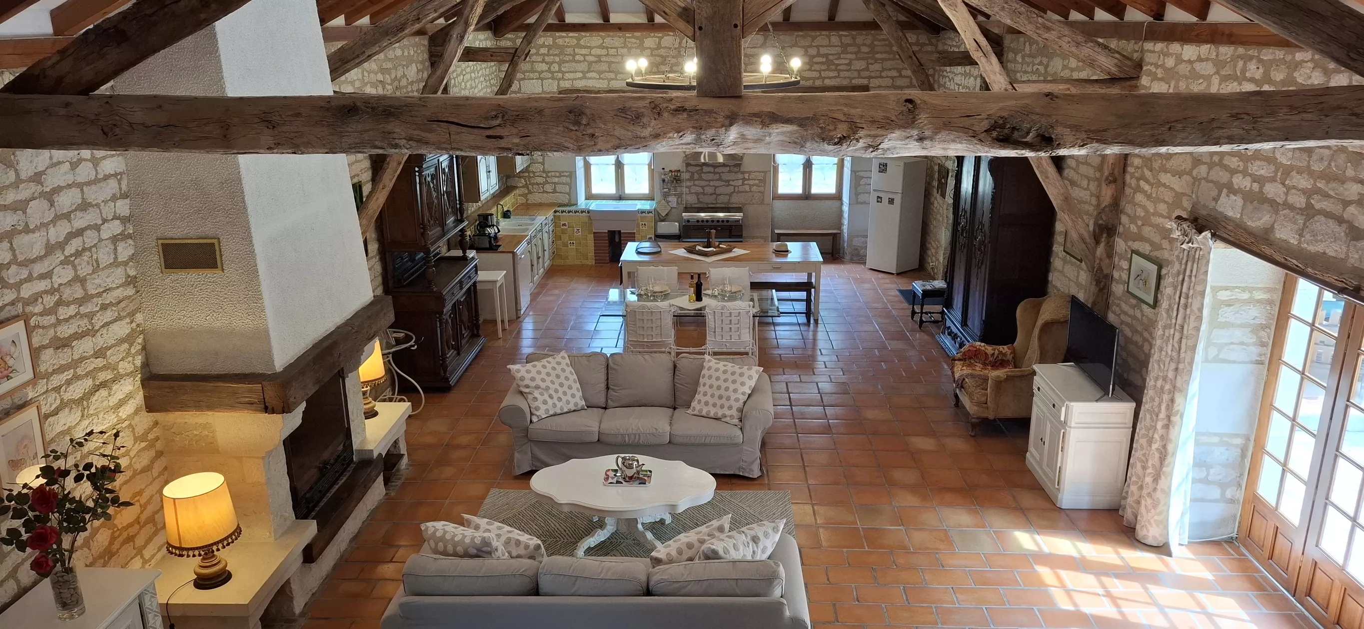 Gite Le Sabatou : De schuur heeft een imposant balkenplafond en terracotta vloeren.