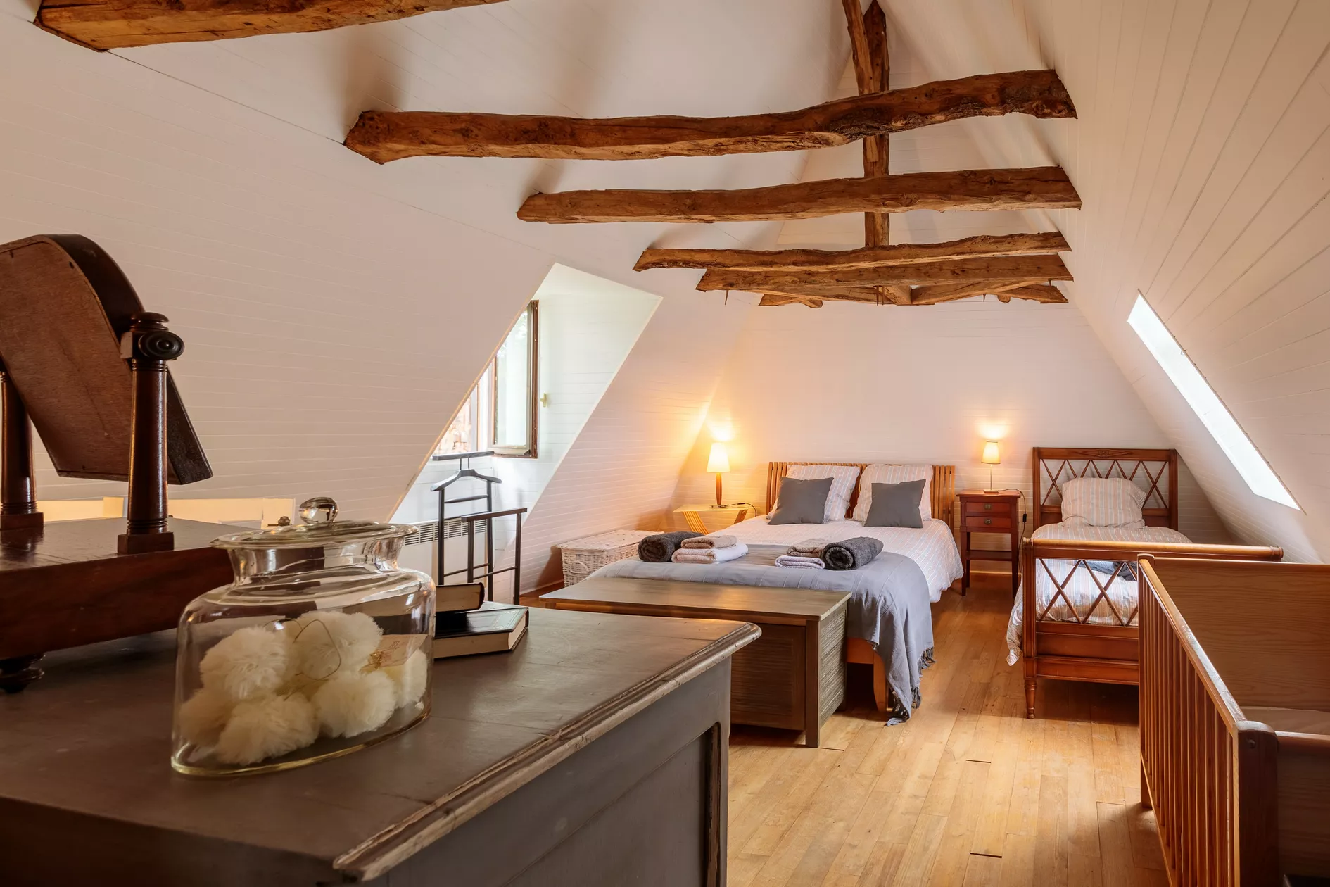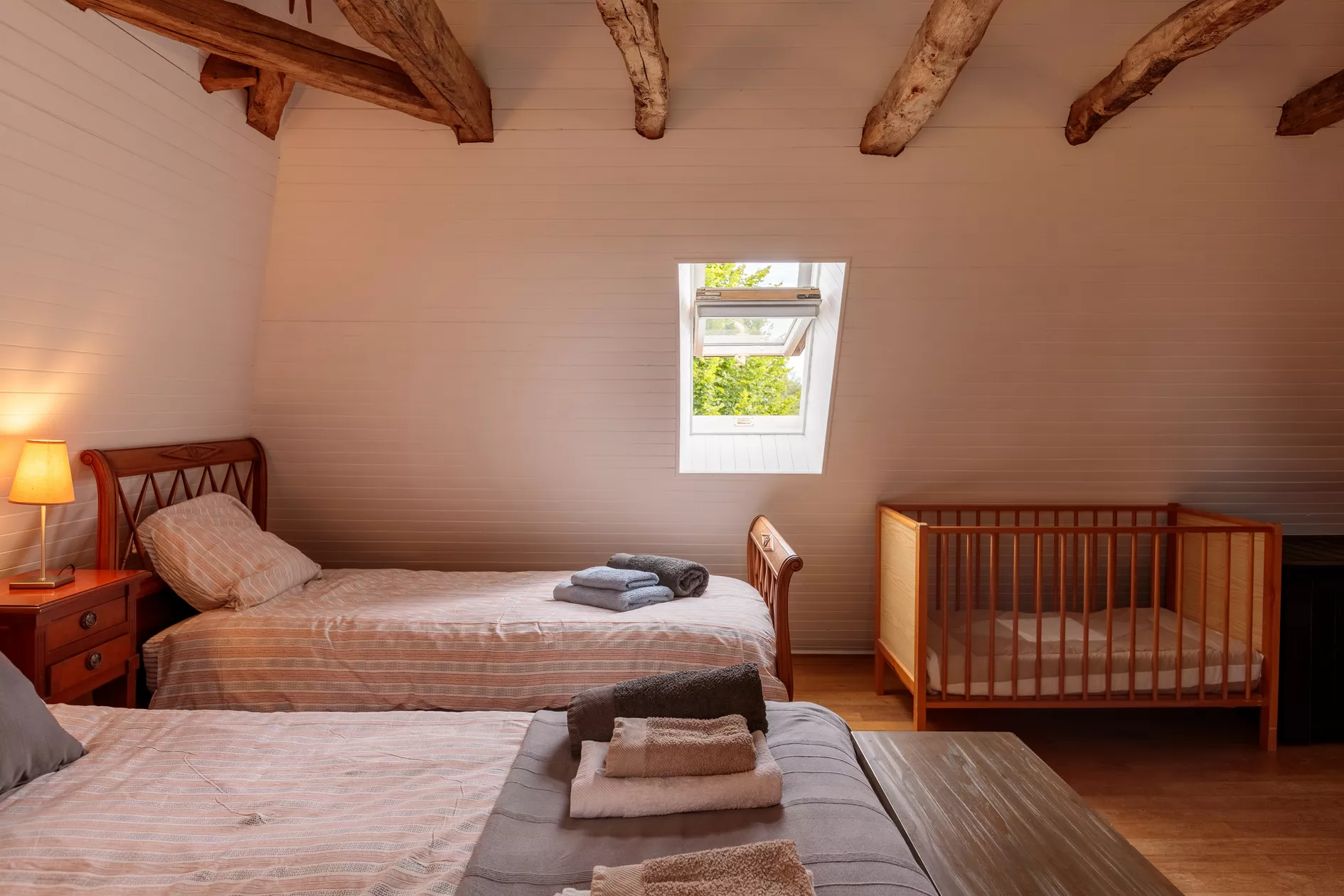 Boven bevinden zich drie comfortabele slaapkamers: een kinderkamer met drie eenpersoonsbedden, een stijlvolle master bedroom met tweepersoonsbed en en-suite badkamer, en een logeerkamer met eigen toegang via de keuken, voorzien van een tweepersoonsbed en een kinderbedje. Alle slaapkamers beschikken over verplaatsbare airconditioning, zodat u ook in de zomer heerlijk koel slaapt.