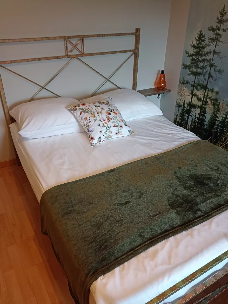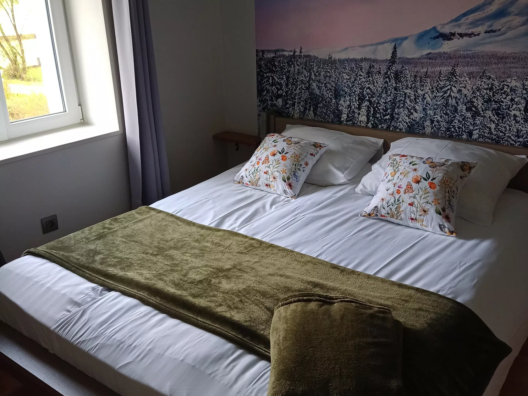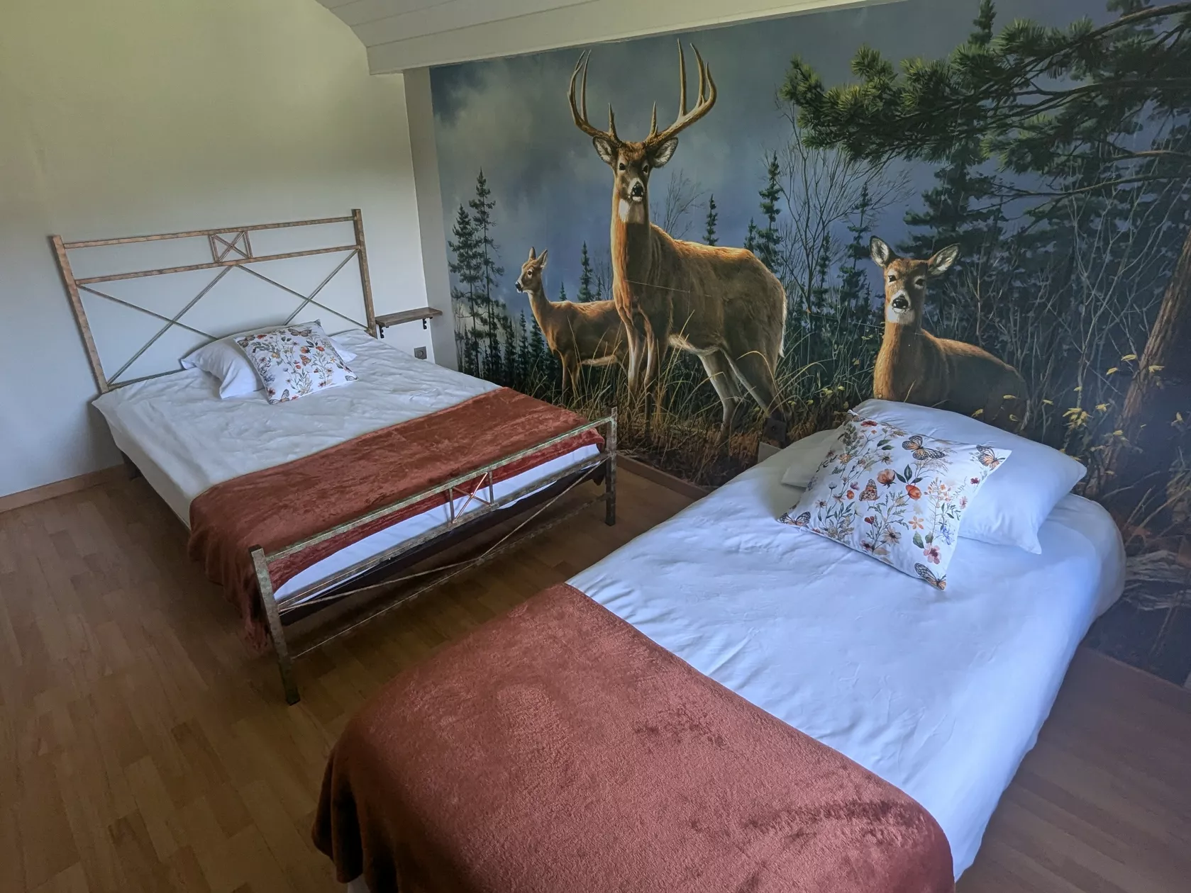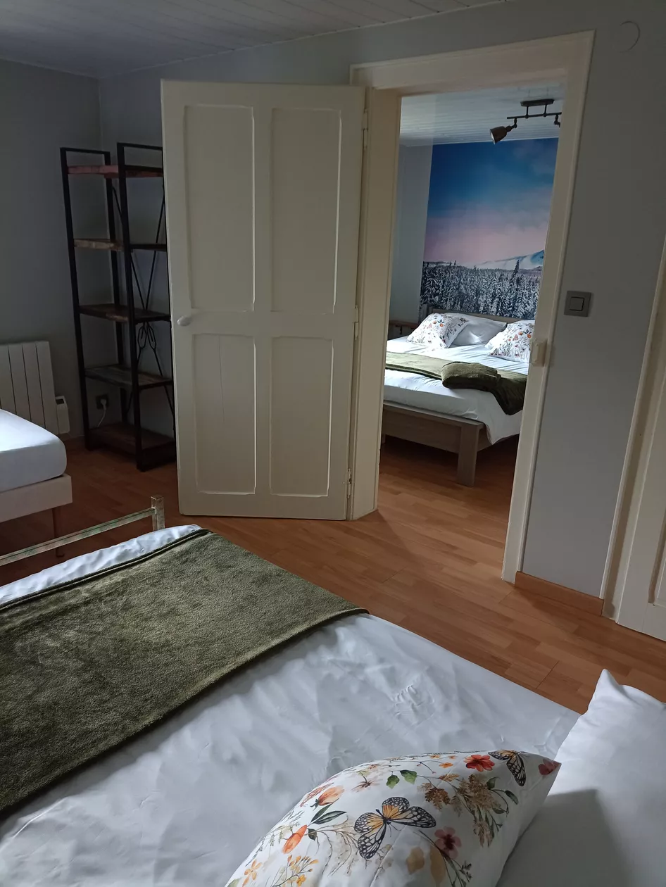 Op het eerste verdiep is de ruime familiekamer die bestaat uit twee aangrenzende slaapkamers, afgeschermd door een tussendeur. De eerste kamer heeft een dubbel bed van 1m60. Op de tweede kamer is nog eens plaats voor maximum 3 personen. Er staat een dubbel bed van 1m40 en een enkel bed van 90cm.