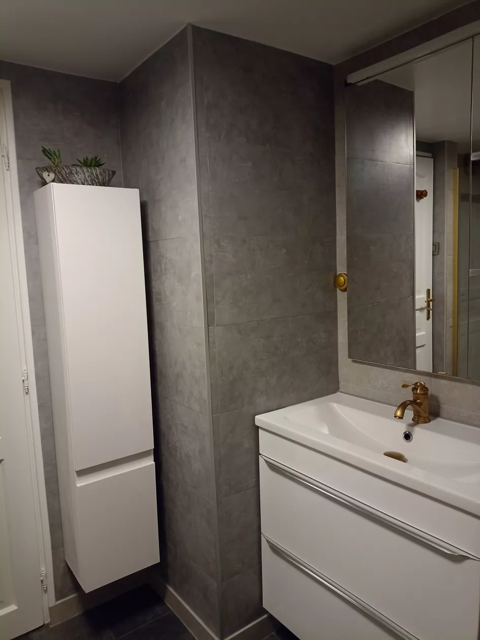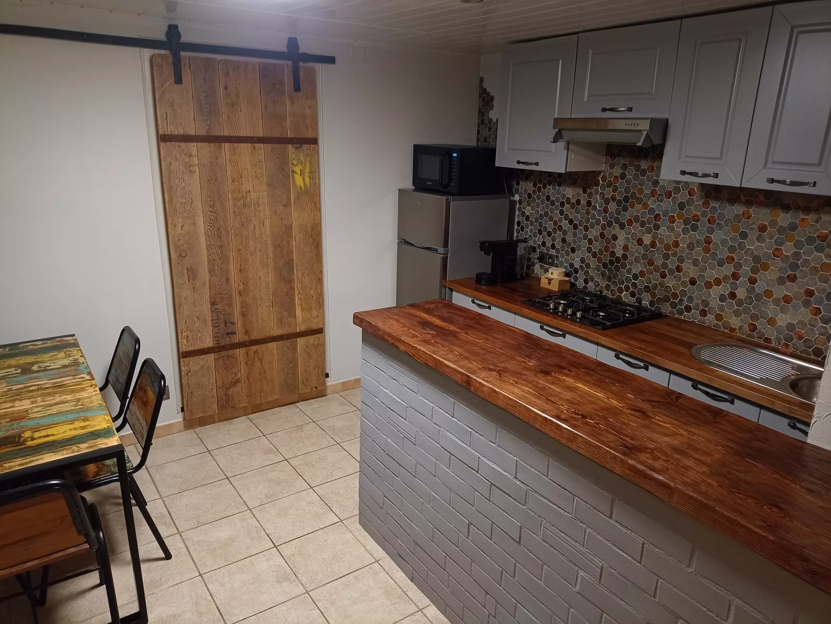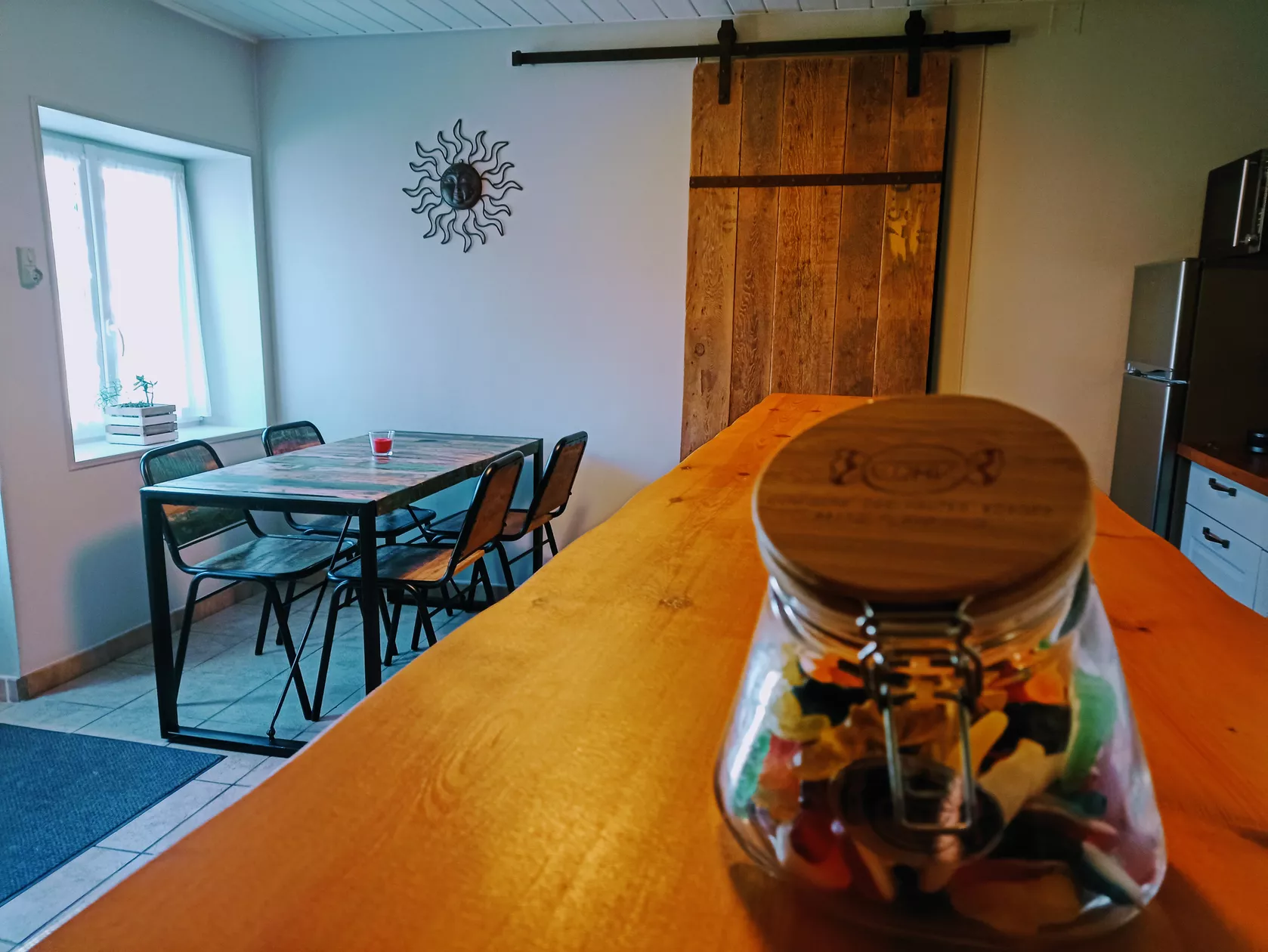 U komt binnen in een gezellige keuken met zitplaats. De keuken is voorzien van koelkast, kookfornuis op gas, combimagnetron met heteluchtoven en een Senseo Switch koffiezetapparaat dat je kan gebruiken met filters of pads. In dezelfde ruimte bevindt zich de living met smart-tv en DVD-speler, u heeft ook gratis toegang tot onze Netflix-en Prime account. Links van de keuken vindt u een comfortabele badkamer met douche en een apart toilet.