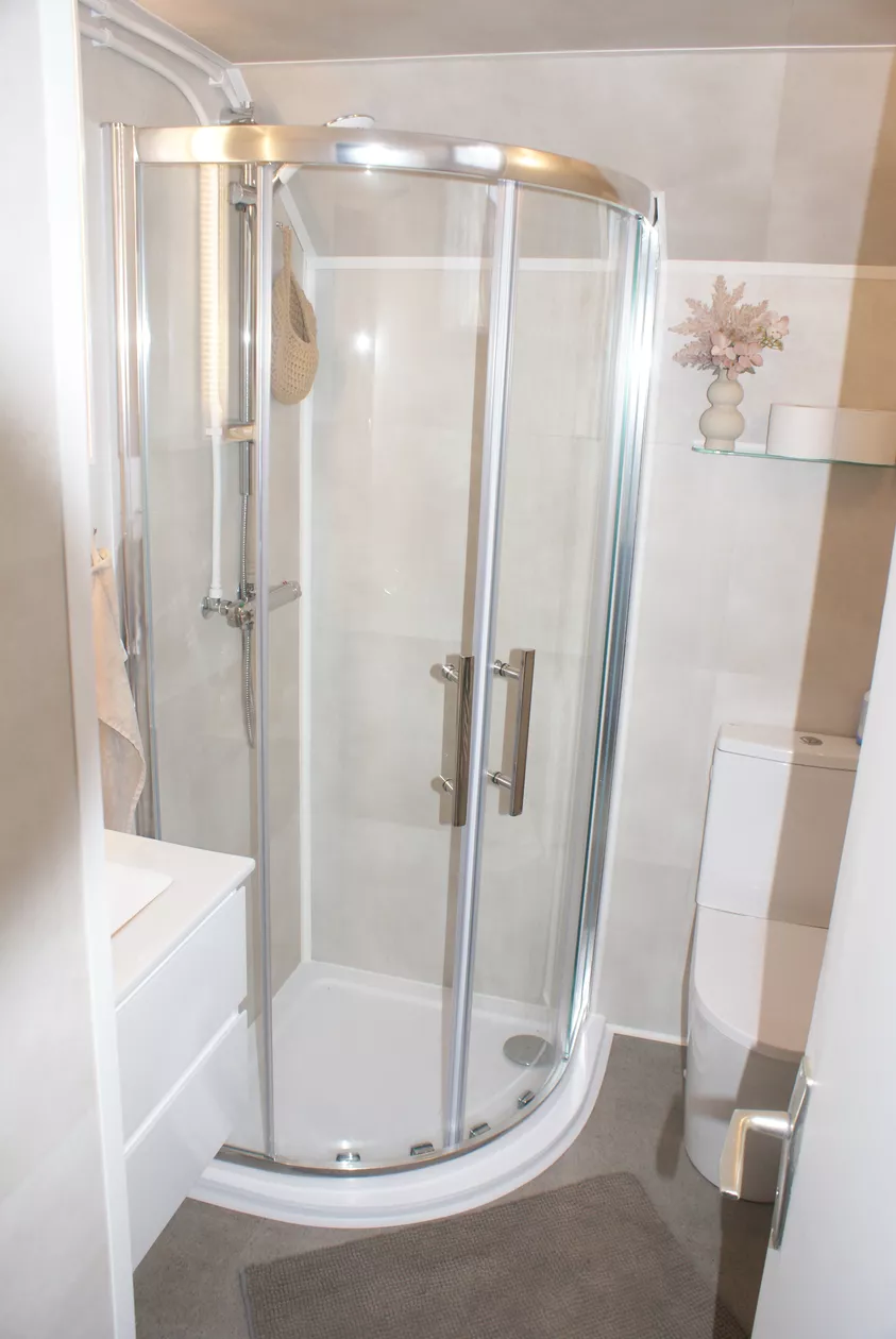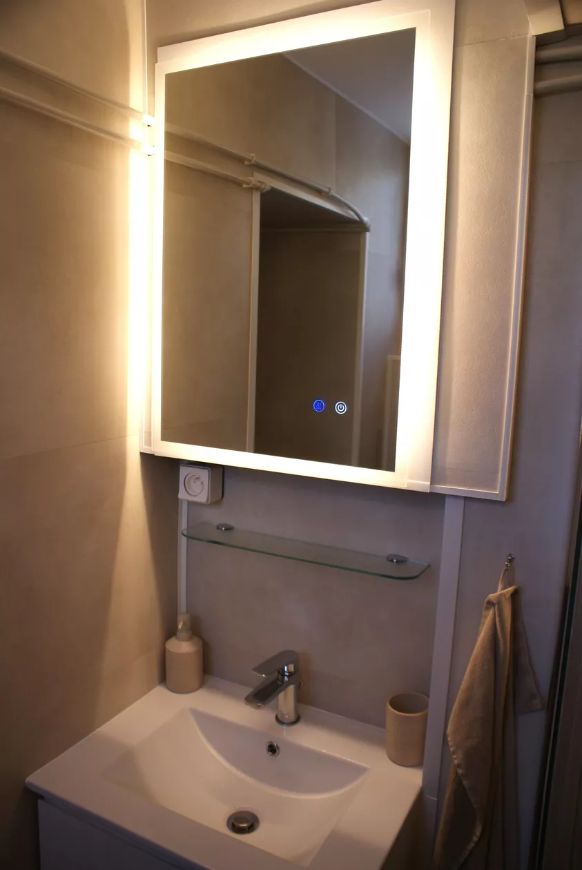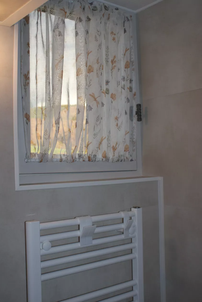 De badkamer is voorzien van een elektrische radiateur en een elektrisch verwarmde spiegel.