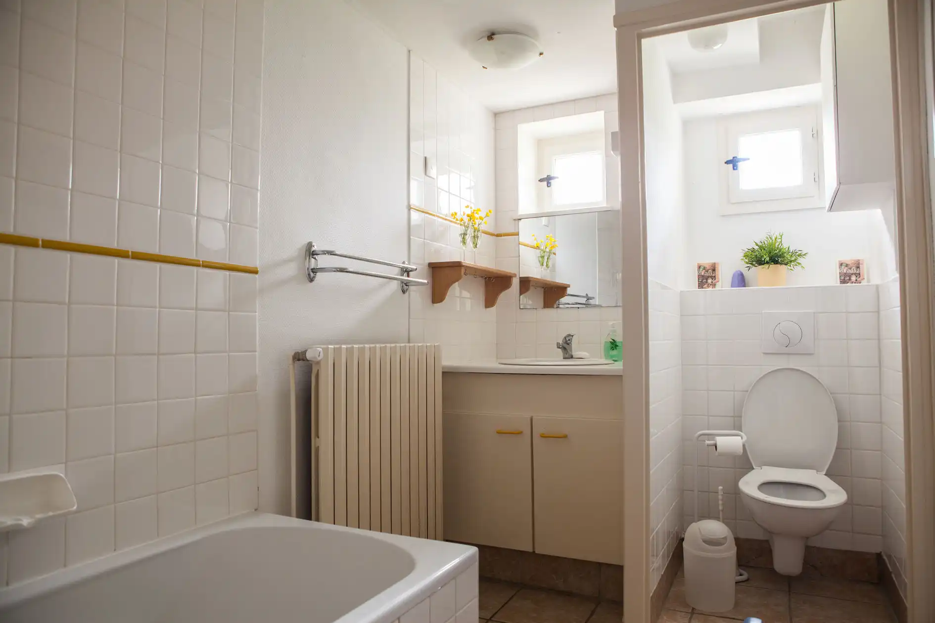 Vanuit de keuken heeft u toegang tot de badkamer met toilet en ligbad/douche en een slaapkamer met een 2 persoonsbed (lits jumeaux) en kinderledikant..