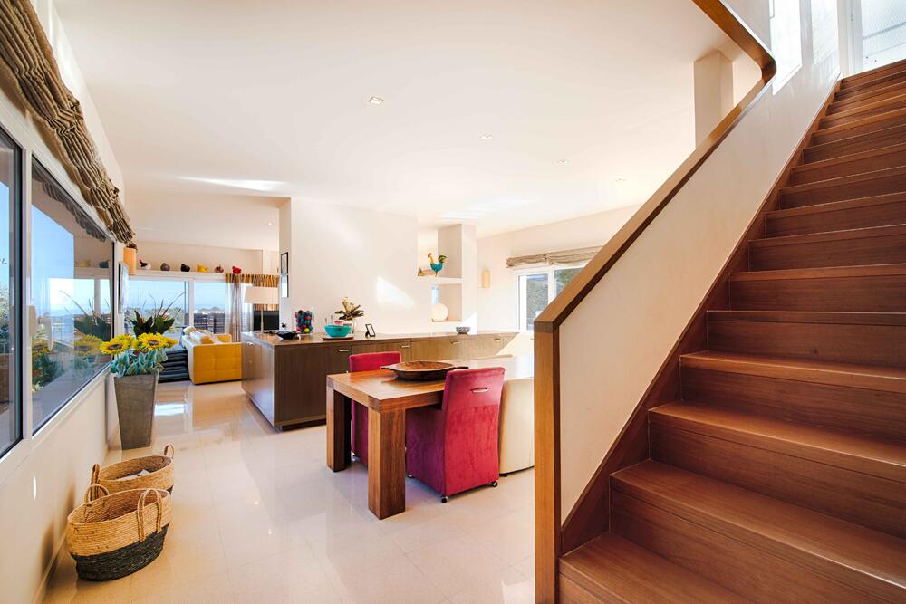 Rechts van de carport is de toegang naar de hoofdwoning. Via een interne trap komt u in de ruime eetkamer, met daarnaast de salon met zeezicht. Aansluitend aan de salon ligt een enorm terras met zeezicht en een grote eettafel en een luxe lounge set. Aan de andere zijde van de eetkamer ligt de grote en zeer complete keuken en bijkeuken.