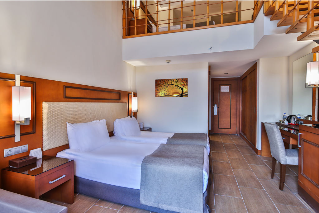 50 m² * Slaapkamer op begane grond met slaapbank en een slaapkamer op de eerste verdieping * Dezelfde faciliteiten als de standaardkamer * Tegen een meerprijs boekbaar met zijzeezicht Sport & Ontspanning * Fitnessruimte * Aerobics * Basketbal * Beachvolleybal * Boccia * Darts * Biljart* * Tafeltennis * Tennis * Minigolf * Gameroom* * Watersporten aan het strand* * Turks bad * Sauna * Binnenzwembad * Bubbelbad * Massages en behandelingen* * Dagelijks entertainment *Tegen betaling Kinderfaciliteiten * 1 kinderzwembad * 1 kinderzwembad met 3 glijbaantjes (op vaste tijden geopend) * Miniclub (4-12 jaar) * Teenageclub (11-16 jaar) * Minidisco * Speeltuin * Babybedjes (op aanvraag en op basis van beschikbaarheid) Zwembaden & Strand * 3 buitenzwembaden * 2 buitenzwembaden met glijbanen (op vaste tijden geopend) * Zonneterras * Privéstrand * Ligbedden, matrasjes en parasols gratis (strand en zwembad) * Gratis badhanddoekenservice Verzorging Zomer: Crystal Prestige Elite (voorheen Amara Prestige Elite) * Verblijf o.b.v. Ultra All Inclusive: * Ontbijt in buffetvorm (07.00-11.00 uur) * Lunch in buffetvorm (12.30-14.30 uur) * Diner in buffetvorm (18.30-21.30 uur) * Snacks (11.00-18.00 uur) * Koffie/thee, koekjes en ijs (11.00-23.00 uur) * Nachtsnack (24/7) * Tijdens je verblijf kun je 1 maal dineren in 1 van de 4 à-la-carterestaurants (vooraf reserveren) * Geselecteerde lokale alcoholische en alcoholvrije drankjes 24 uur per dag * Een selectie import drankjes (10.00-23.59 uur) * Tegen betaling: import drankjes, energie drankjes, flessen drinken, speciale wijnen en cognac en roomservice.