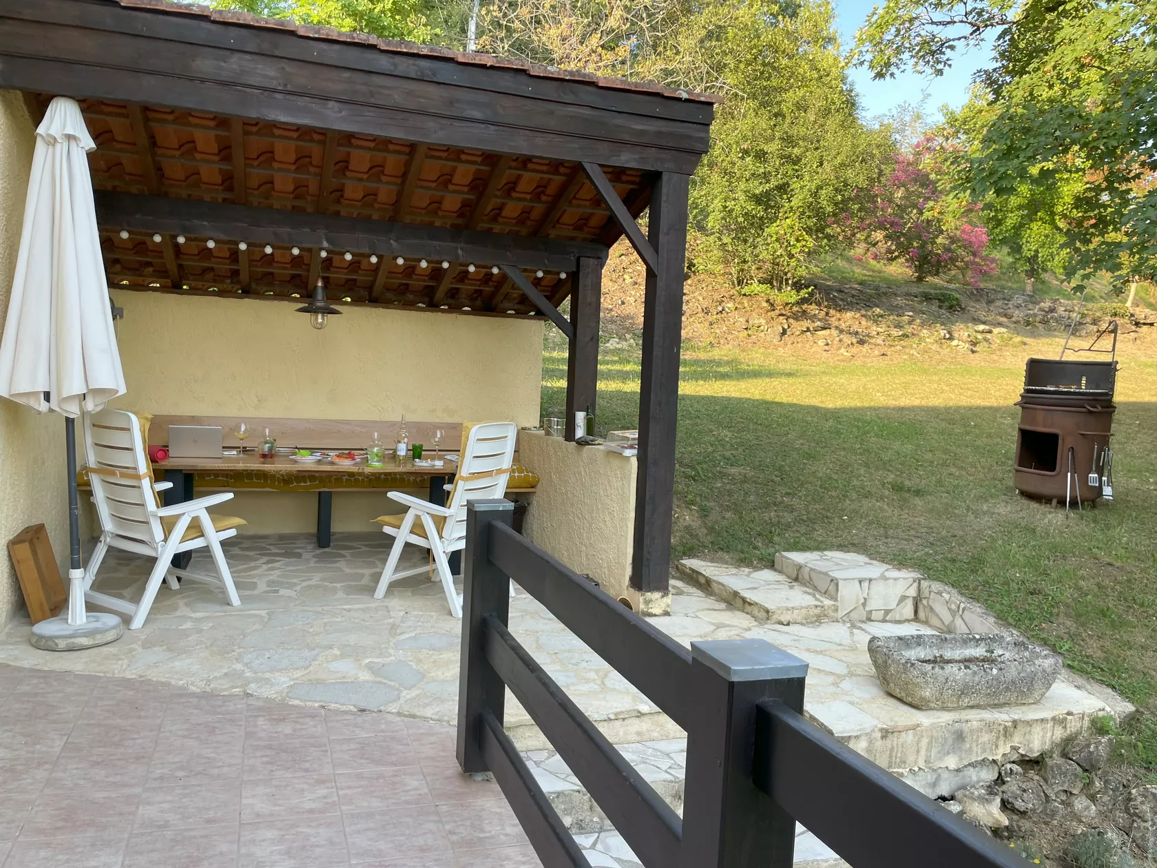Tuinstoelen, tafels en parasols en een bbq staan tot uw beschikking op het terras, zodat u kunt genieten van het uitzicht!.