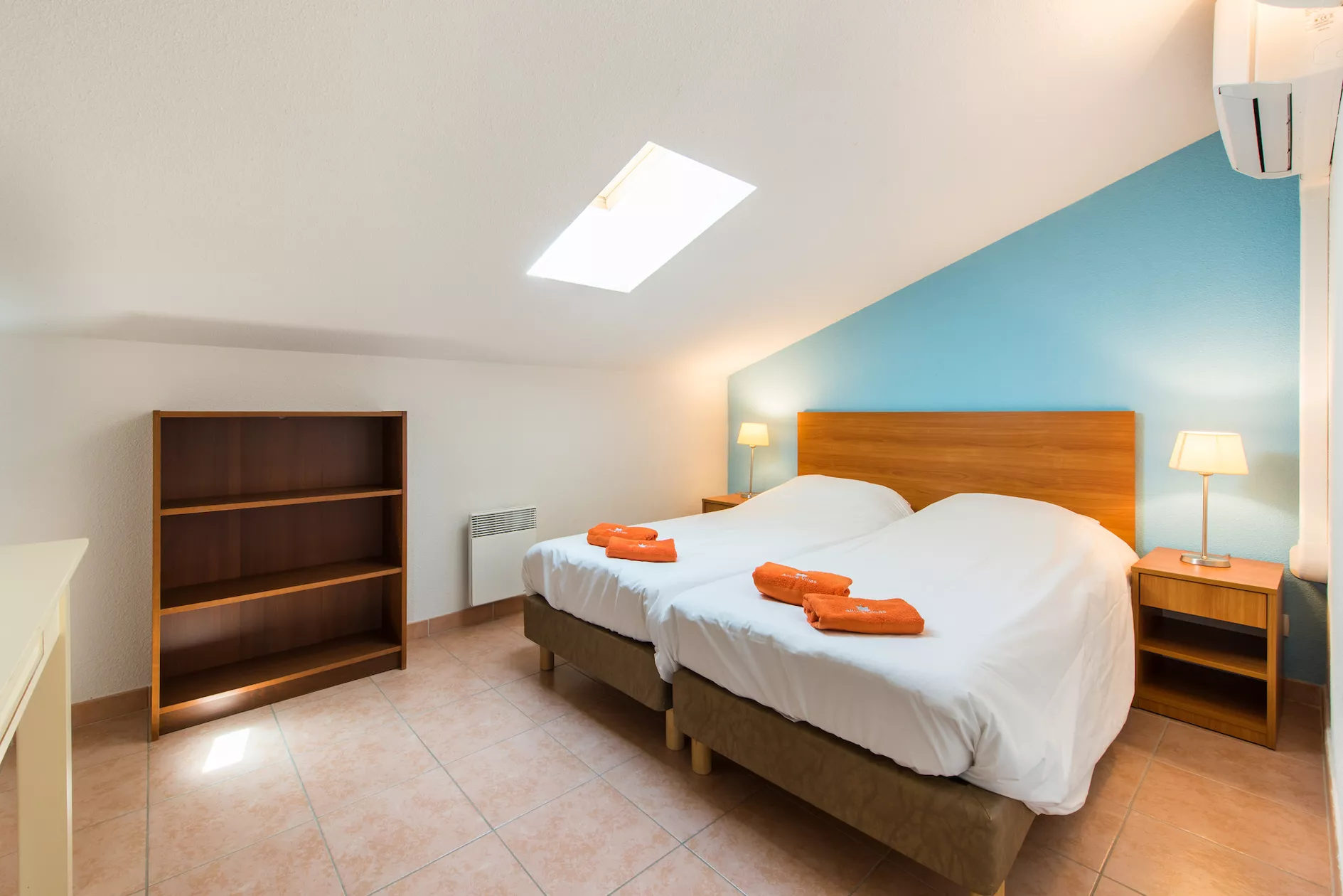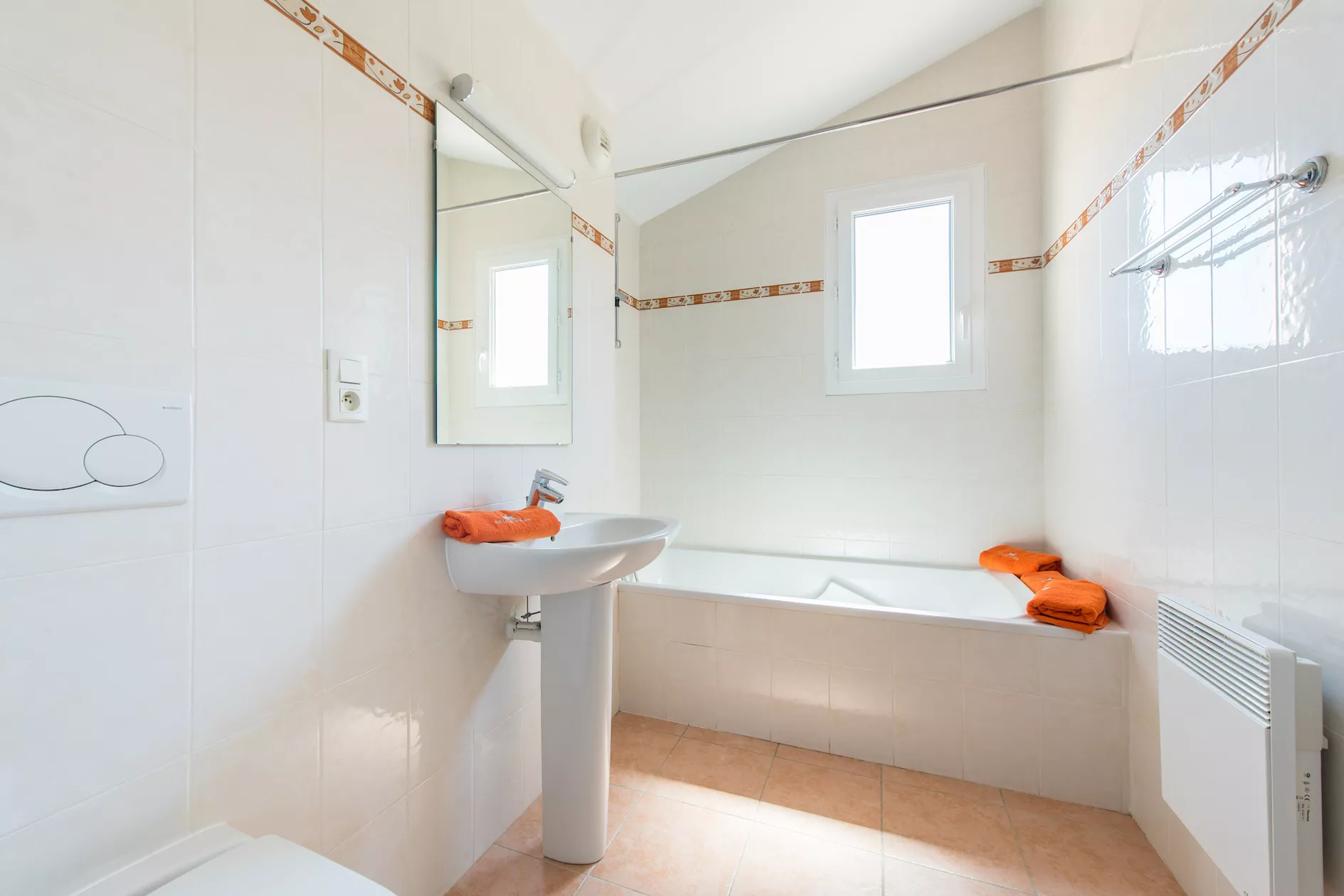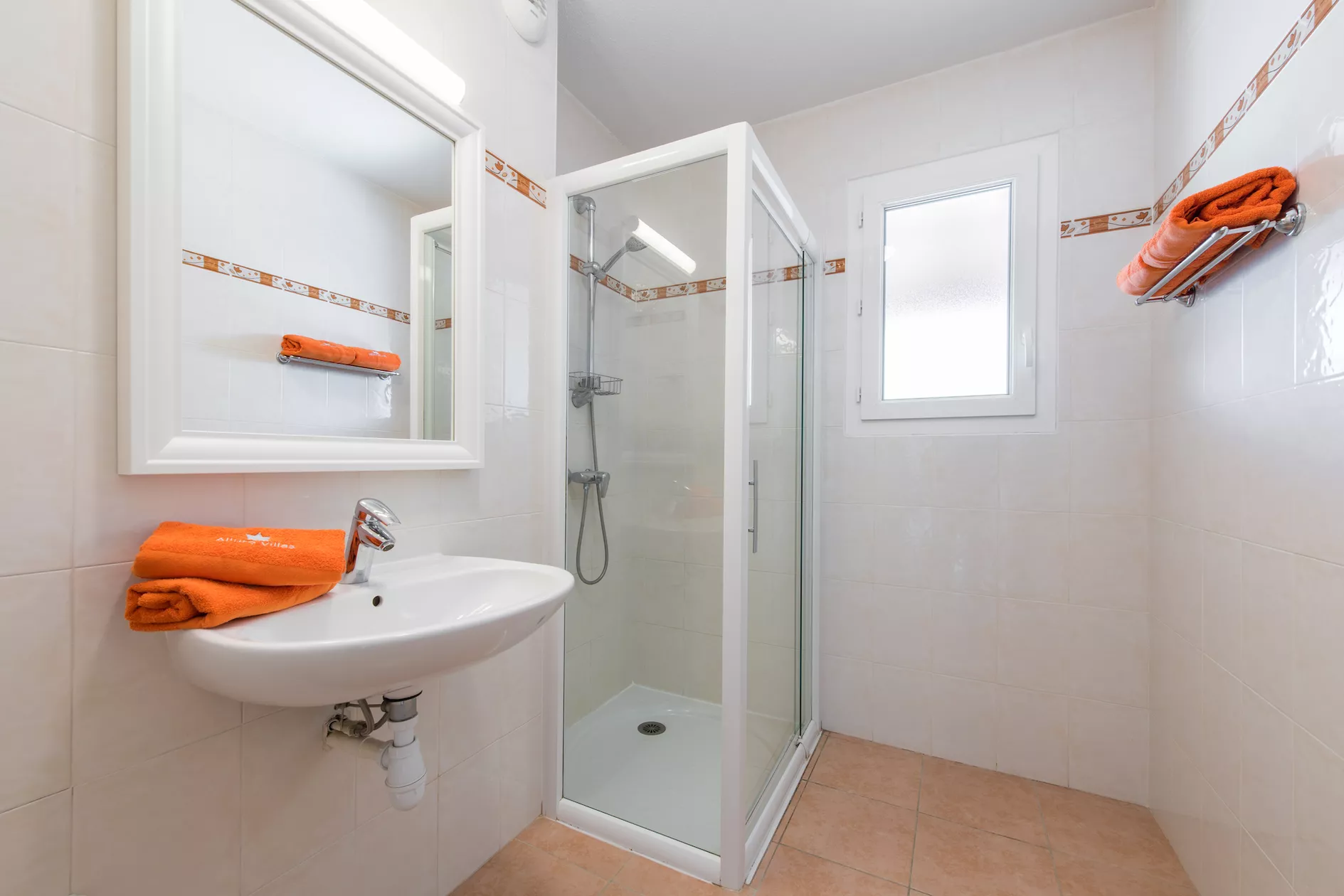 De eerste badkamer is voorzien van wastafel en douche. De tweede badkamer beschikt over een wastafel, toilet en bad. Slaapkamer met elk twee eenpersoonsbedden (lengte 2.10 m) en een slaapkamer met twee eenpersoonsbedden (lengte 2.00 m) bevinden zich op de eerste verdieping . Alle 4 slaapkamers hebben airconditioning.
