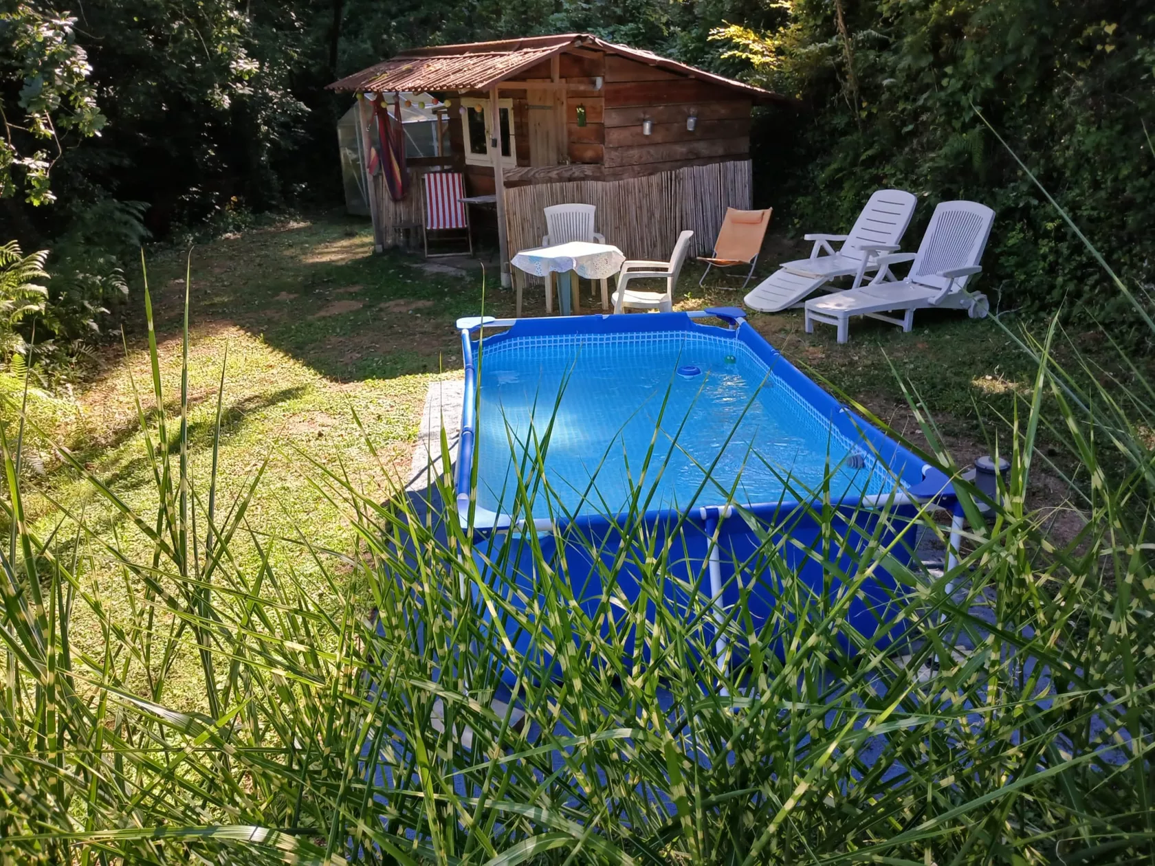 Aan de achterzijde van het huis is onze grote tuin met uitzicht op de tegenover gelegen heuvels. In de verte zie je een paar gehuchtjes en zelfs 2 kastelen.