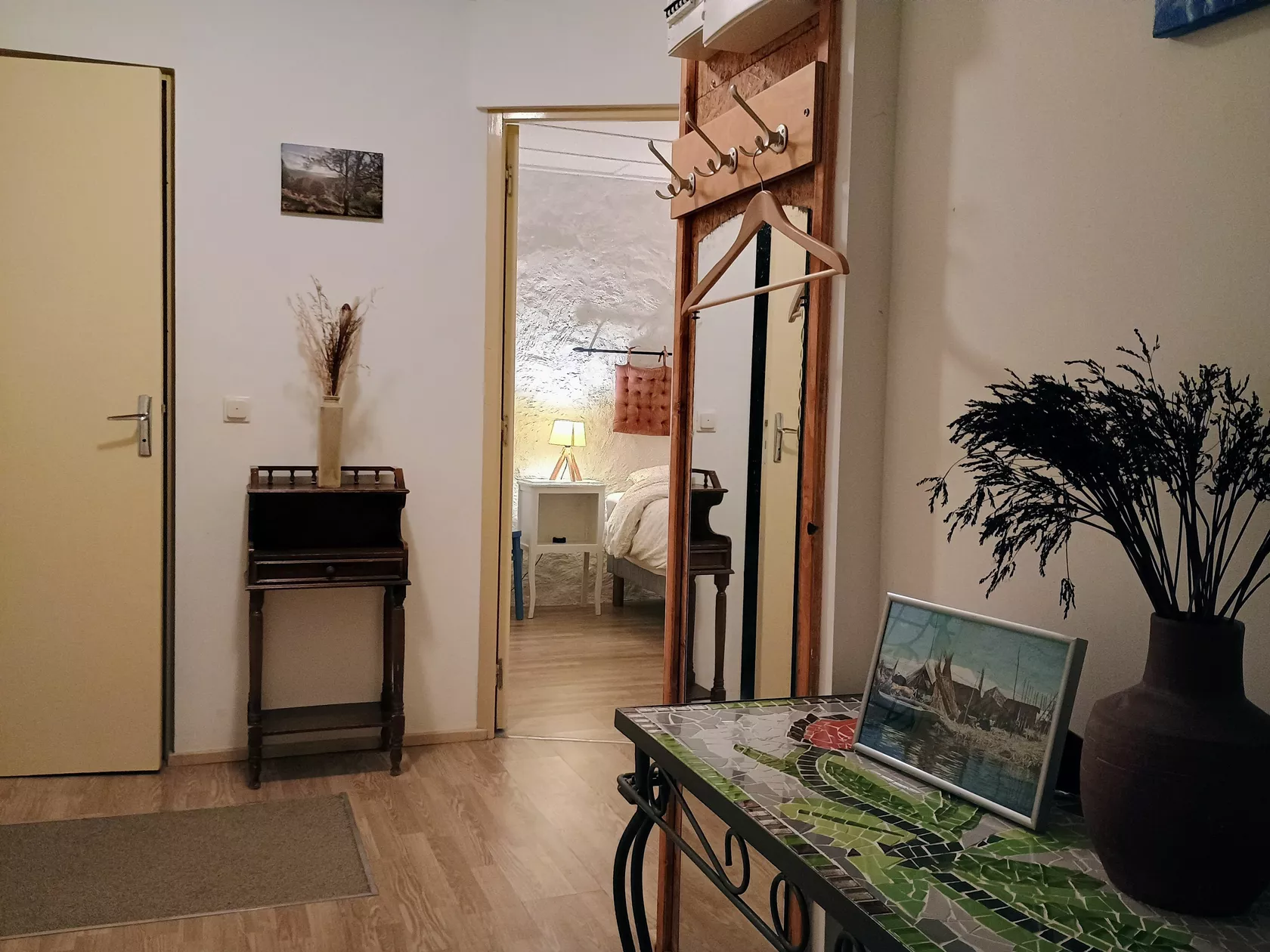 De oude schuttersgaten hebben glas in lood ramen gekregen en de schoorsteen is verfraaid met handgeschilderde tegeltjes. Via een halletje kom je in de badkamer met douche en toilet en de sfeervolle slaapkamer. Het appartement heeft een privé terras en een extra zitje voor de deur onder een afdak.