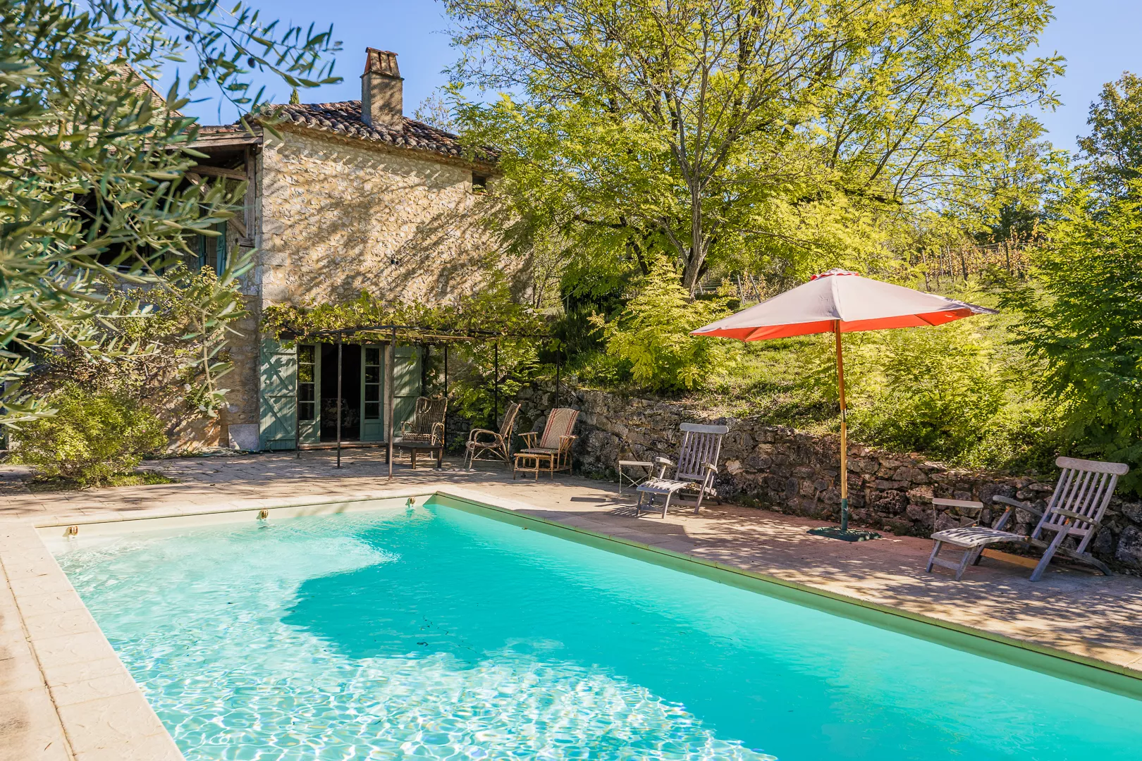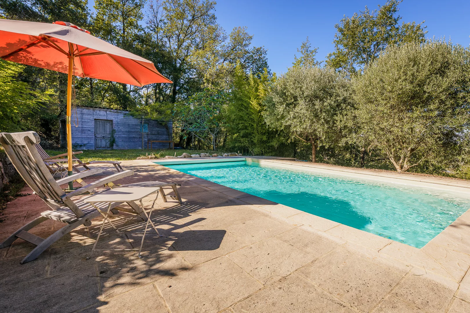 Op het lagere niveau ligt een privézwembad van 9x4 meter (1,4 m diep) met gemakkelijke instap via drie treden, perfect geïntegreerd in het landschap.