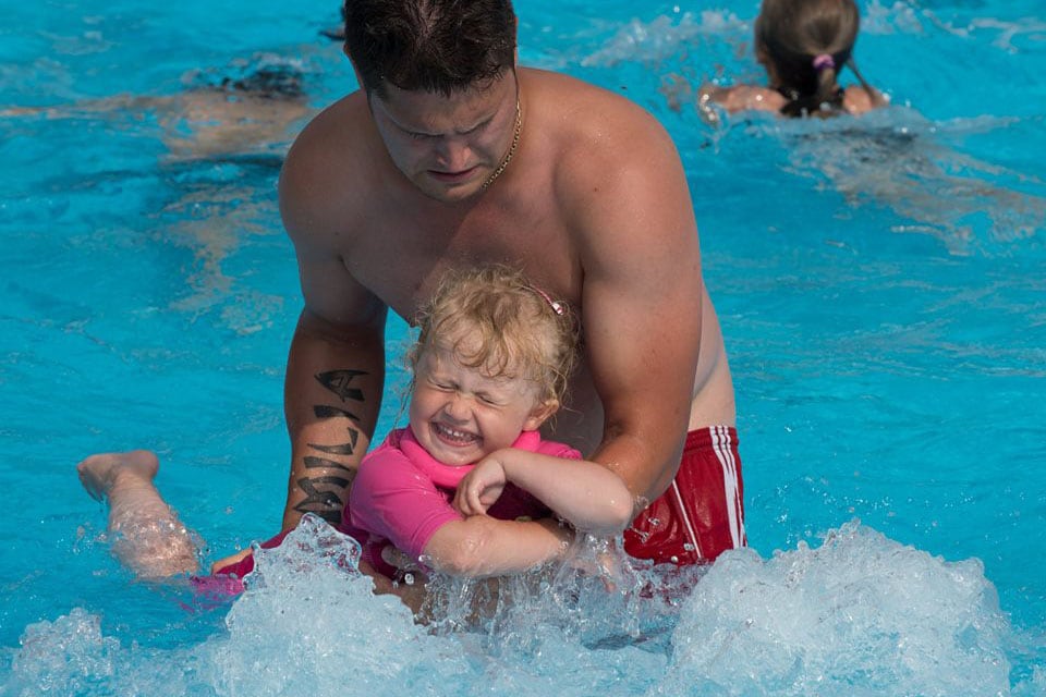 Zwembad op de camping met klimwand en ligweide. In het laagseizoen is het restaurant op zaterdag en zondag geopend..