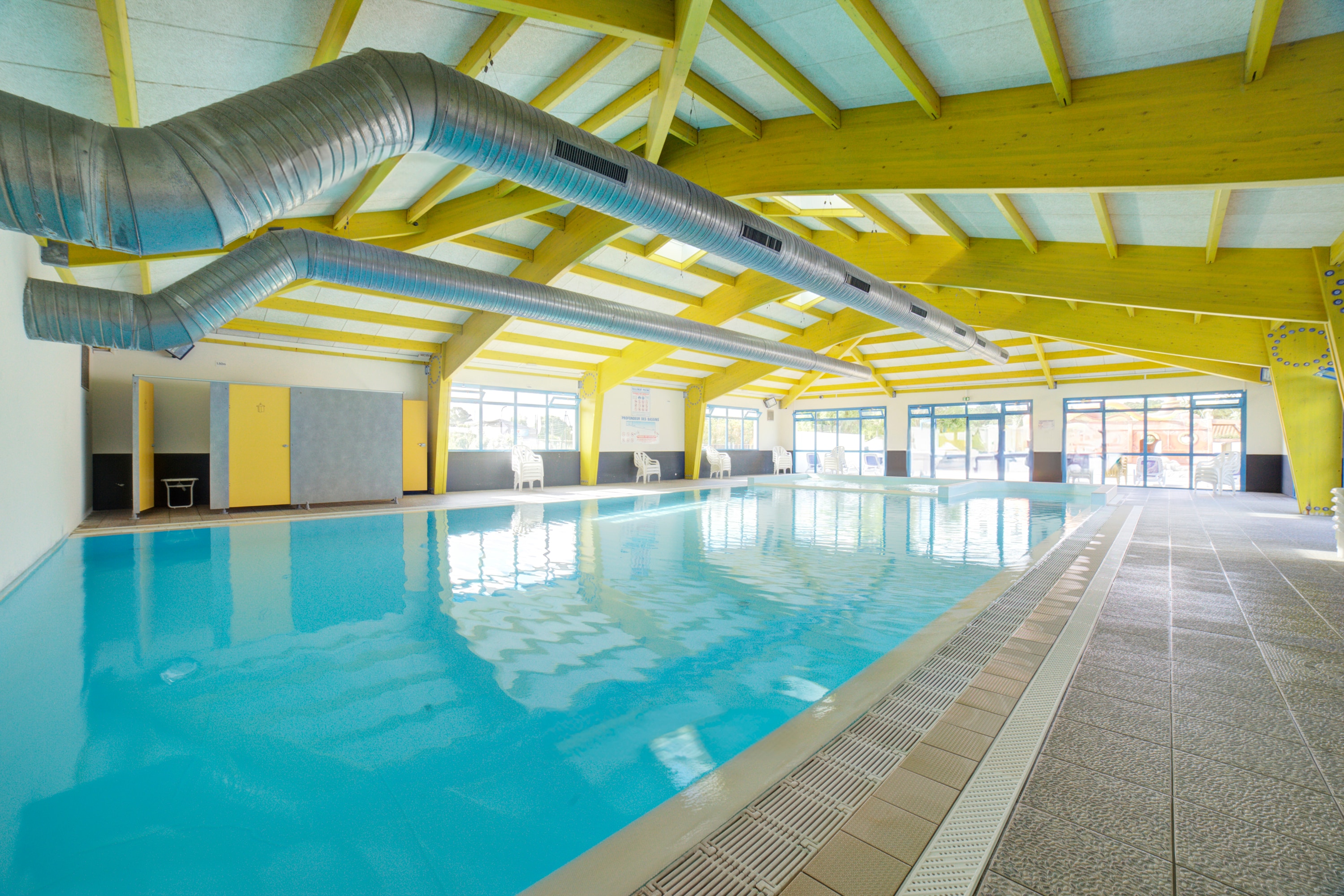 Stacaravans en plaatsen voor eigen tent/caravan liggen netjes verspreid in een groen decor. Het zwembad en omgeving zijn erg luxueus..