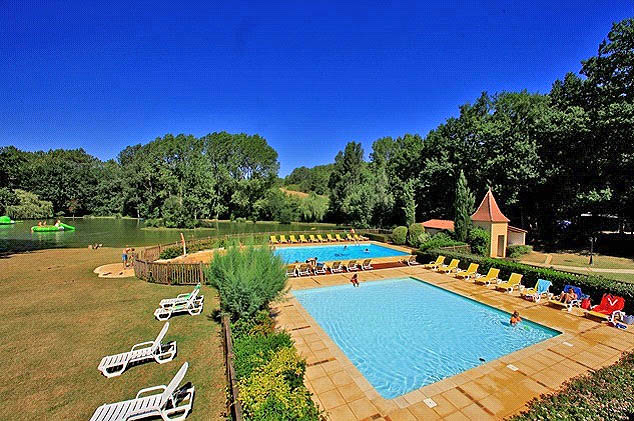 Golvend aflopende camping naar de zwembaden en het meertje.