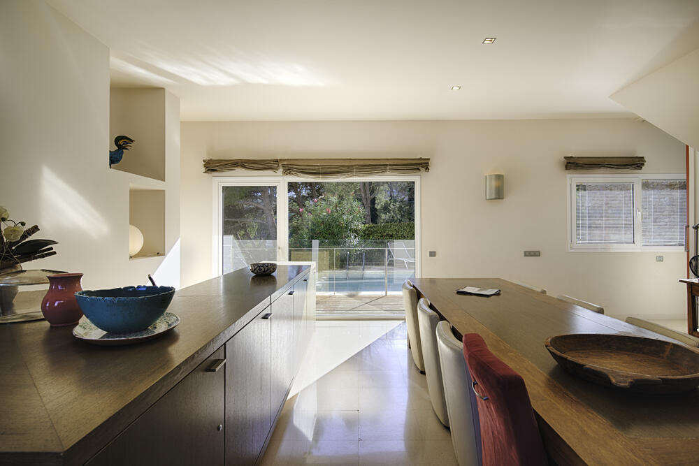 Al otro lado del salón se encuentra el comedor con una gran mesa. A continuación, se accede a la amplia cocina semiabierta, que, por supuesto, está equipada con todas las comodidades. También hay un lavadero, donde se encuentra, entre otras cosas, la lavadora. Junto al comedor se encuentra la entrada a la terraza lateral y a la bonita piscina privada.