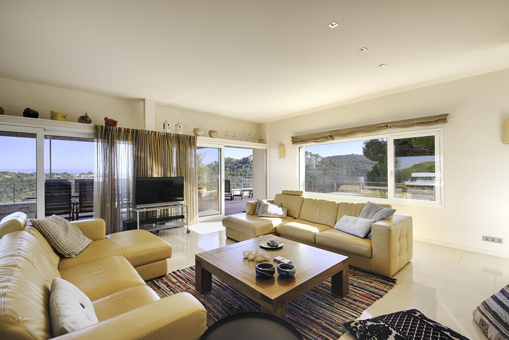 El amplio salón está equipado con un televisor inteligente y ofrece unas vistas magníficas tanto al mar como a la piscina . Junto a esta estancia se encuentra una terraza muy grande, parcialmente cubierta, equipada con un lujoso conjunto de muebles de salón, una gran mesa de comedor y una barbacoa de gas.