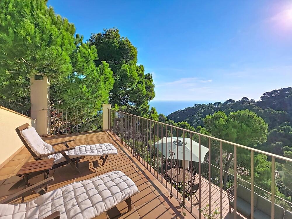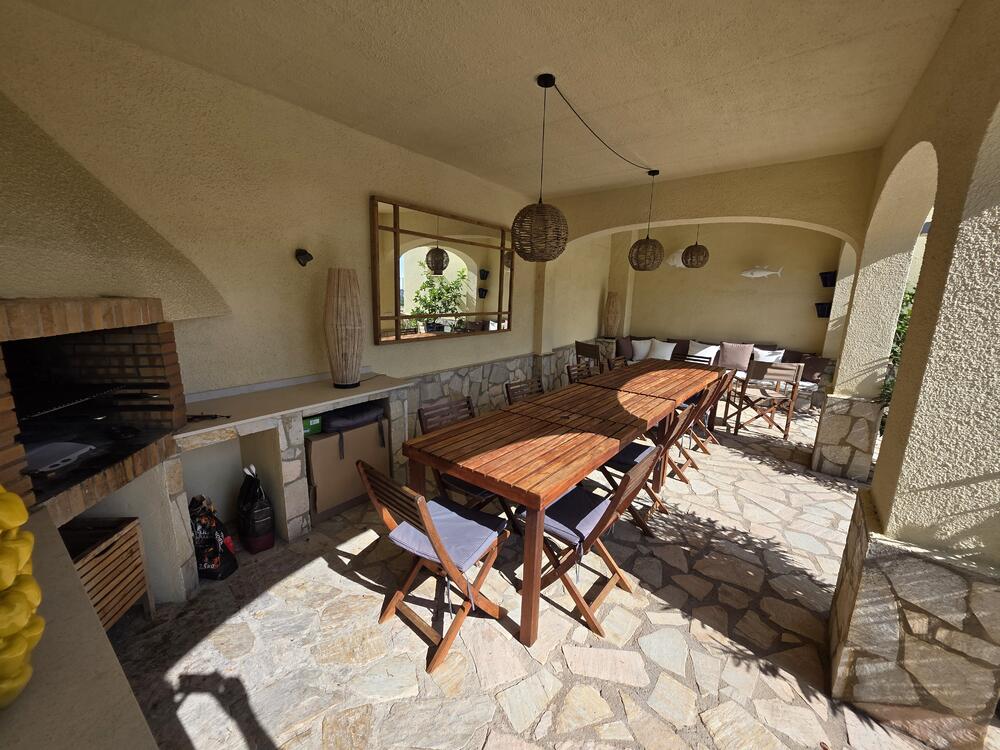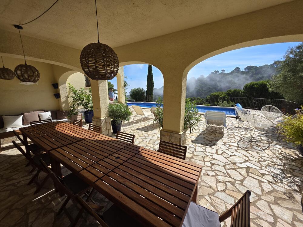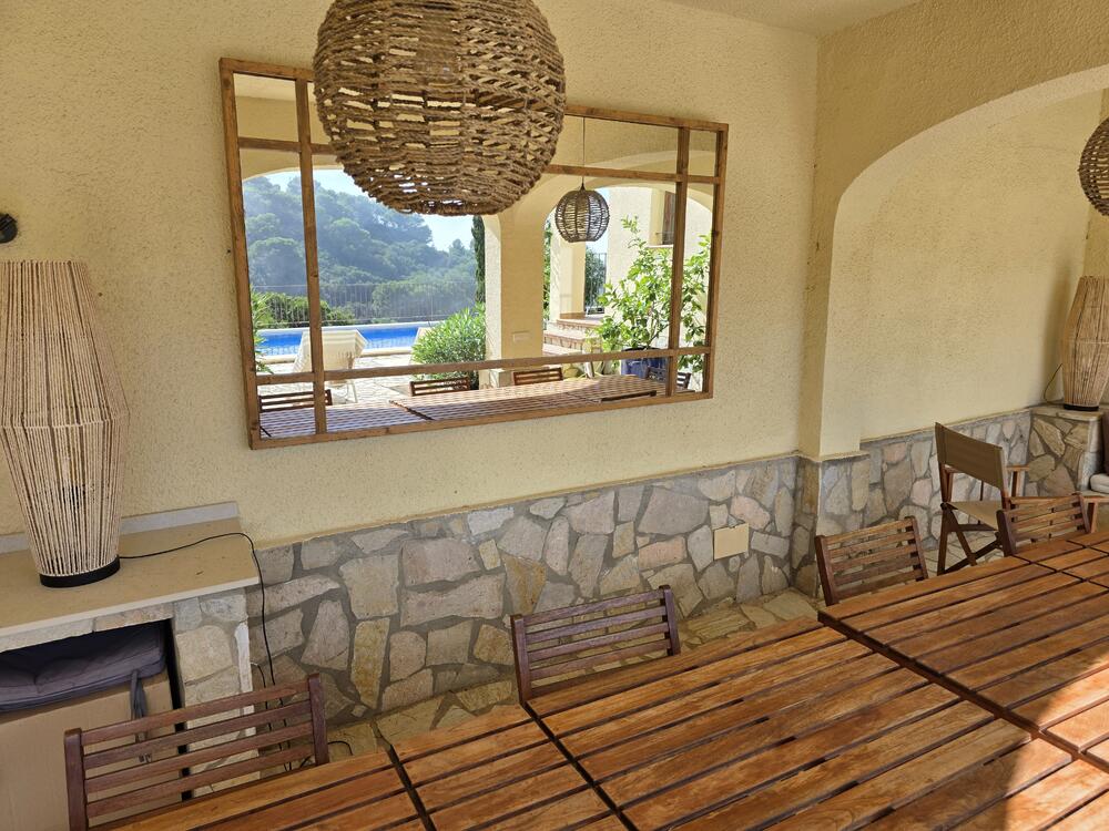 Voor het huis ligt het privé zwembad met een groot terras op het zuiden. Verder is er een overdekt gedeelte, waar u heerlijk in de schuduw kunt lunchen en barbecueën. U heeft een prachtig uitzicht op de vallei en de Middellandse Zee. Er zijn voldoende tuinmeubelen, welke van goede kwaliteit zijn.De opzet van de woning is zéér ruim.