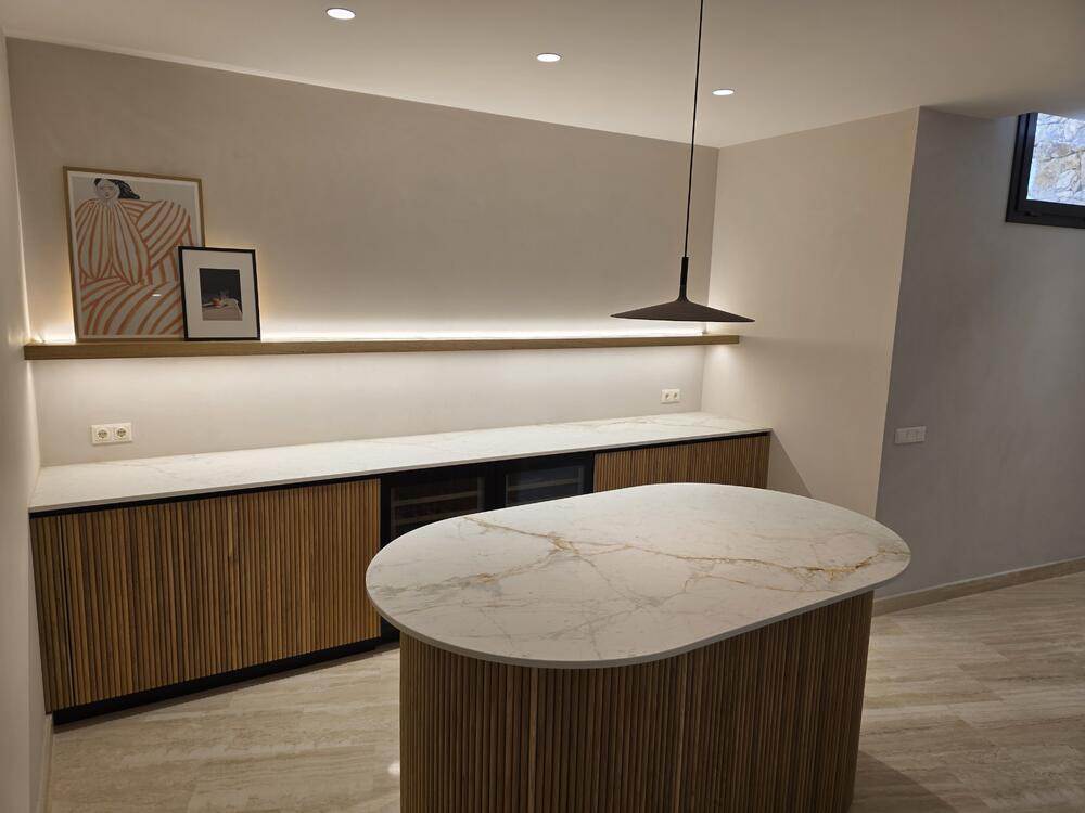 De keuken is uiteraard van alle gemakken voorzien en heeft aansluitend een eetkamer, ook met aansluiting op het buitenterras. Verder heeft het huis nog een bij-keuken / wasruimte, voorzien van wasmachine, droger, aanrecht en opslag.