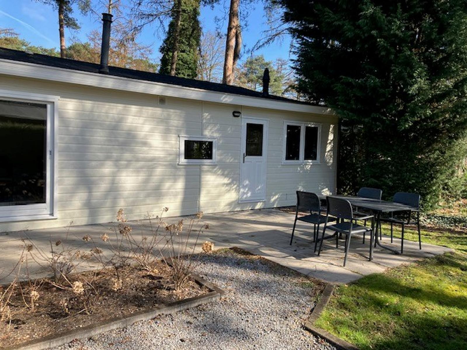 Chalet met 2 slaapkamers en een terras.