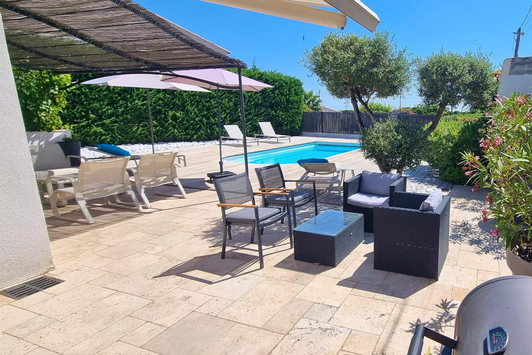 | Faciliteiten | VaatwasserWasmachineWasdrogerStrijkijzerOmheinde tuinKinderbedKinderstoelTVInternetHaardrogerAirconditioningMet zwembadVerwarmd zwembad |