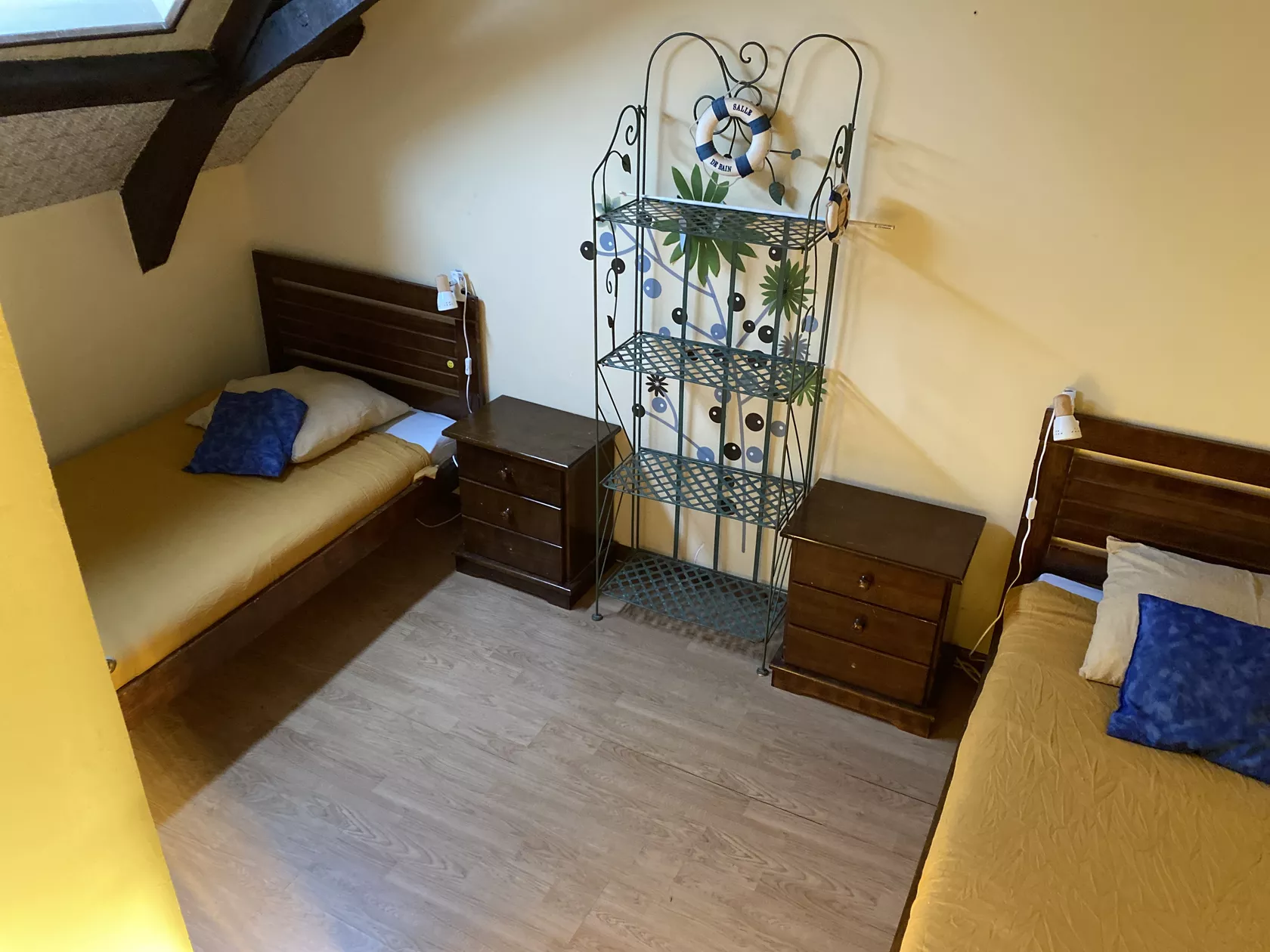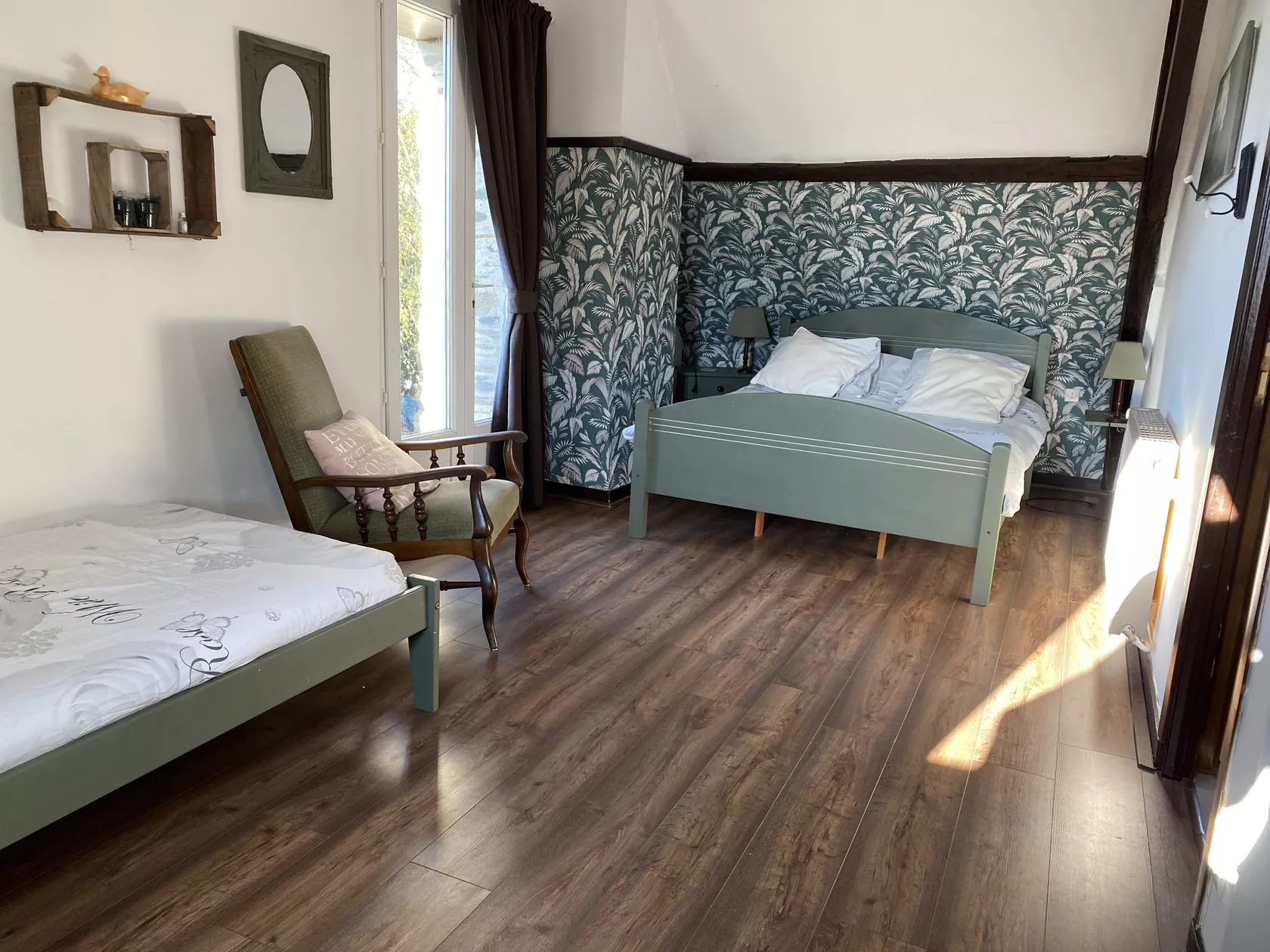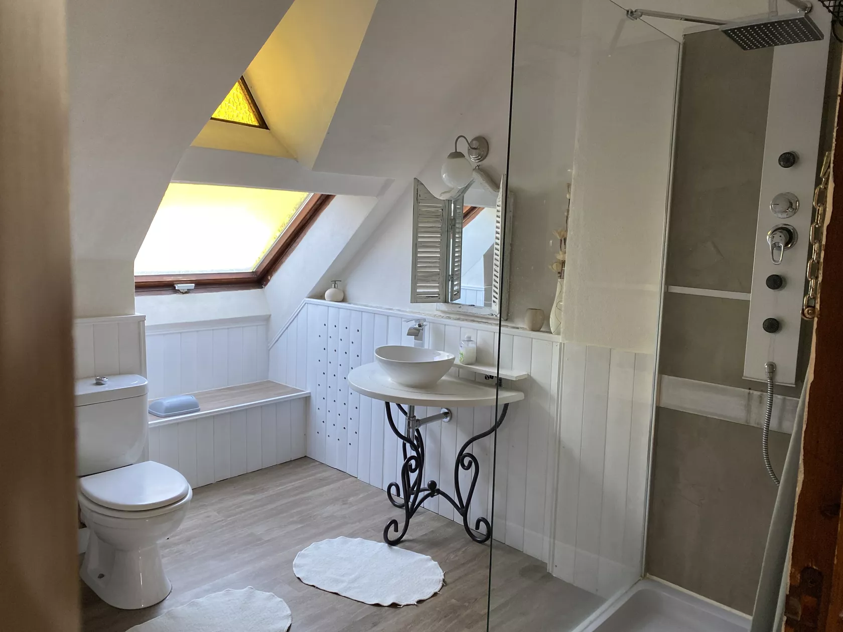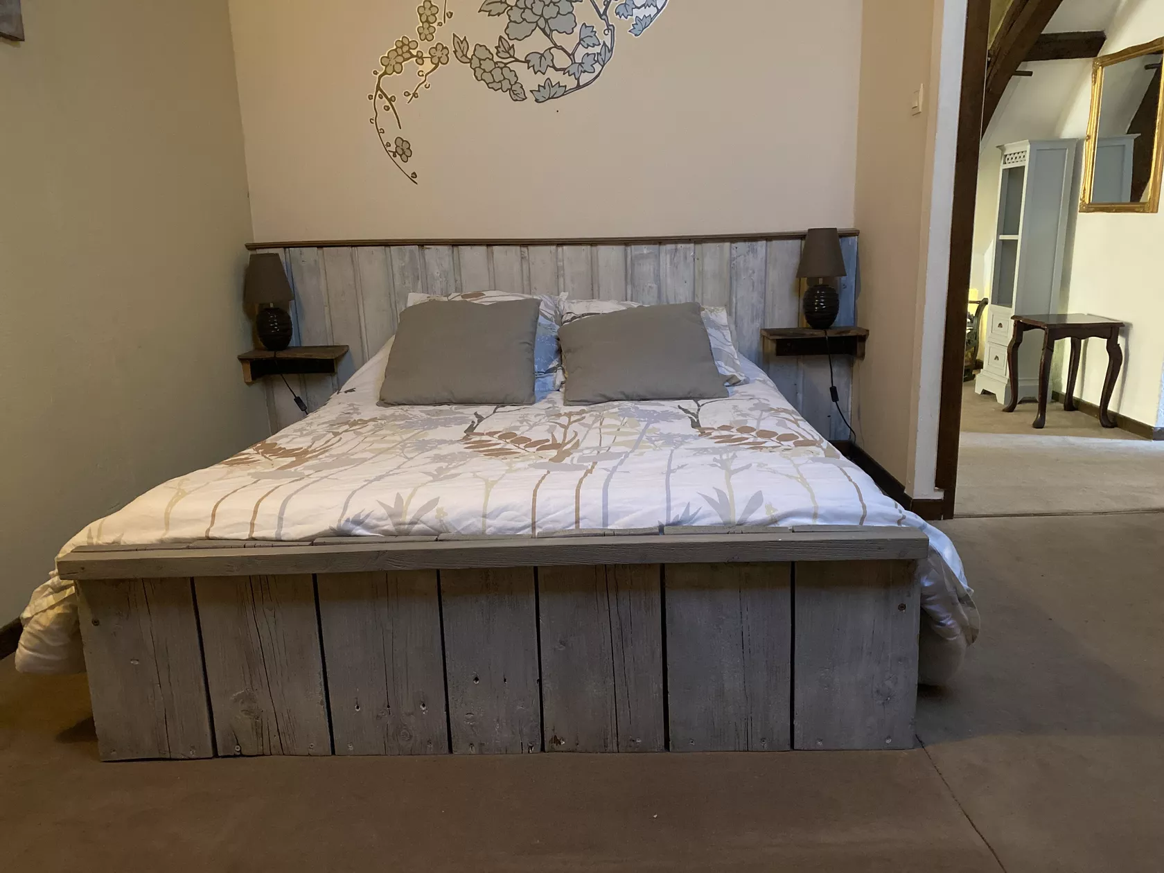 Op de eerste etage drie 2-persoons en twee 3-persoons.slaapkamers; op de eerste etage bevinden zich twee badkamers met douche en toilet en een extra toilet op de kinderkamer met wastafel.. Buiten bij het zwembad is een gedeeltelijk overdekt en ruim terras; het zwembad met ligbedden en een vrij uitzicht over landerijen en de vijver..