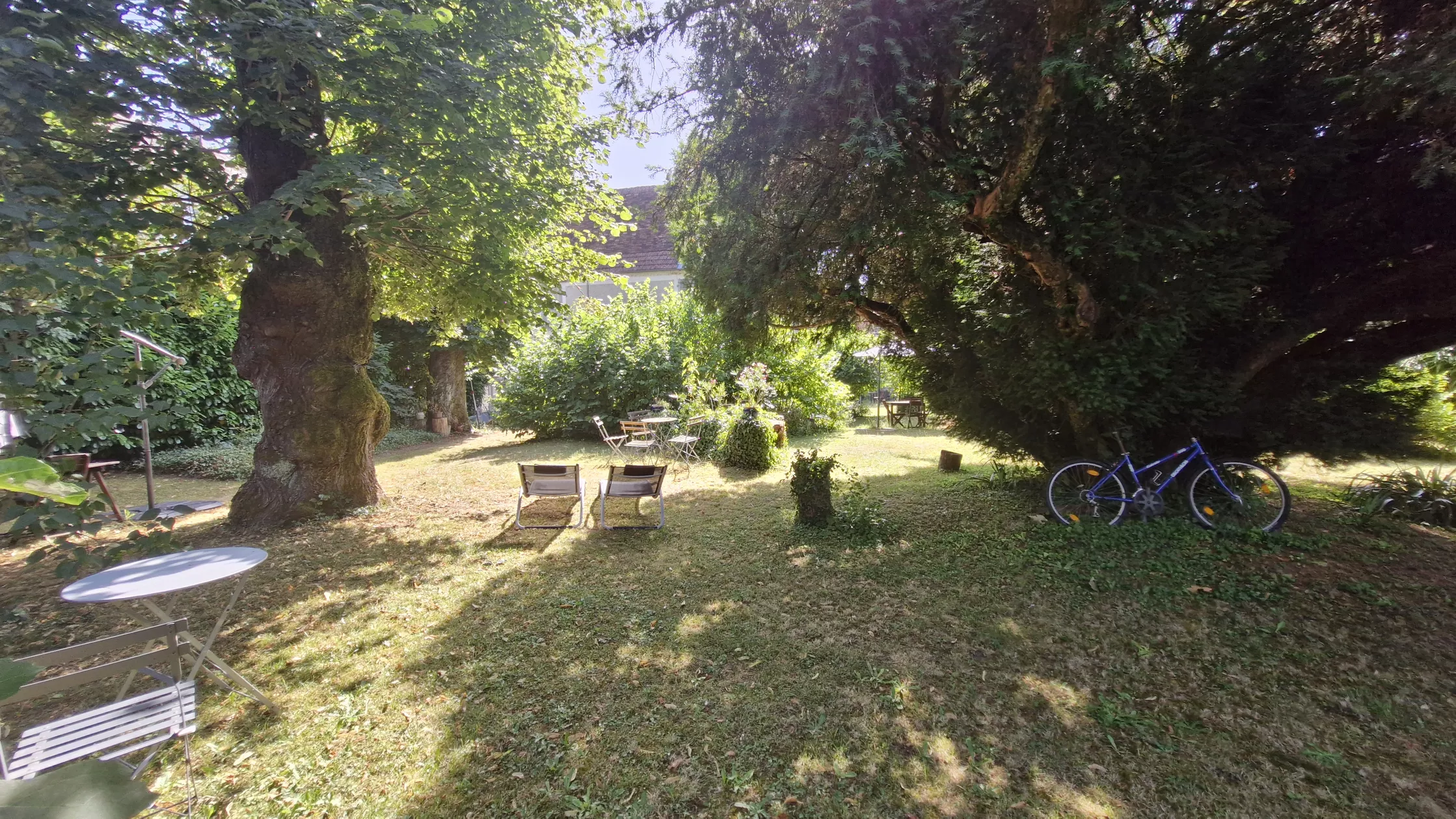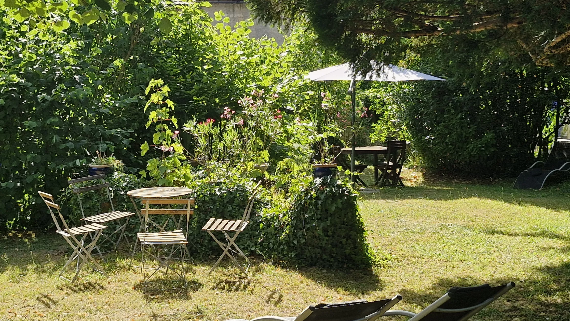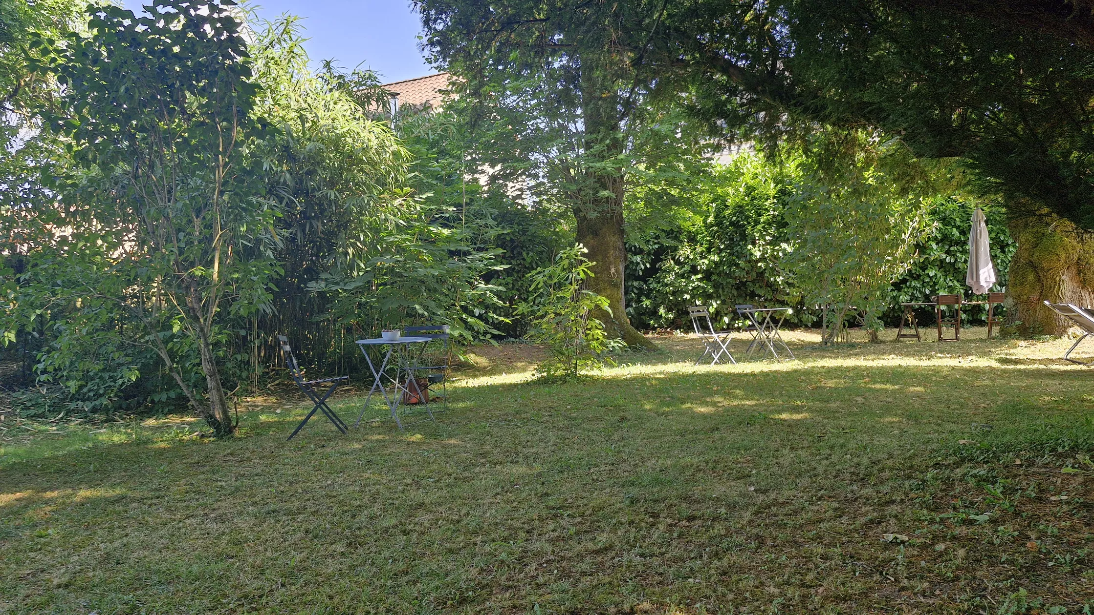 De prachtige en zeer royale tuin met z'n eeuwen oude bomen, heeft de diverse zitjes met eettafels, stoelen