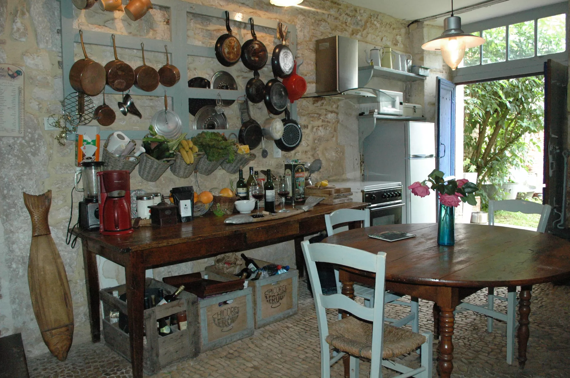 De keuken heeft een natuurstenen wasbak, ijskast en wasmachine, grote werktafel of aanrecht, ronde eettafel met 4 stoelen eromheen;