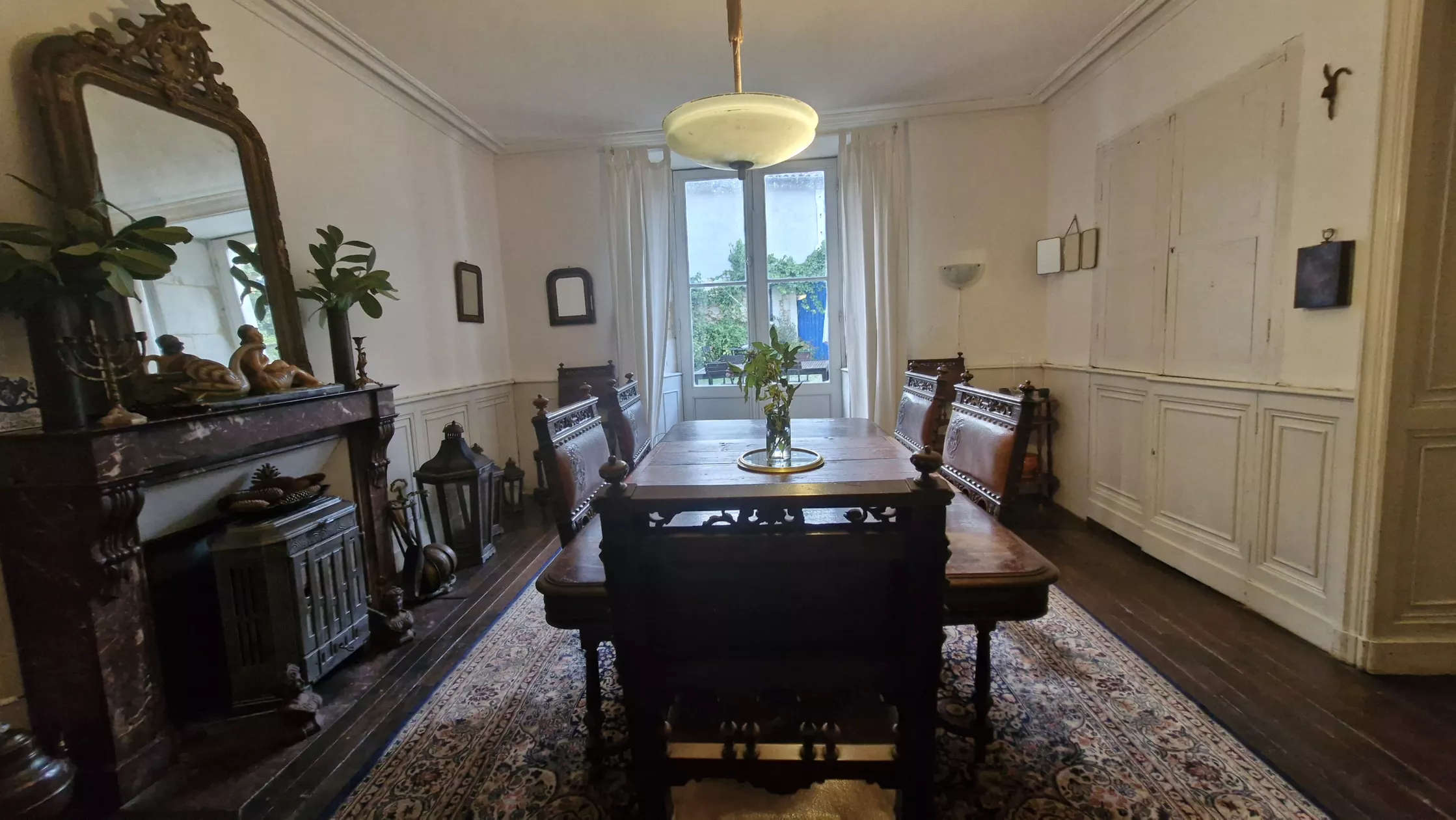 De ruime eetkamer (naast de keuken) met z'n nog originele houten vloer, is voorzien van 'n grote eettafel en stoelen en schouw, openslaande glazendeuren naar de tuin.