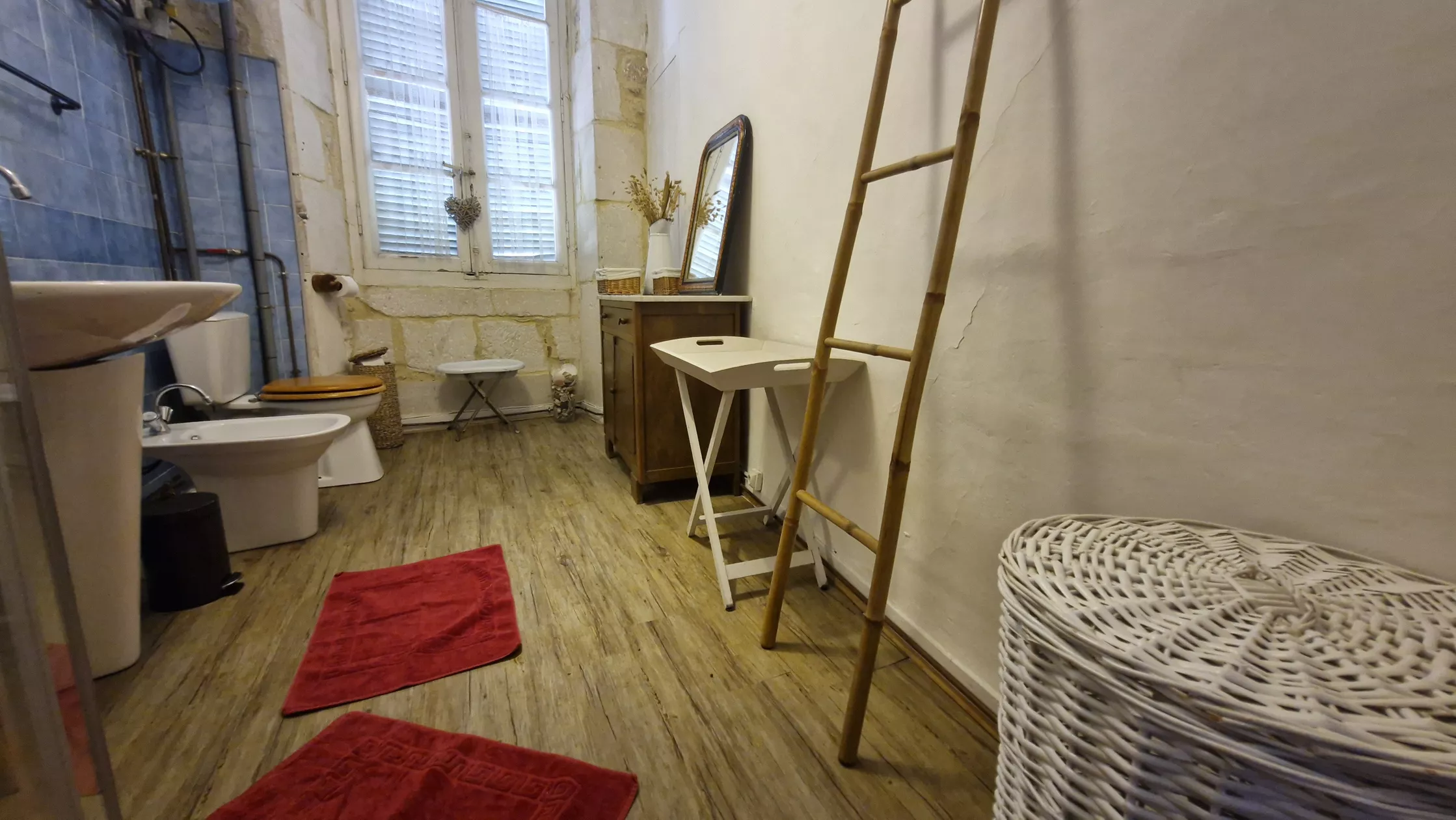 Direct naast de slaapkamer bevindt zich de badkamer welke voorzien is van een douche, wastafel, bidet en toilet, toilettafelmeubel en toilet/plateau tafel.. Tevens is er badlinnen en wc papier.
