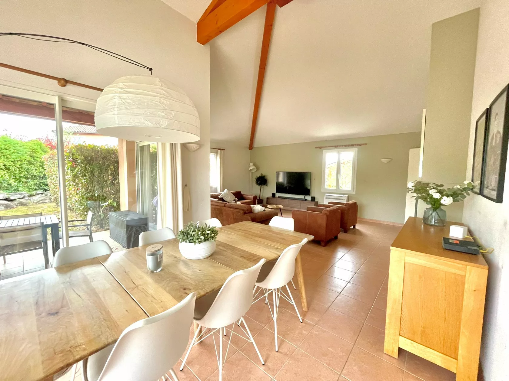 Woonkamer met ruime en comfortabel ingerichte zithoek met Smart TV en open haard. Eethoek met acht stoelen bij de schuifpui welke toegang geeft tot het overdekte terras. Ruime, open keuken met oven, vaatwasser, magnetron en koffiezet apparaten: Nespresso en Senseo. Slaapkamer met tweepersoonsbed en slaapkamer met twee eenpersoonsbedden.