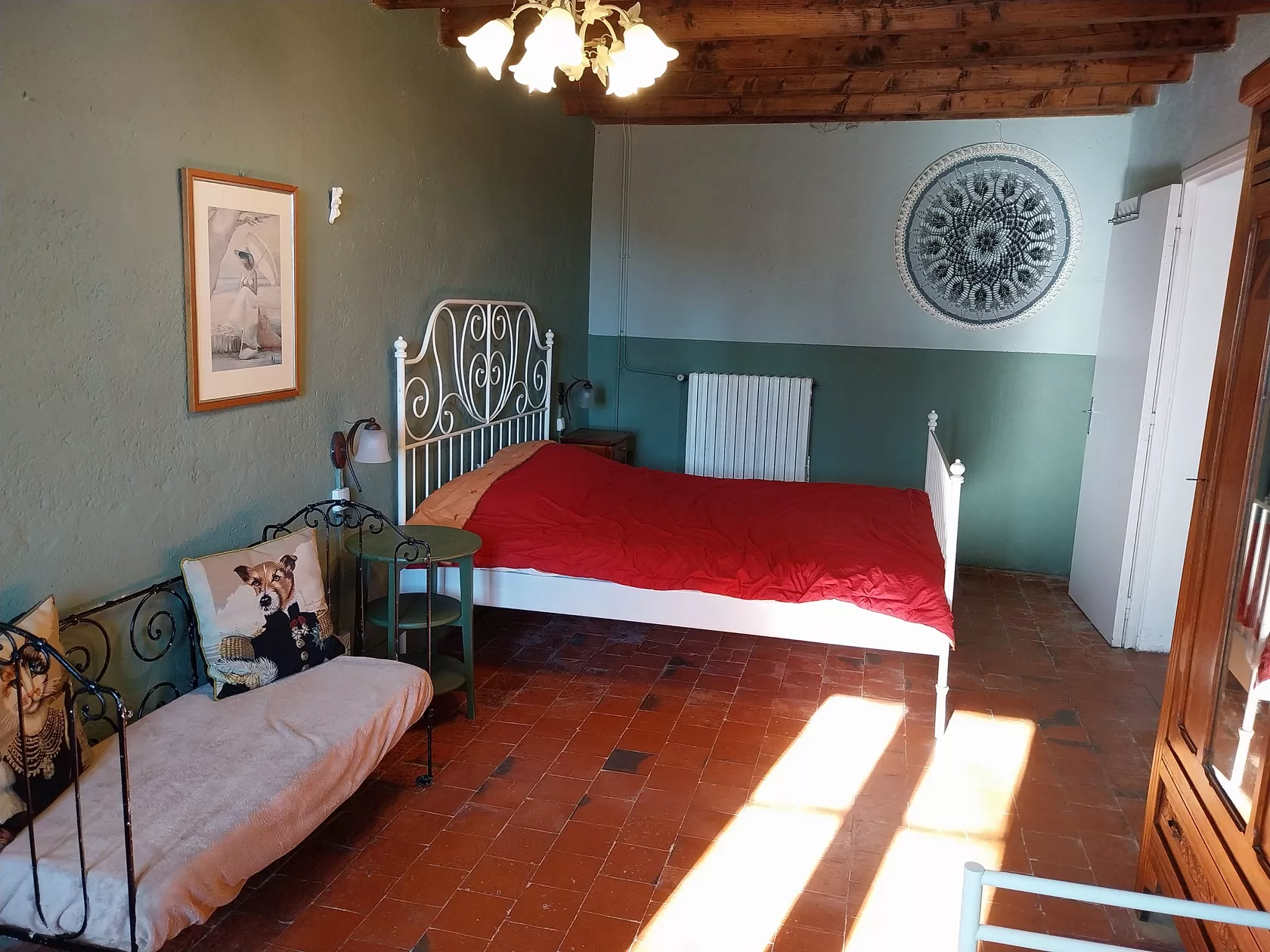 Via de woonkeuken kom u in de grote slaapkamer. Hier staan een tweepersoons en een éénpersoonsbed. Indien gewenst kunnen we er nog een kinderbedje bij zetten.
