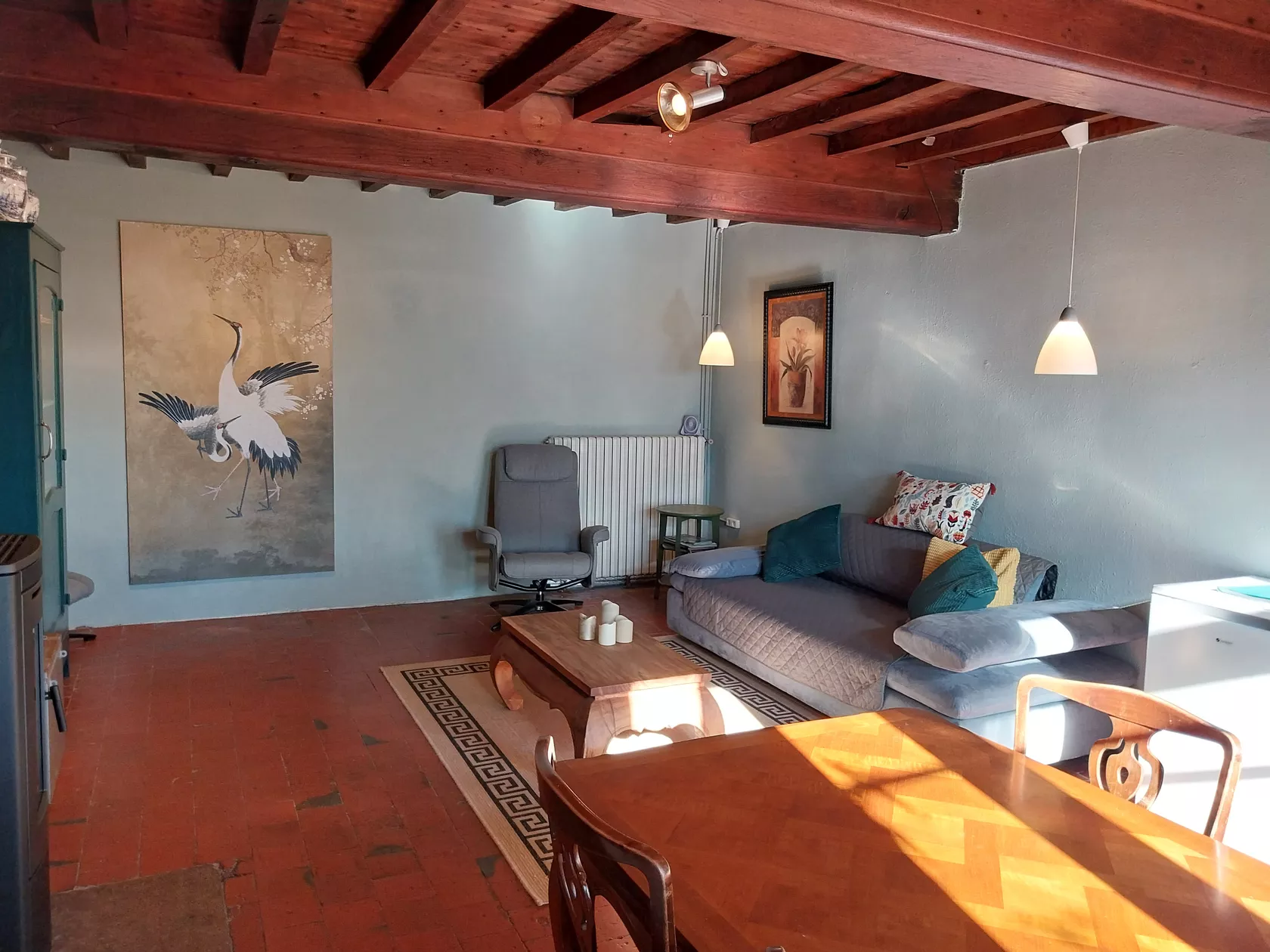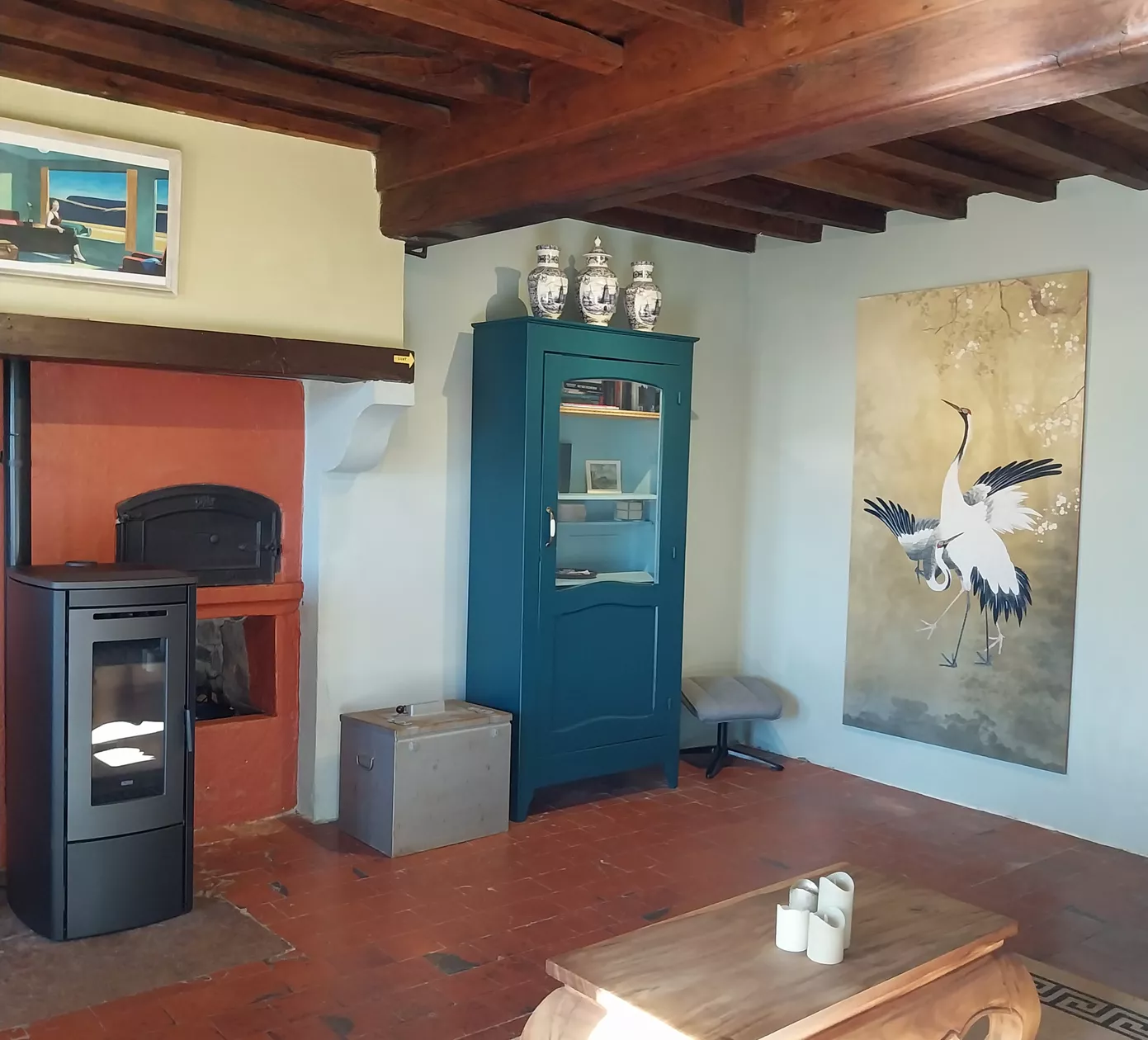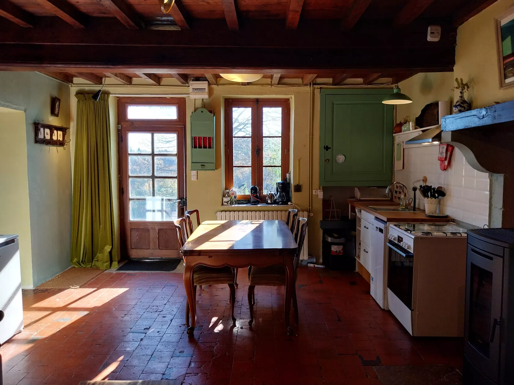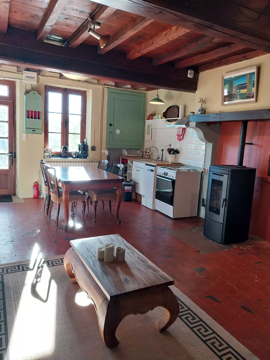 U komt het huis binnen via de woonkeuken met authentieke schouw en pelletkachel. Er staat een grote eettafel met 4 comfortabele stoelen en een ruime zitbanken met een relaxfauteuils en salontafel.