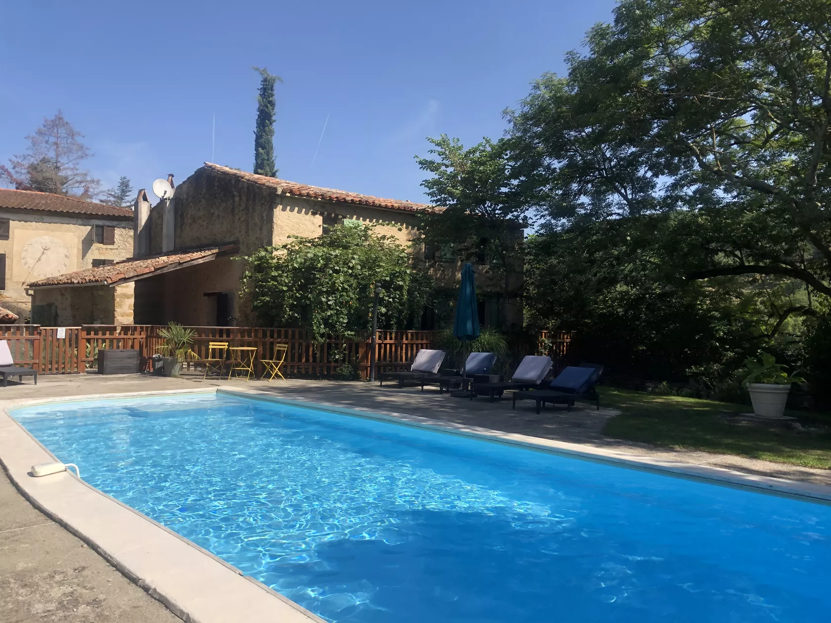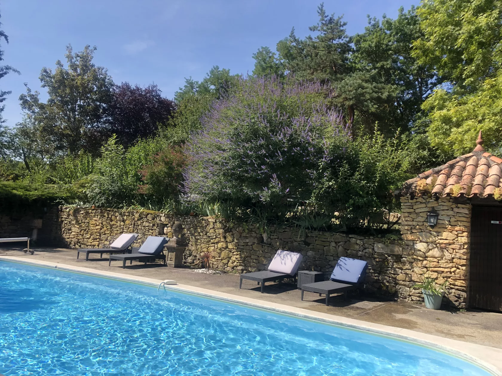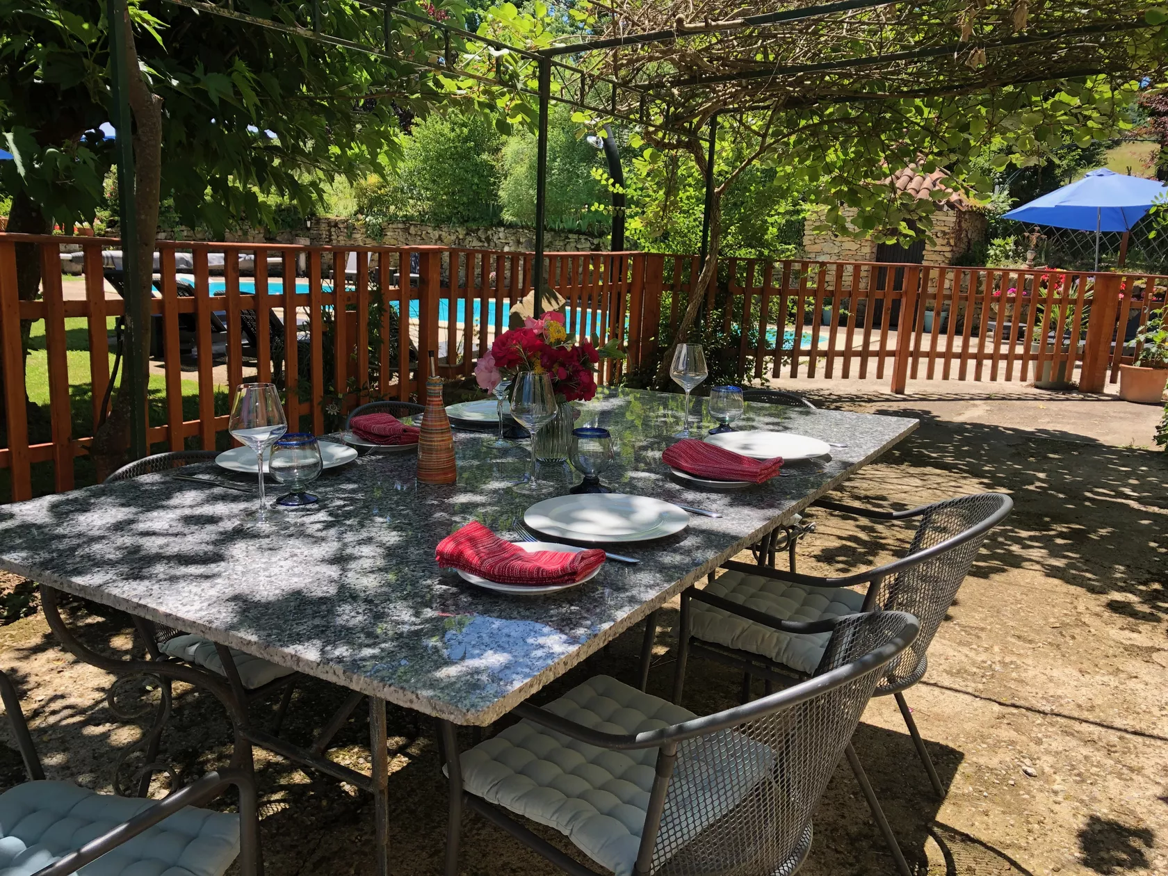 De deuren gaan open naar een geweldig terras op het zuiden, met uitzicht over het zwembad. Het terras is overdekt met heerlijk geurende rozen en klimmende kiwiplanten, die samen zorgen voor heerlijke schaduw.