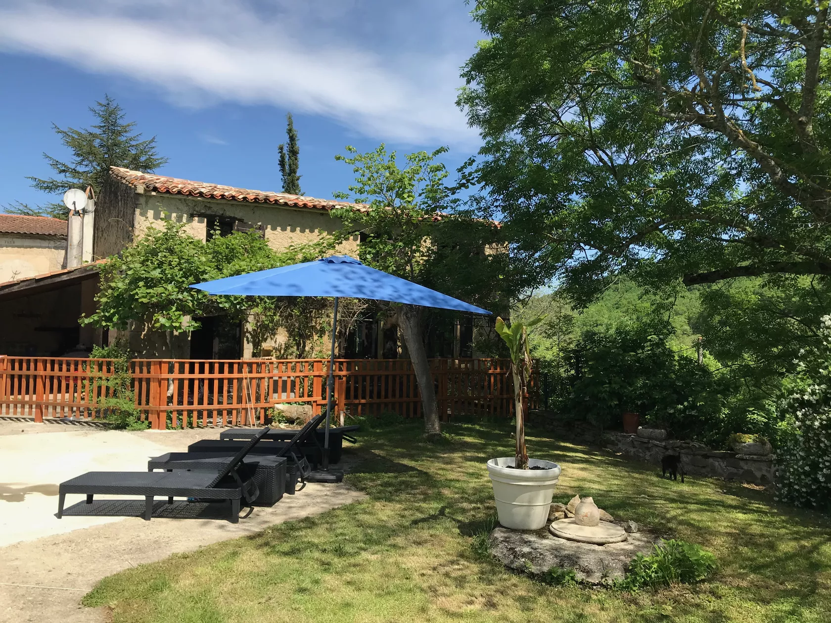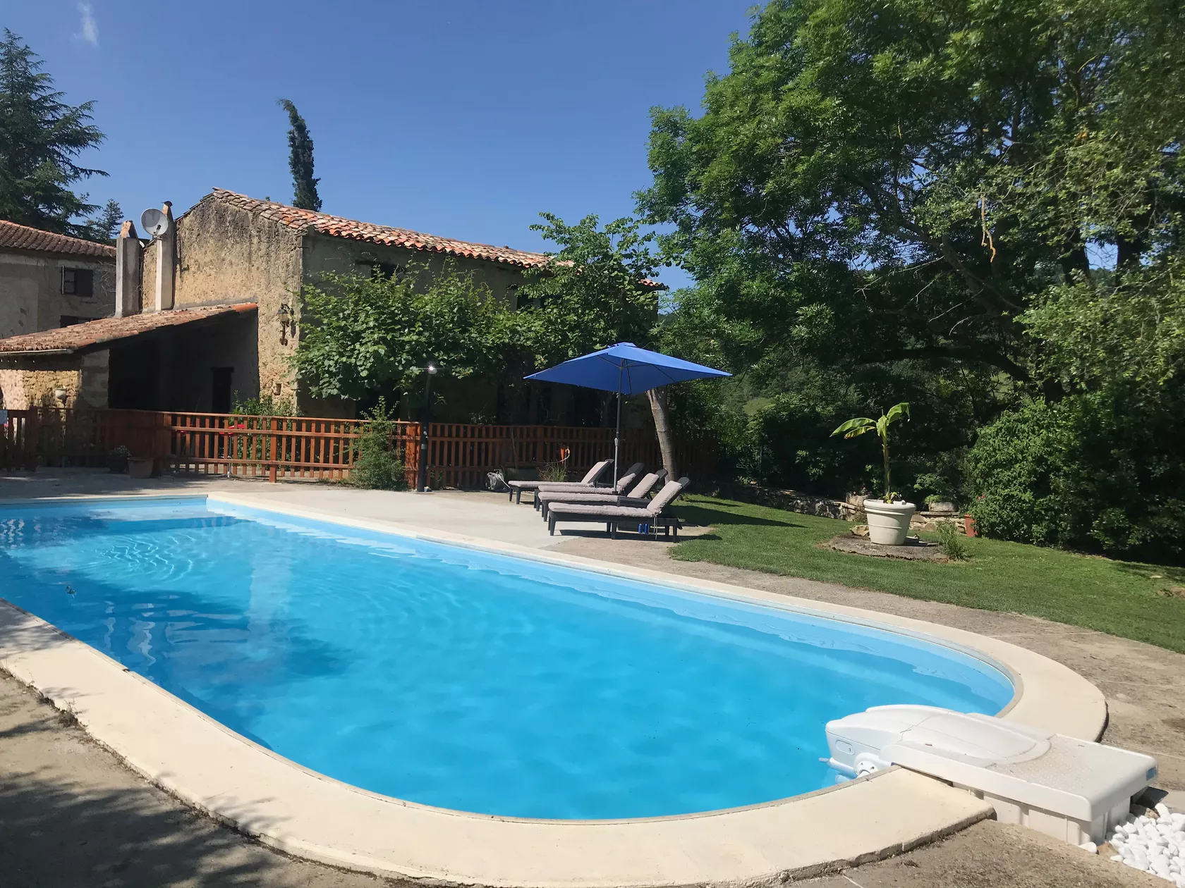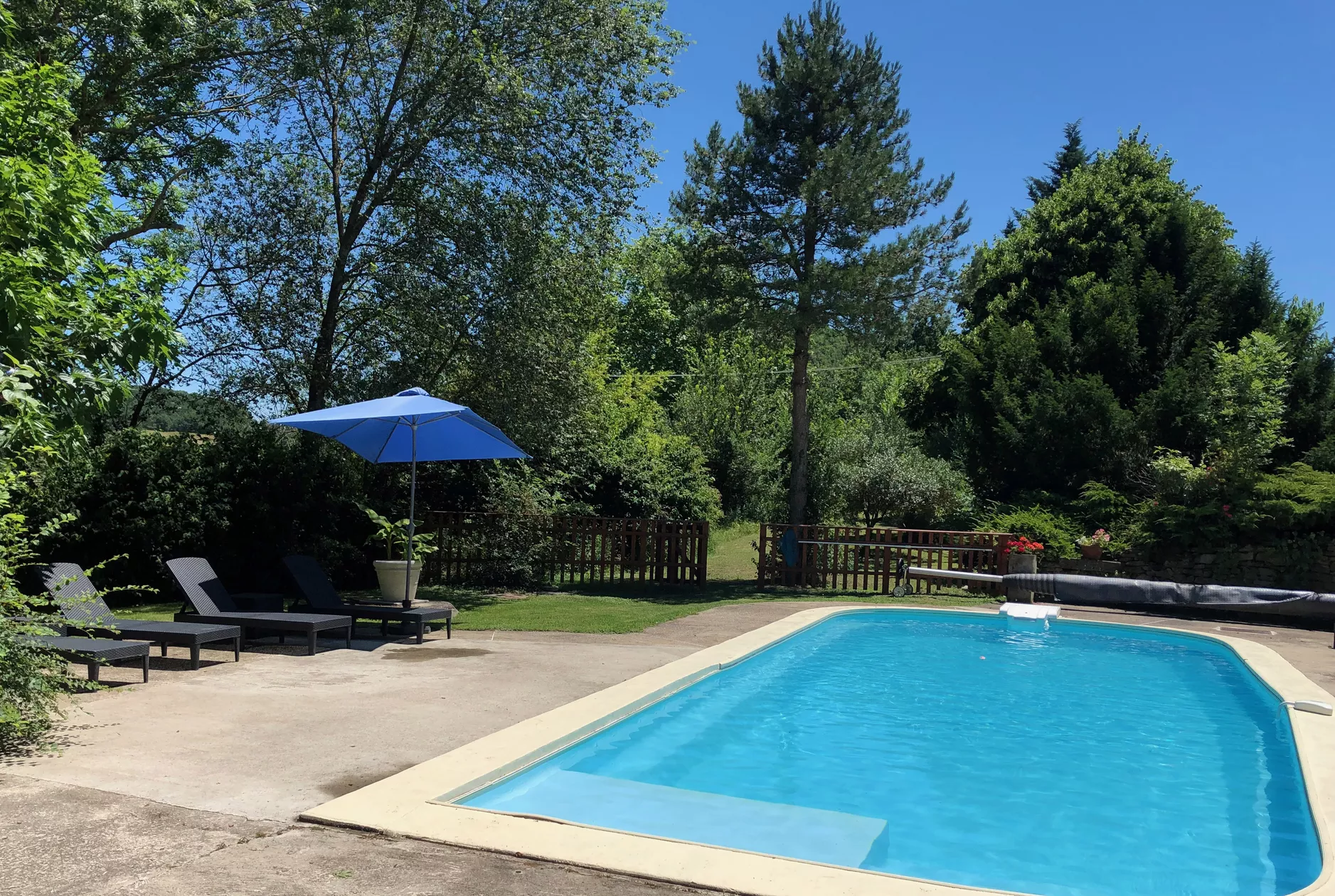 De deuren gaan open naar een geweldig terras op het zuiden, met uitzicht over het zwembad. Het terras is overdekt met heerlijk geurende rozen en klimmende kiwiplanten, die samen zorgen voor heerlijke schaduw.