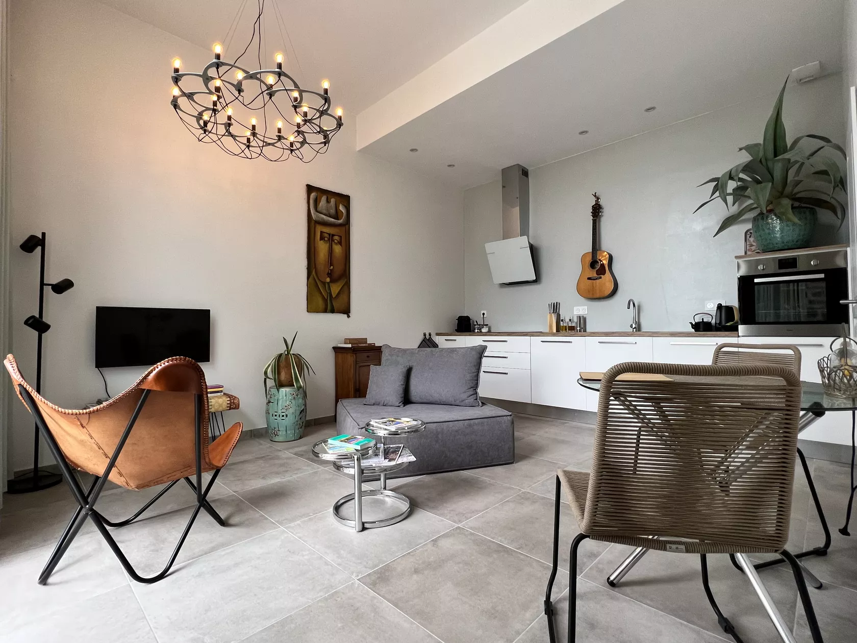 Geniet van het comfort van een luxe open keuken met eethoek, een gezellige salon met tv en airconditioning, een slaapkamer met kingsize bed en airconditioning en een moderne ensuite badkamer met royale inloopdouche.