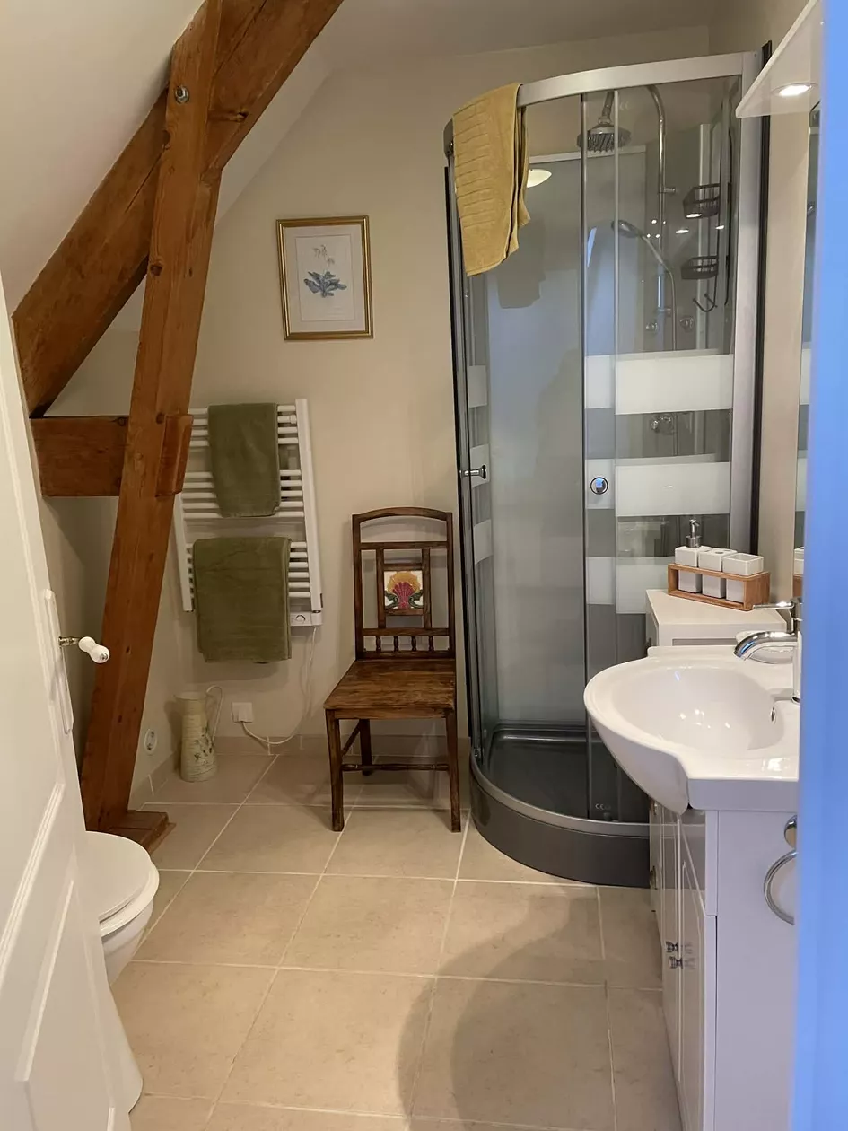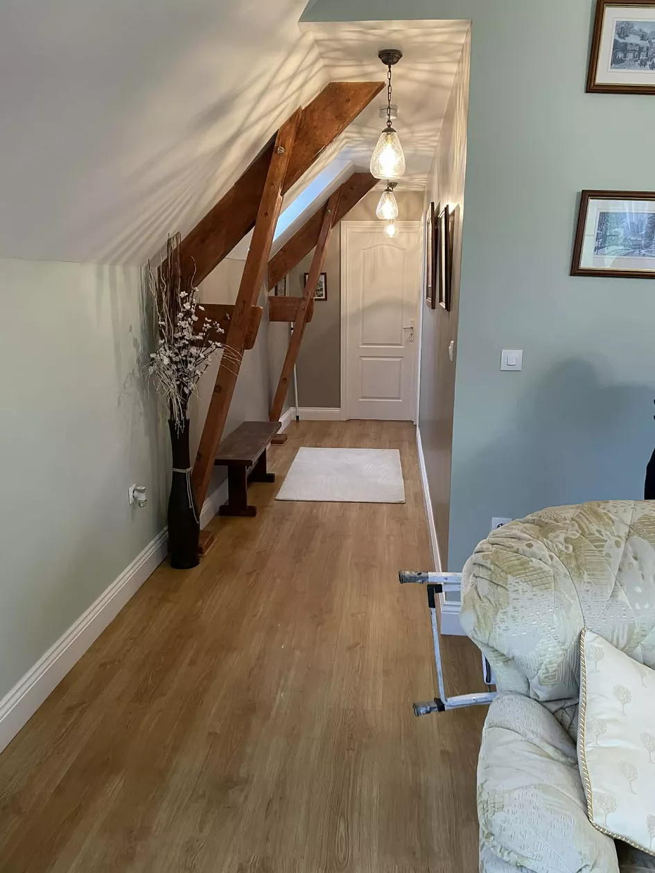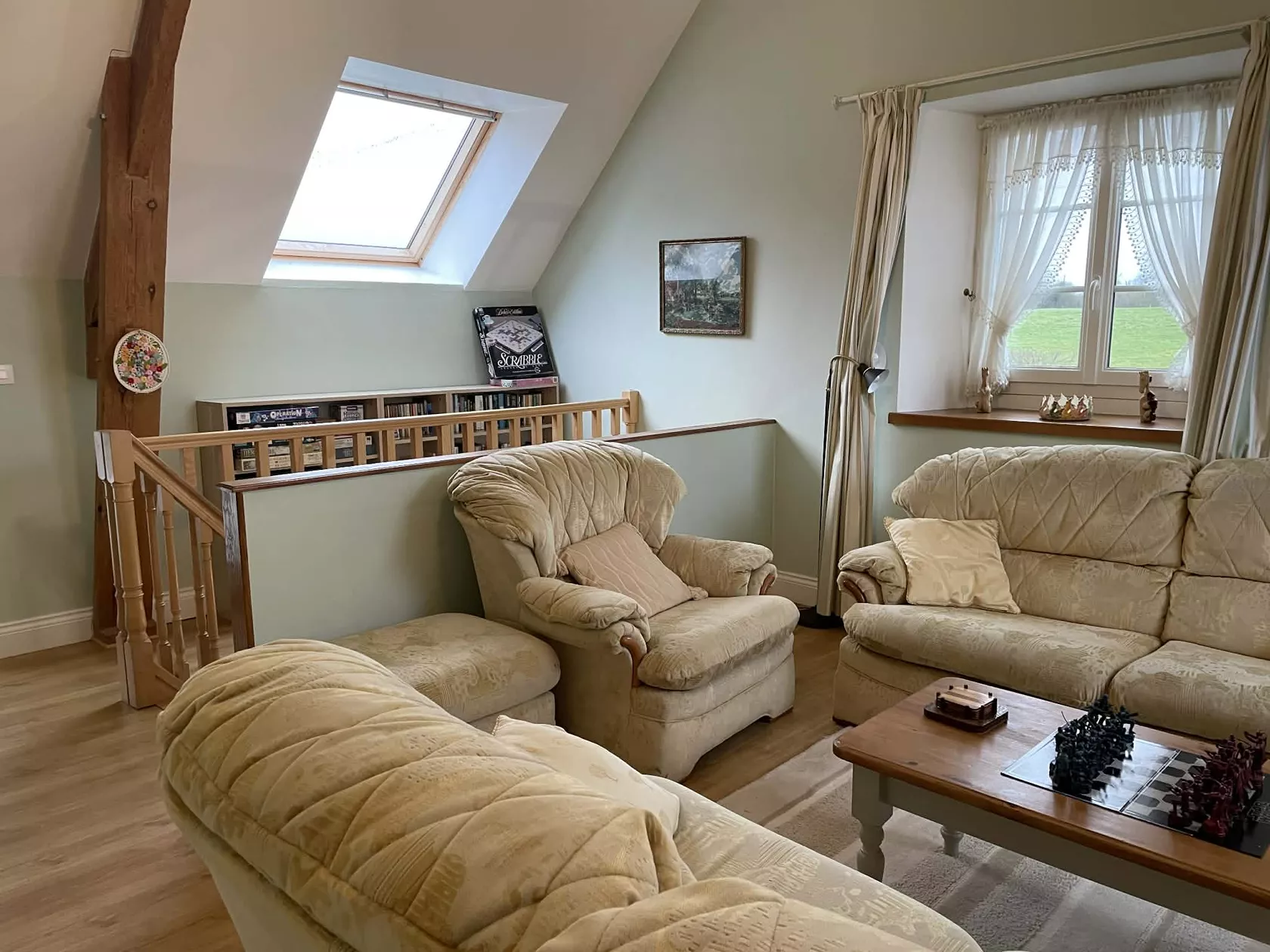 Op de eerste verdieping bevinden zich nog eens twee slaapkamers, beide met eigen badkamer met douche. Een van de slaapkamers heeft een extra eenpersoonsbed. Boven is ook een grote ontspanningsruimte met boeken, bordspellen, puzzels en een spelconsole..