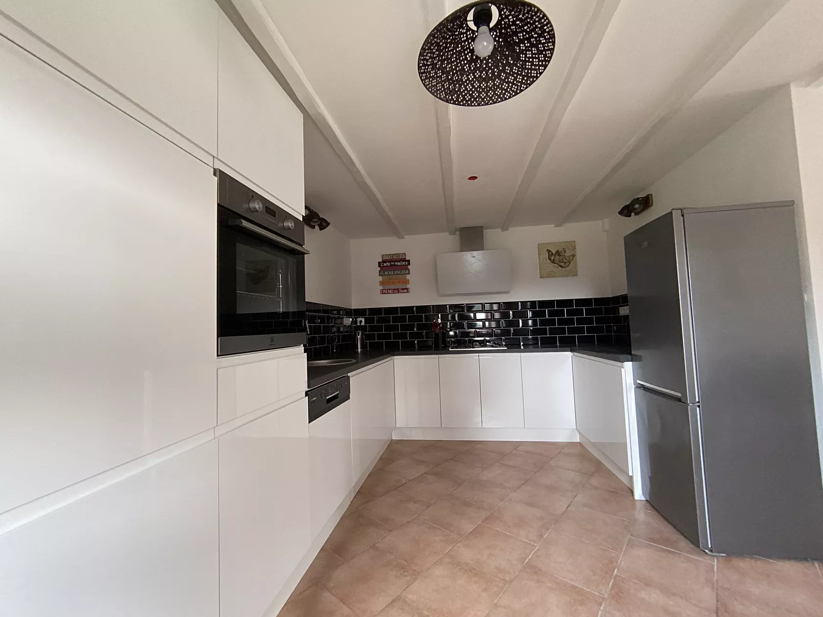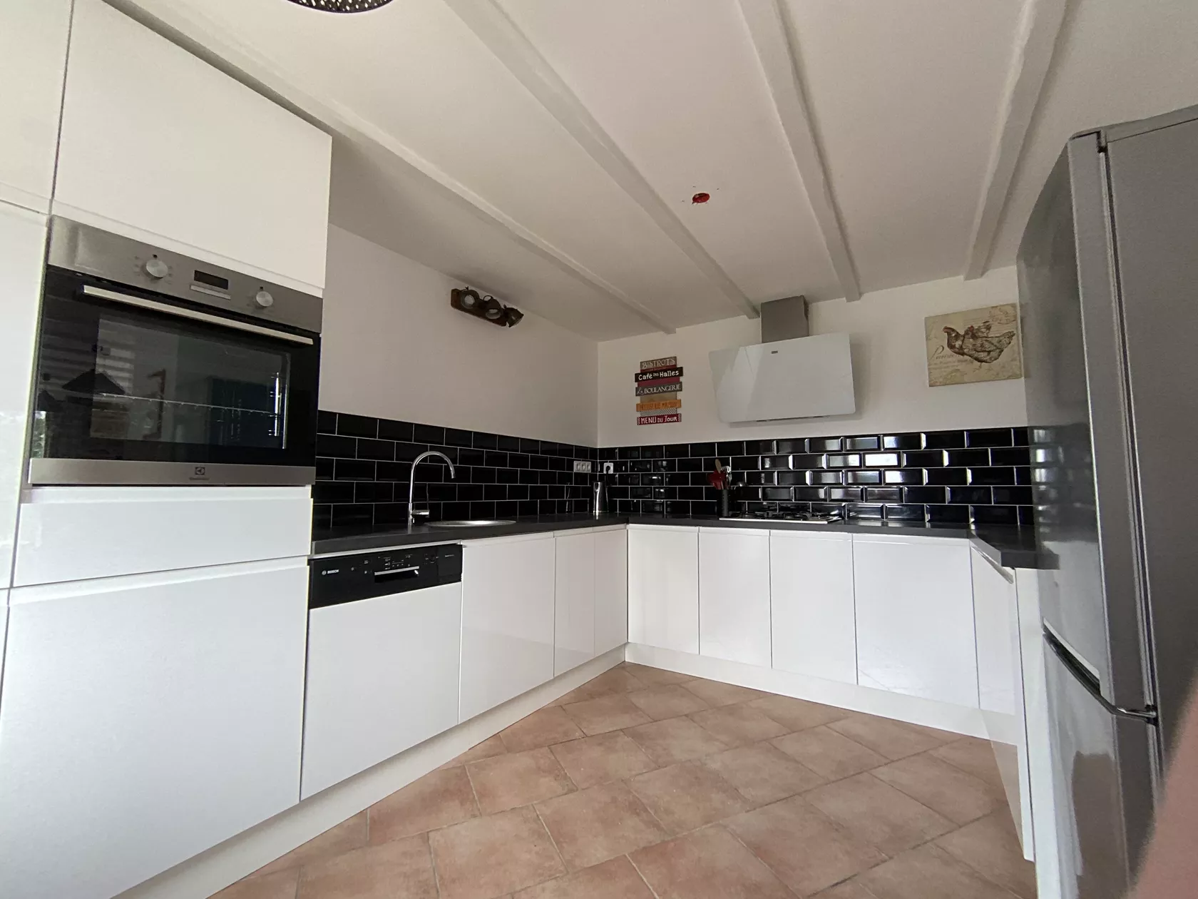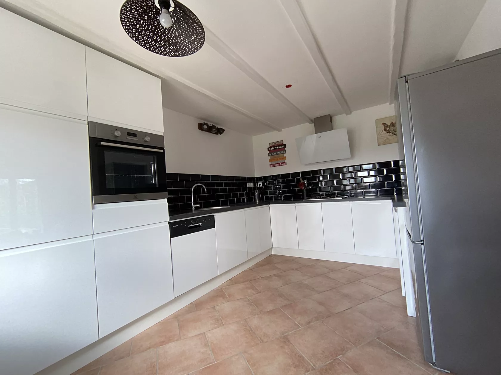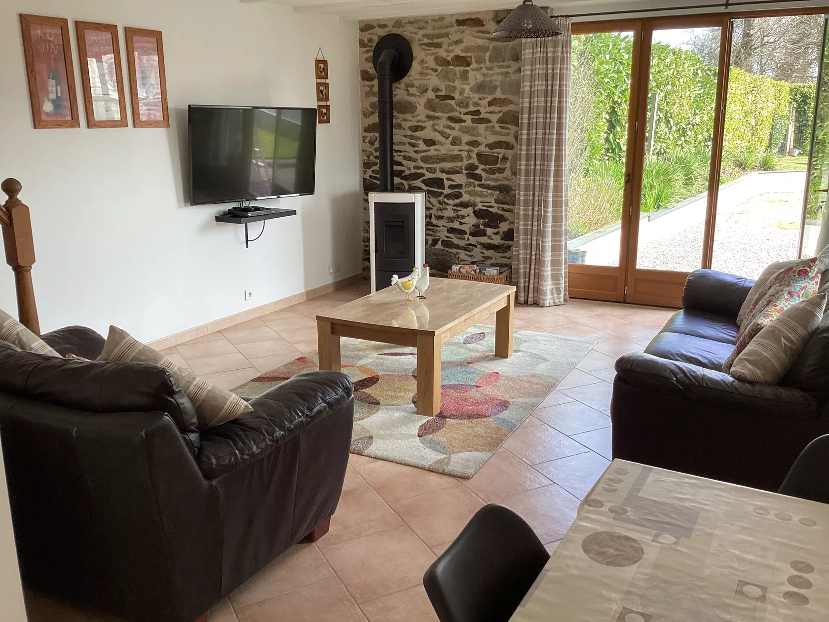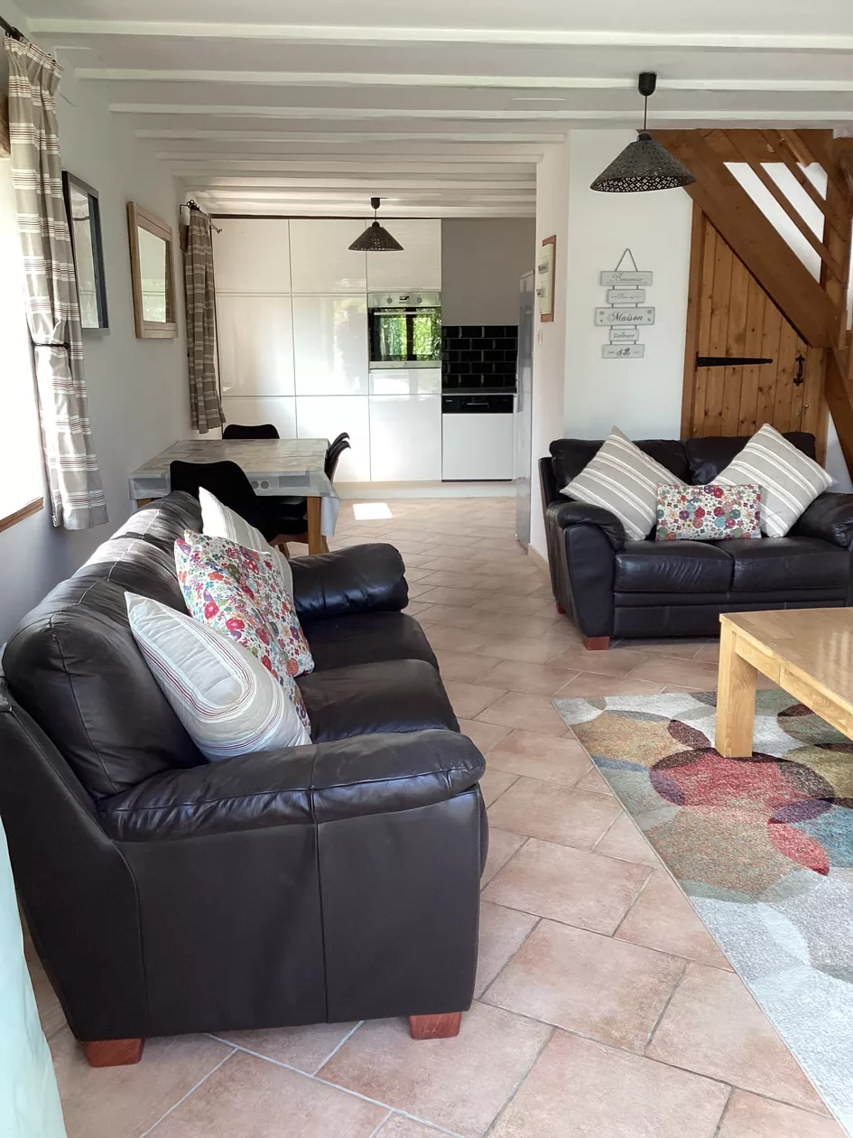 Ons Maison Fleurie heeft een open indeling met openslaande deuren naar de patio. De lounge heeft twee leren banken, ideaal om op te ontspannen terwijl u naar de flatscreen-tv kijkt met zowel Engelse als Franse tv en een dvd. De keuken heeft een boerengevoel met geïntegreerde elektrische oven, gaskookplaat, vaatwasser, wasmachine samen met een koelkast met vriesvak en magnetron. Een zeer goed gevulde keuken met alles wat u nodig heeft voor een zelfstandige vakantie.