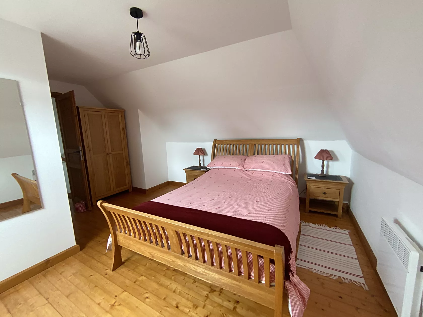 Een eettafel kijkt uit over de tuin. Boven is er een grote slaapkamer met uitzicht over de tuin met een kingsize bed, kledingkast en nachtkastjes. De tweede slaapkamer heeft twee eenpersoonsbedden, kledingkast, ladekast en nachtkastjes. De twee slaapkamers delen een nieuw ingerichte badkamer met grote inloopdouche, badmeubel en toilet.