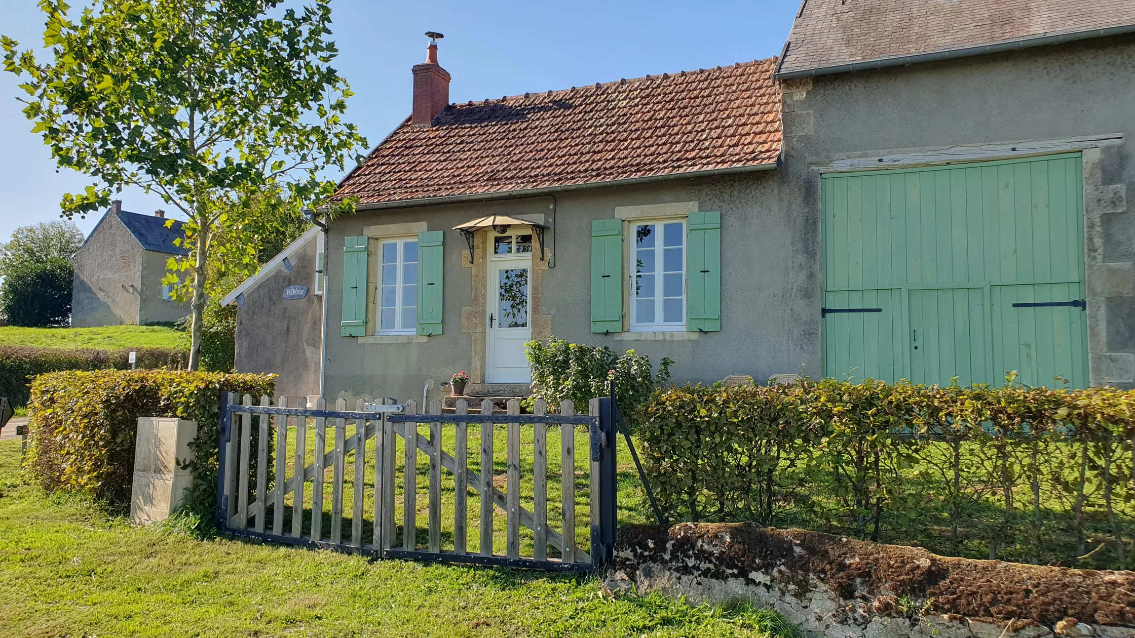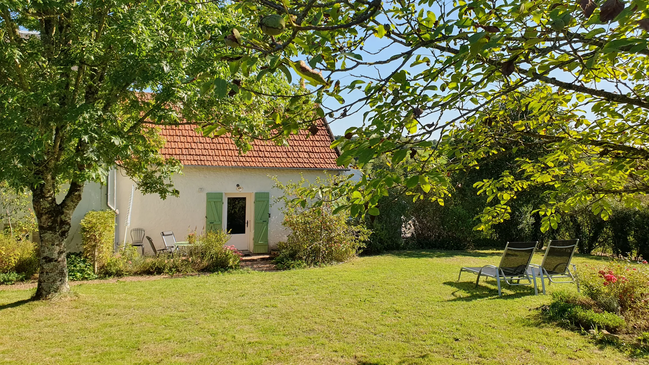 Een blik naar buiten, door één van de roederamen, doet je versteld staan van het prachtige heuvellandschap met zijn weiden, hagen, solitaire eiken en de witte Charolais koeien. De tuin van 3500 m2 biedt veel privacy.