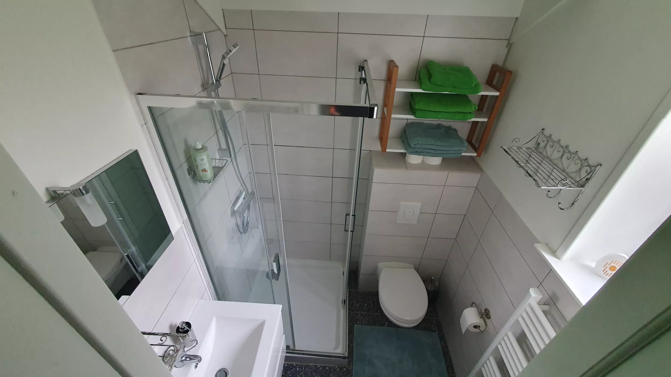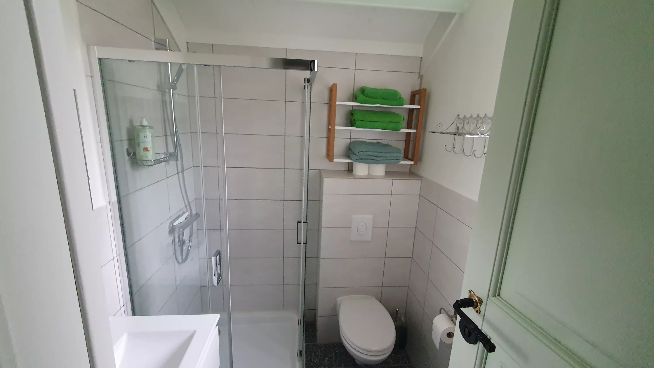 De badkamer met toilet, douchecabine en wasbak is voorzien van lichte kleuren en voldoet ruimschoots aan de huidige sanitaire eisen.