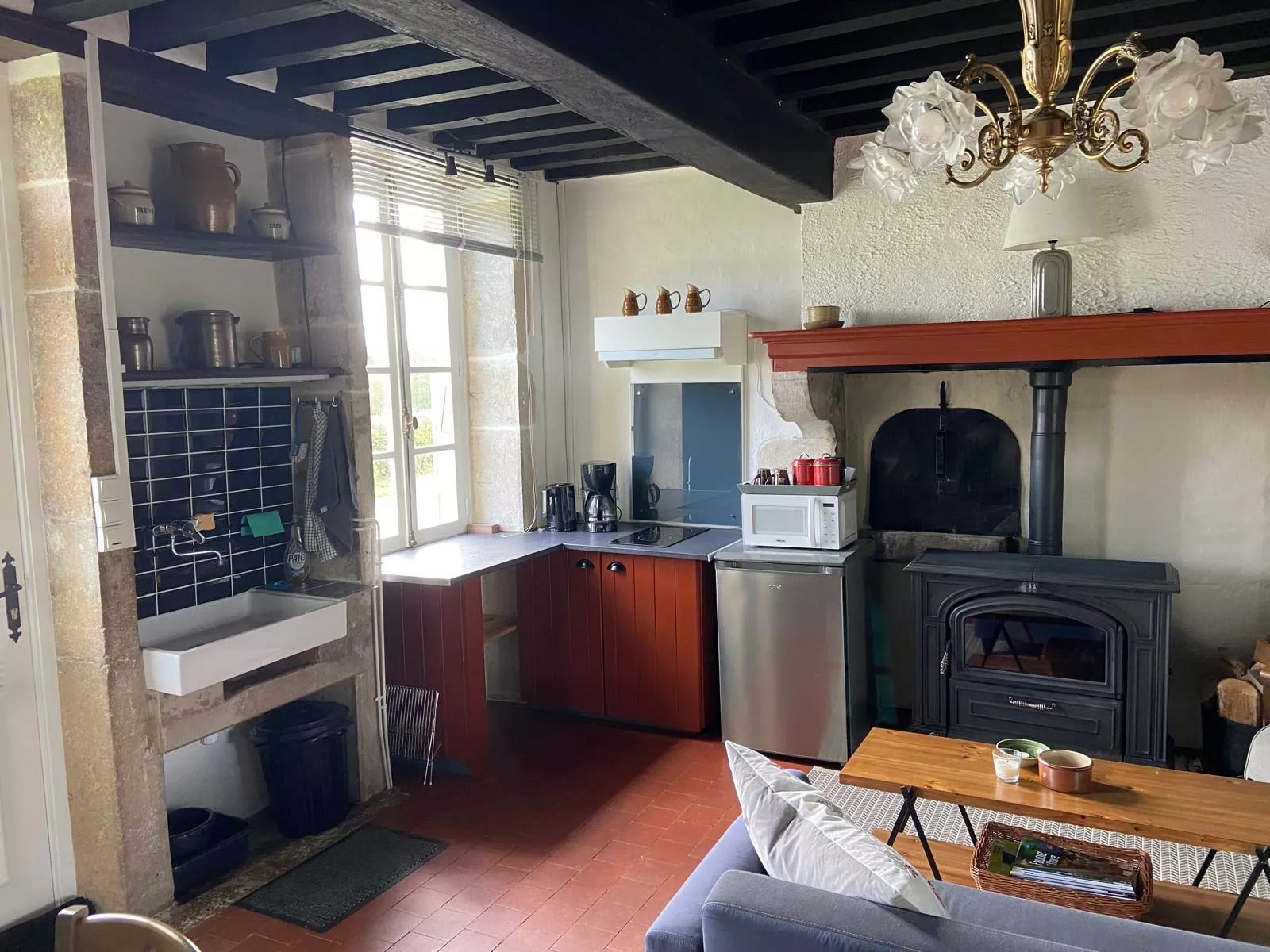 De oorspronkelijke broodoven met gietijzeren deur is nog aanwezig en geeft samen met de houtkachel onder de kalkstenen schouw een gevoel alsof je honderd jaar terug in de tijd bent.
