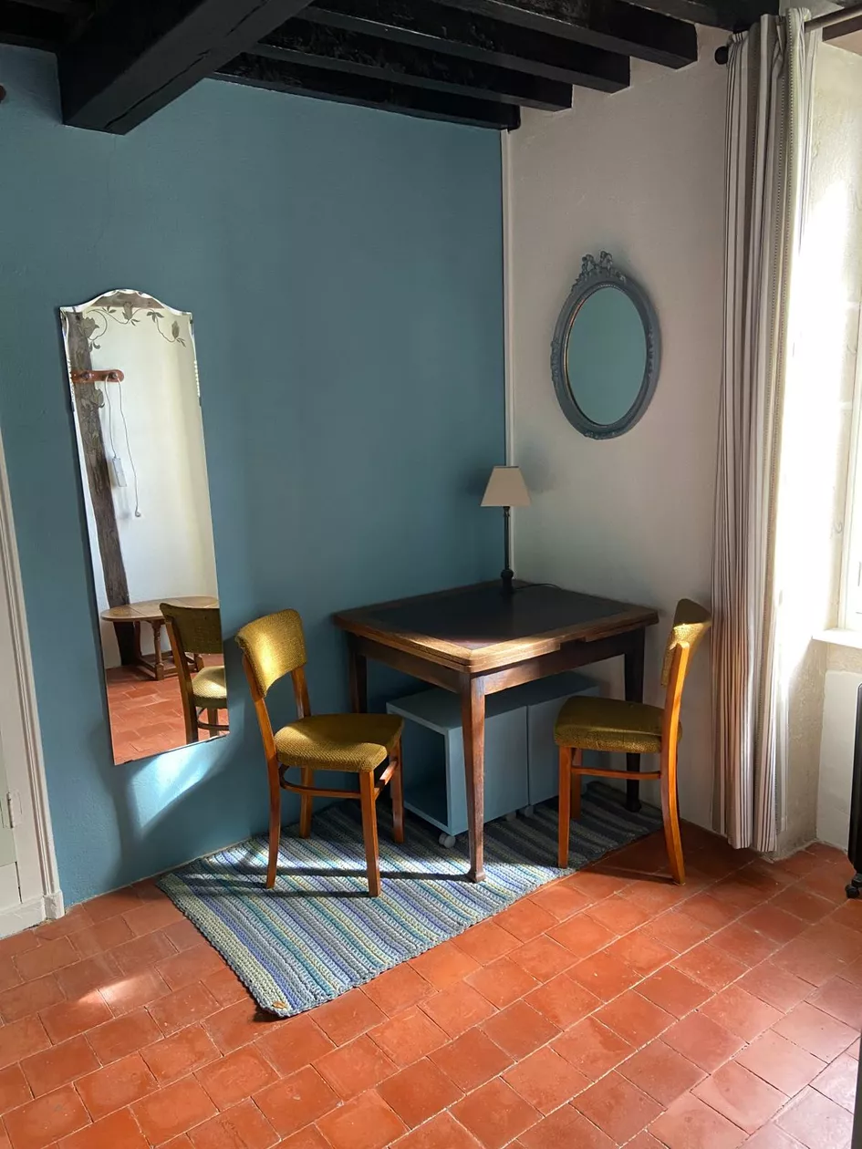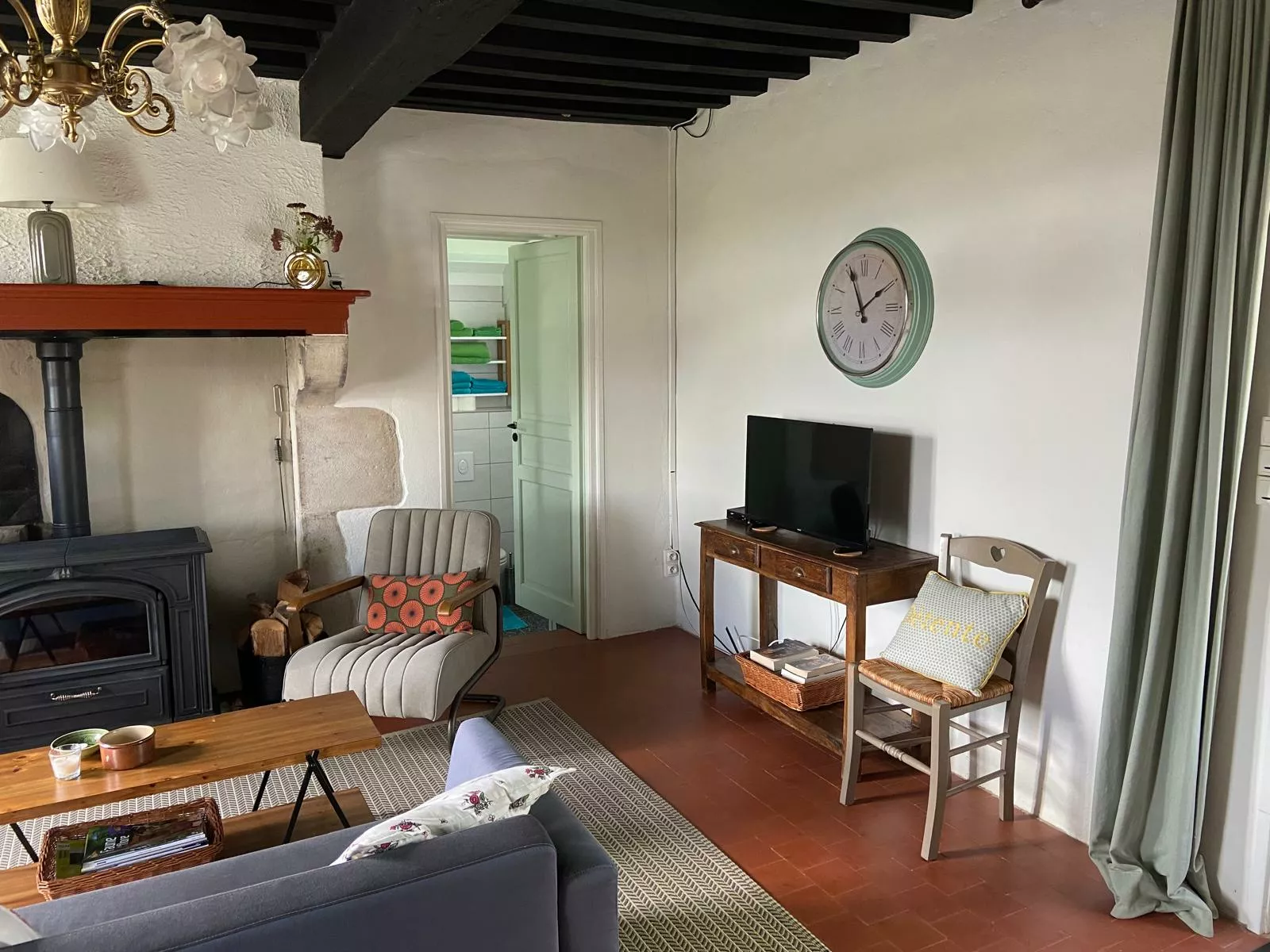 De slaapkamer is eveneens voorzien van een eikenhouten balkenplafond en tommettes.