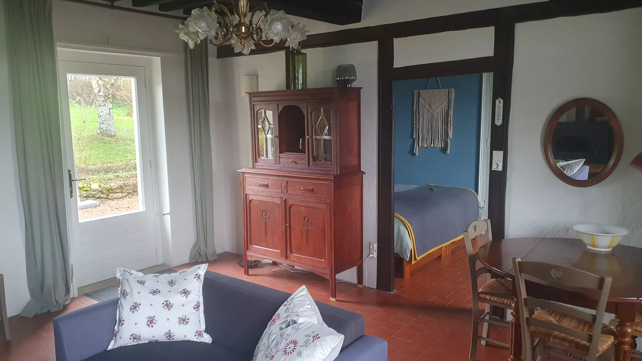 De woonkamer van dit knusse huisje is nog in originele staat van begin jaren 1900, met een zwaar eikenhouten balkenplafond en met streekeigen vloertommettes (tegeltjes).