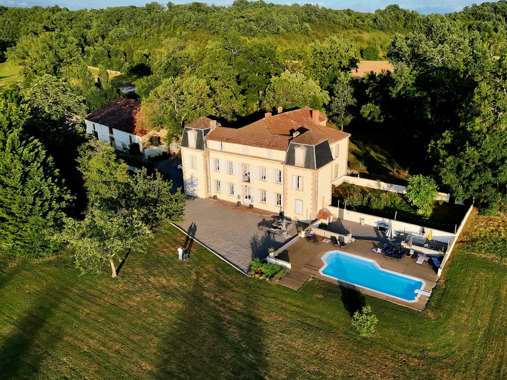 s Avonds geniet je van de laatste zonnestralen bij het zwembad, van verfrissende drankjes onder de feeërieke lichtjes aan de voorkant van het kasteel of luister je naar de natuur op de verhoogde terrassen voor de eetkamer en de grote salon. Maar iedereen wordt ongetwijfeld verliefd op de privéomgeving en de afzondering van het kasteel. We weten dat jij net zo zult genieten van deze idyllische omgeving als iedereen.