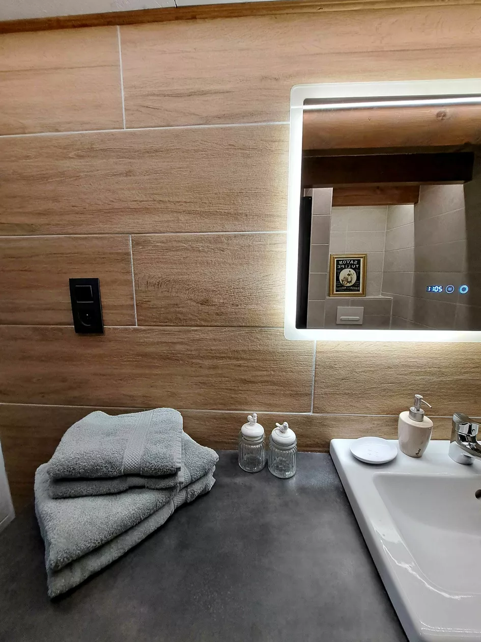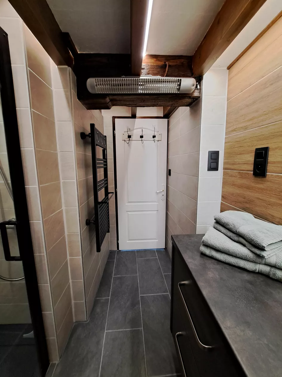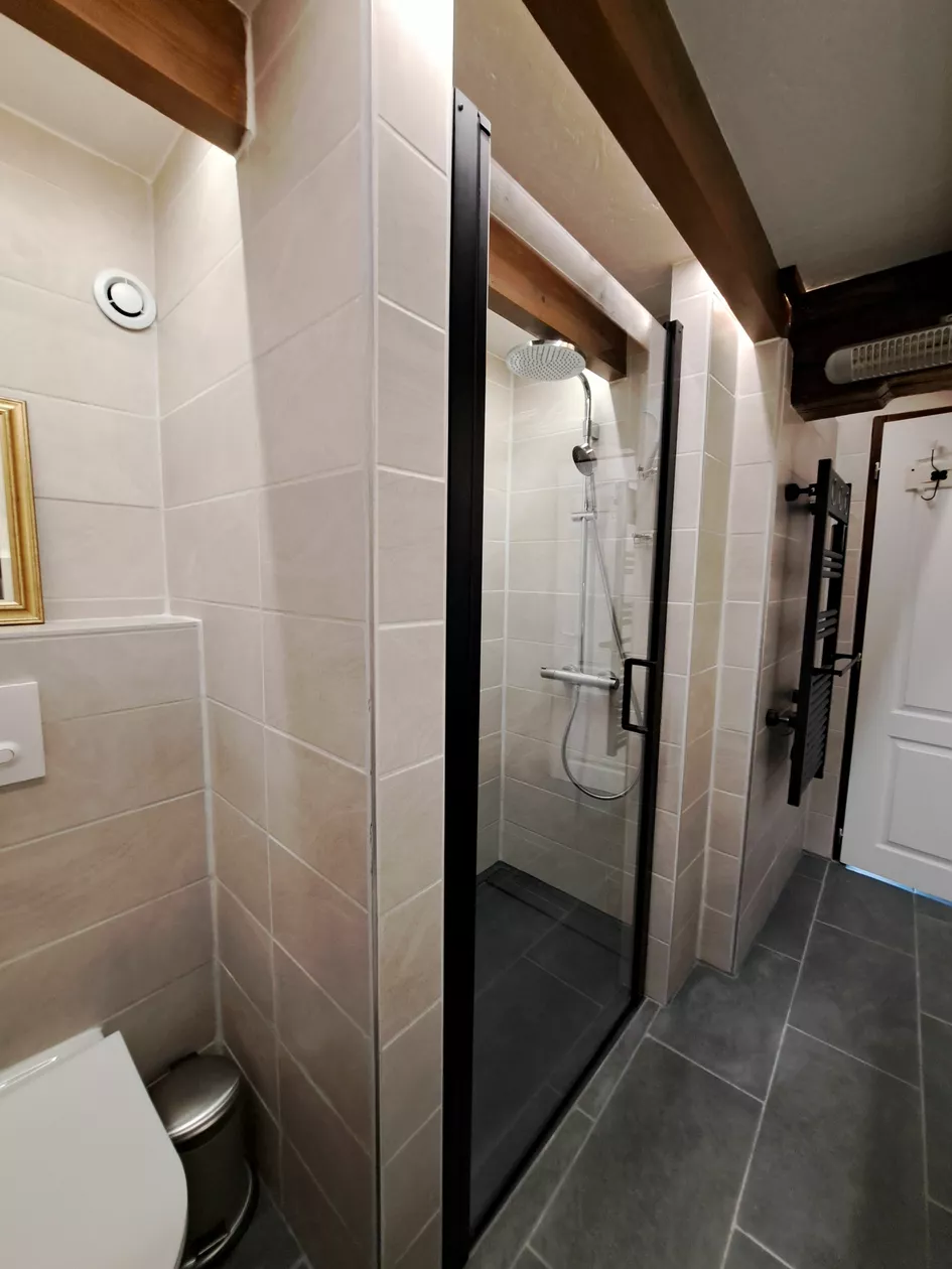 Er zijn 2 slaapkamers (1 bed 1.60 m x 2.00 m ,1 bed 1.60 m x 2.00 m) en1 mezzanine (1 bed 1.60 m x 2.00 m) en 2 badkamers, 1 op het gelijkvloers en 1 op de bovenverdieping met wastafel, douche en toilet. Wasmachine en droogkast ter beschikking.